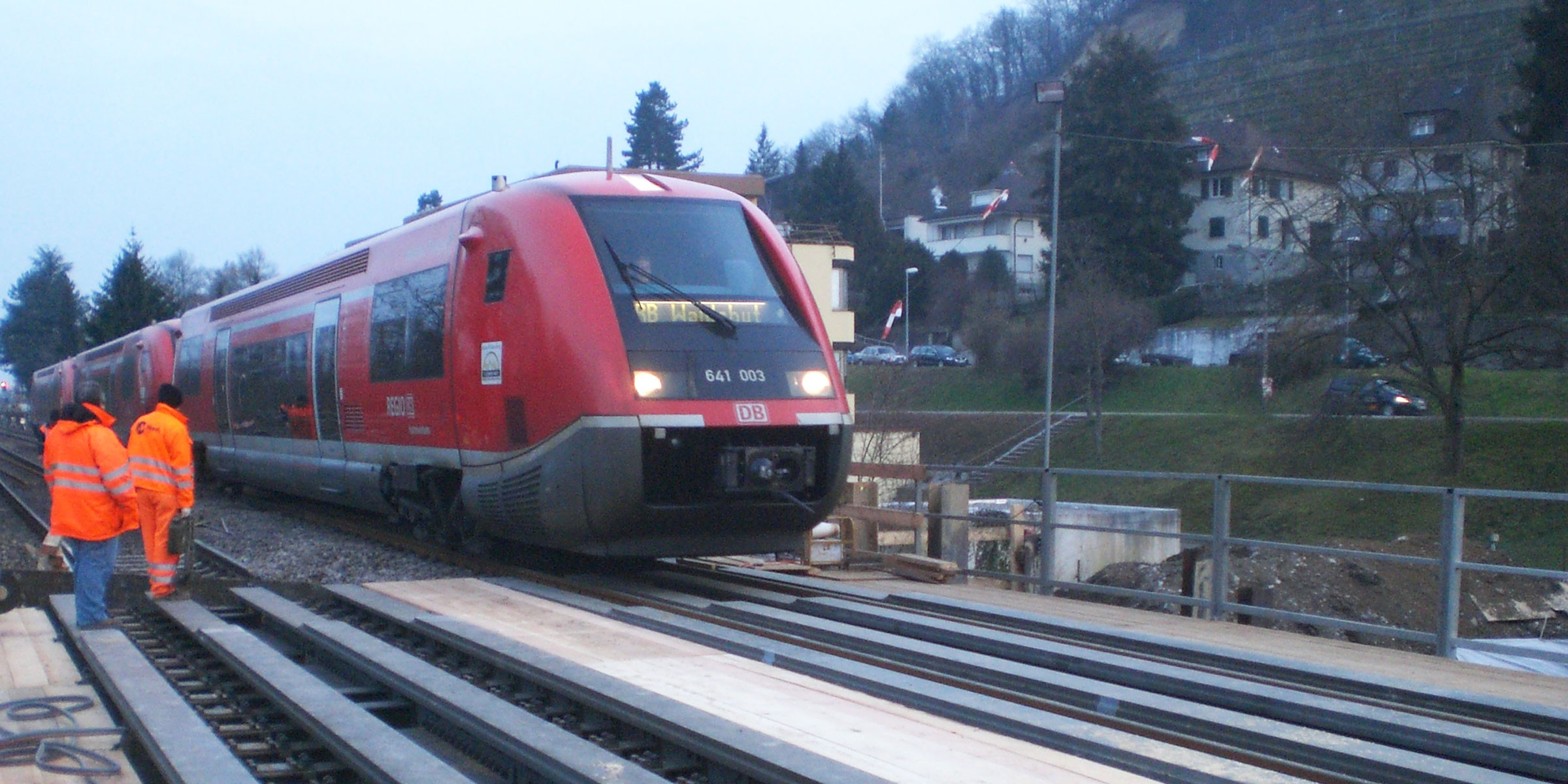 Überführung der DB-Strecke 4000 Basel - Konstanz i.Z. der Umgehung Grenzach-Wyhlen. Geschlossener Stahlbetonrahmen mit gevouteter Rahmendecke. Herstellung des Rahmen- bauwerks in Seitenlage mit anschließendem Querverschub unter Hilfsbrücke.