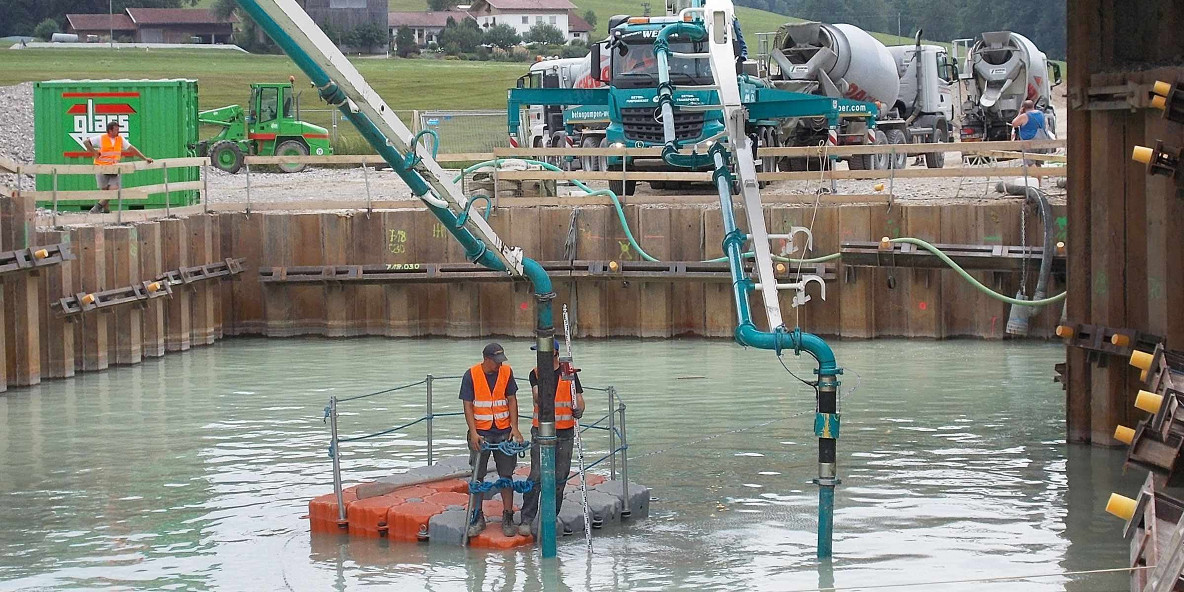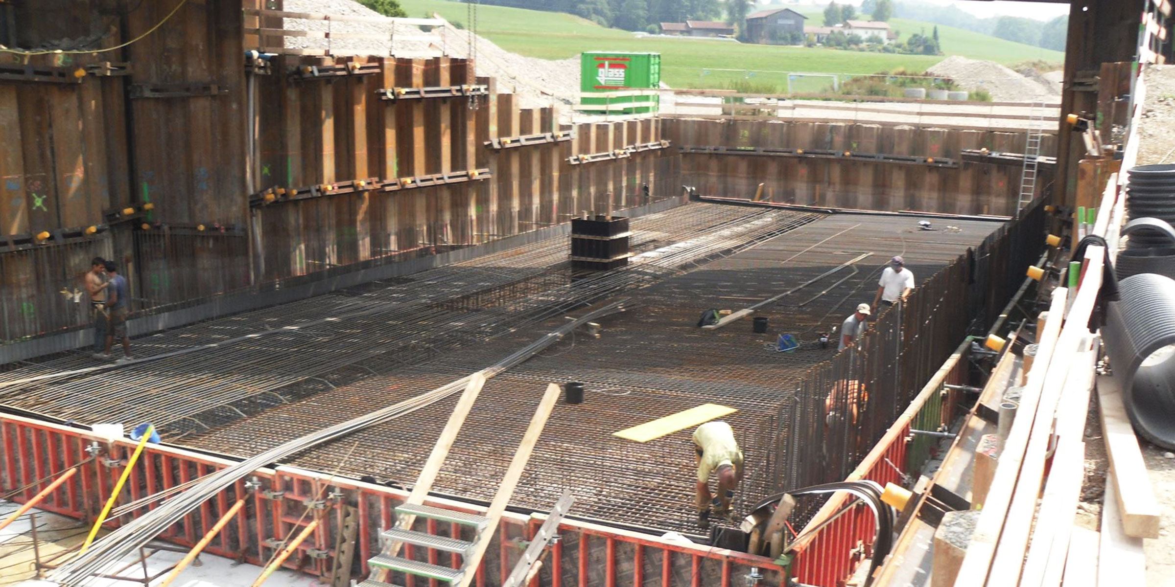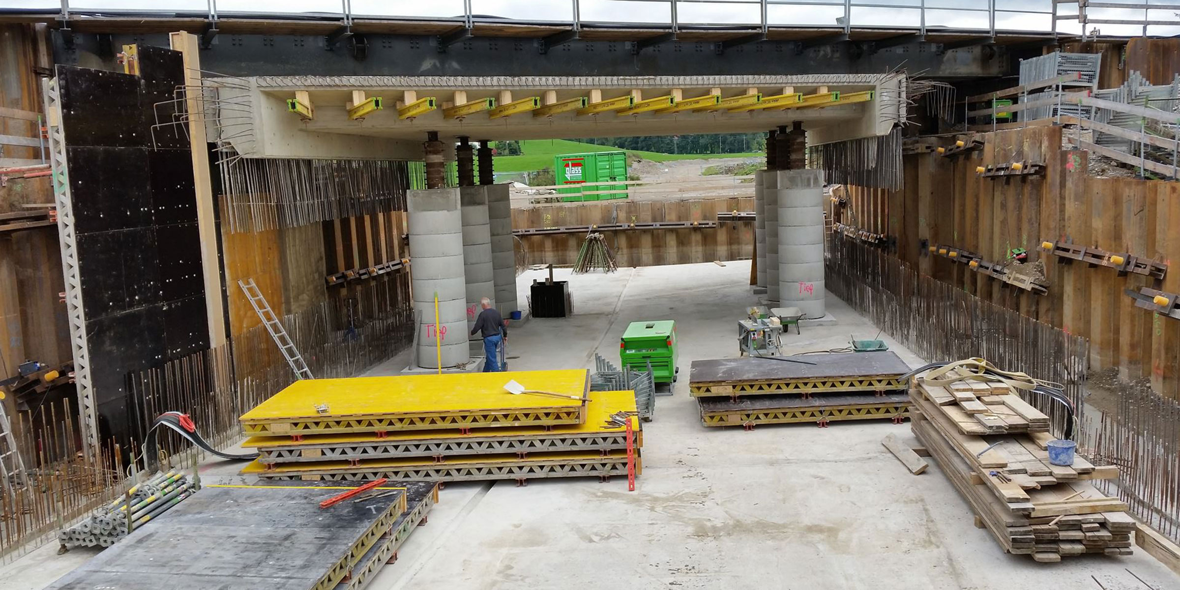 Überführung der DB-Strecke 5362 Buchloe – Lindau über die OA23 in Minderbetzigau. Geschlossener Stahlbetonrahmen mit anschließenden Trogbauwerken. Herstellung der Rahmen- decke in Tieflage unter Hilfsbrücken. Anheben des Überbaus in Endlage um ca. 1,00m.