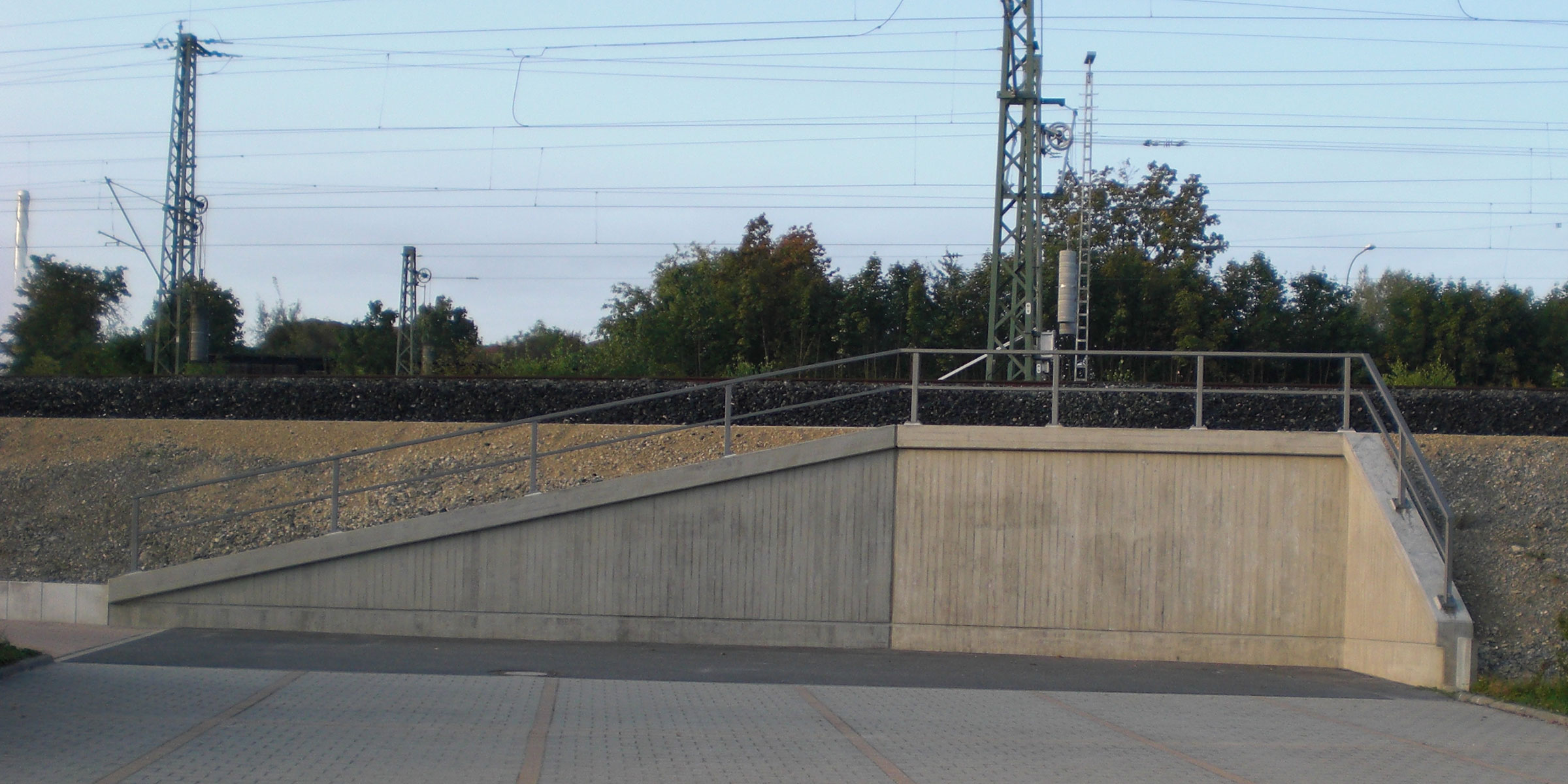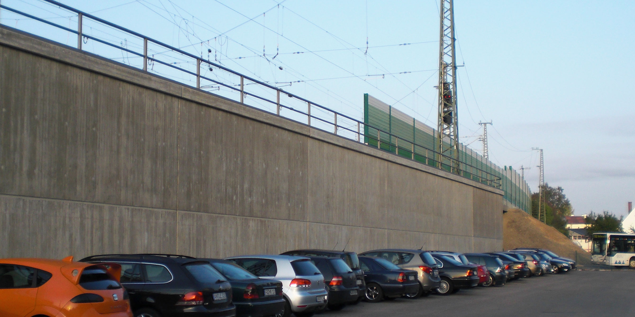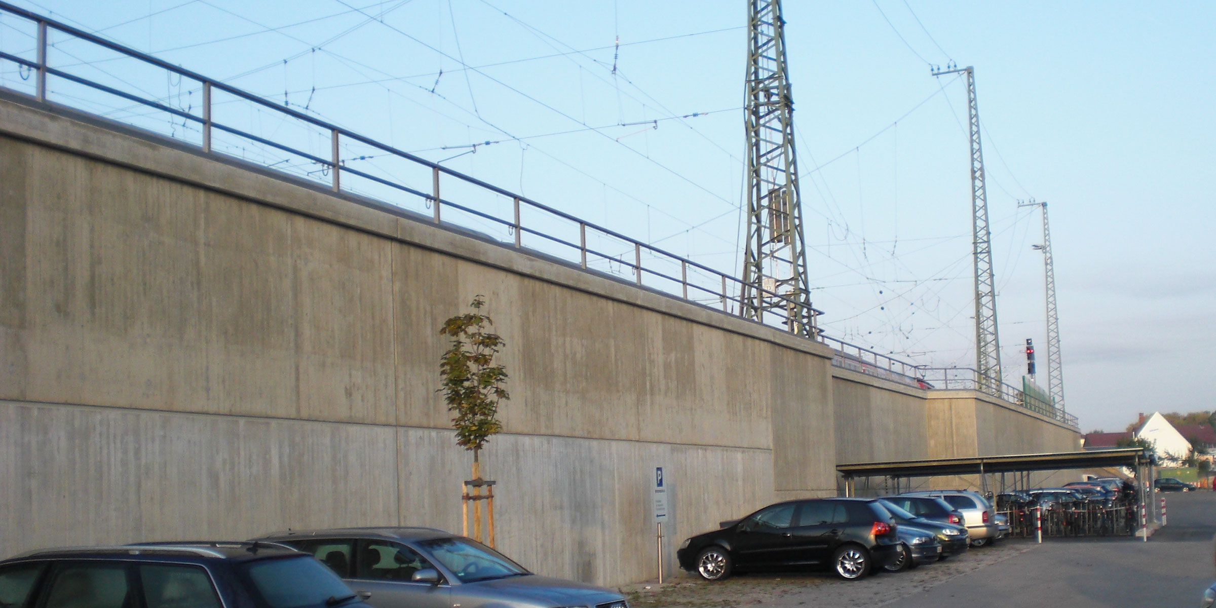 Überführung der DB-Strecke 5902 Nürnberg – Ansbach am Bahnhof in Ansbach. Verbreiterung der bestehenden EÜ als offener Stahlbetonrahmen auf Bohrpfahlgründung. Neubau der anschließenden Stützwänden (Pfahlgründung) auf eine Länge von ca. 250m.