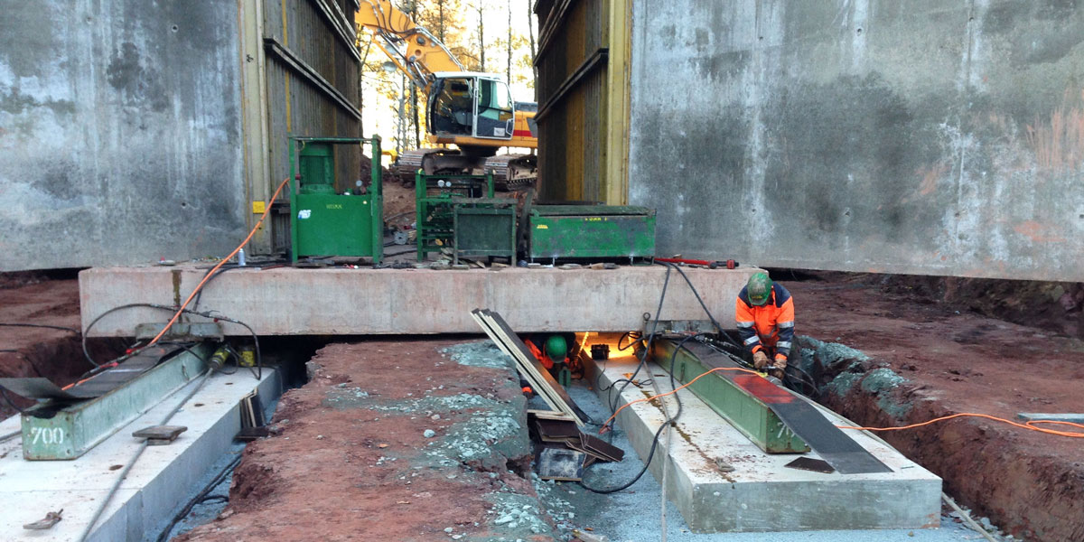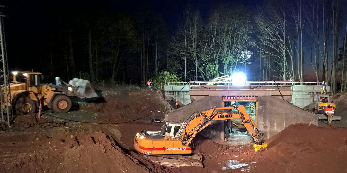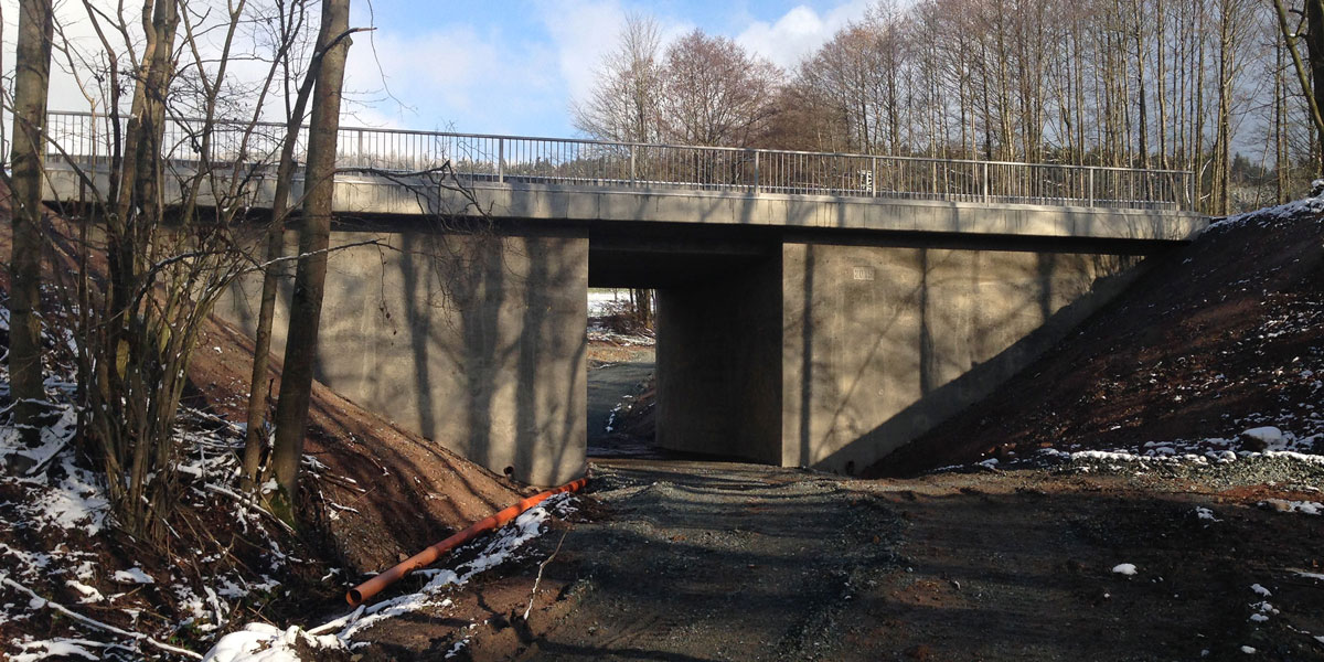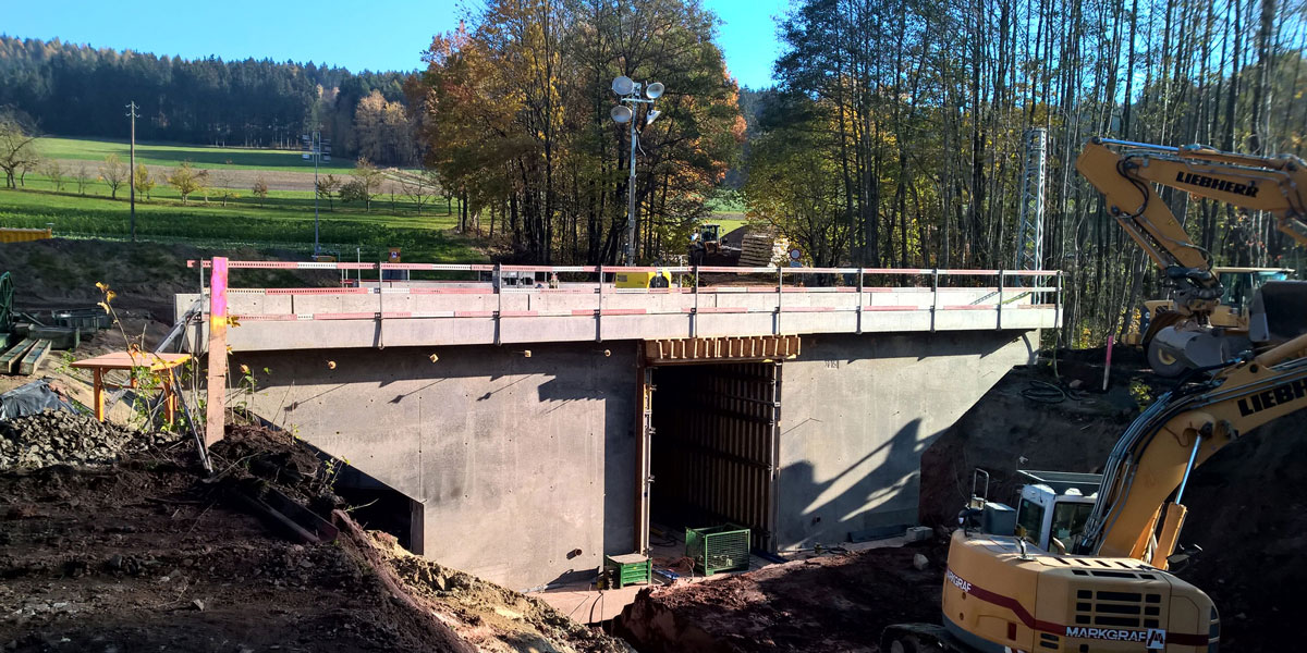 Überführung der DB-Strecke 5309 Nürnberg – Schirnding über Wirtschaftsweg in Lenau. Geschlossener Stahlbetonrahmen (Standardrahmen nach Ril 804.9040). Herstellung des Rahmenbauwerks in Seitenlage mit anschließendem Querverschub in einer Sperrpause.