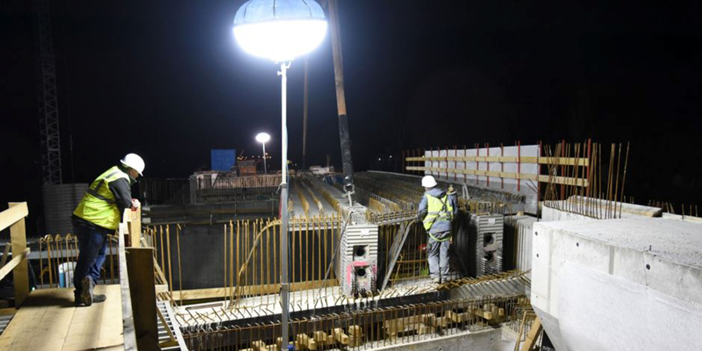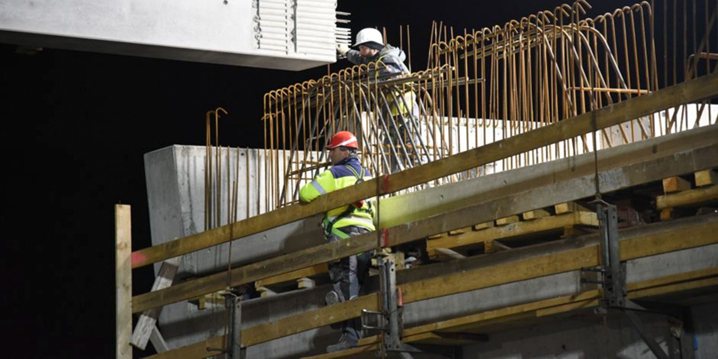 Fertigteilkonstruktion mit Ortbetonergänzung. Vorspannung mit Spannbett und Kontikabel.