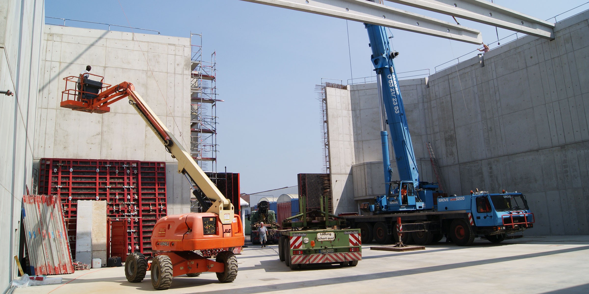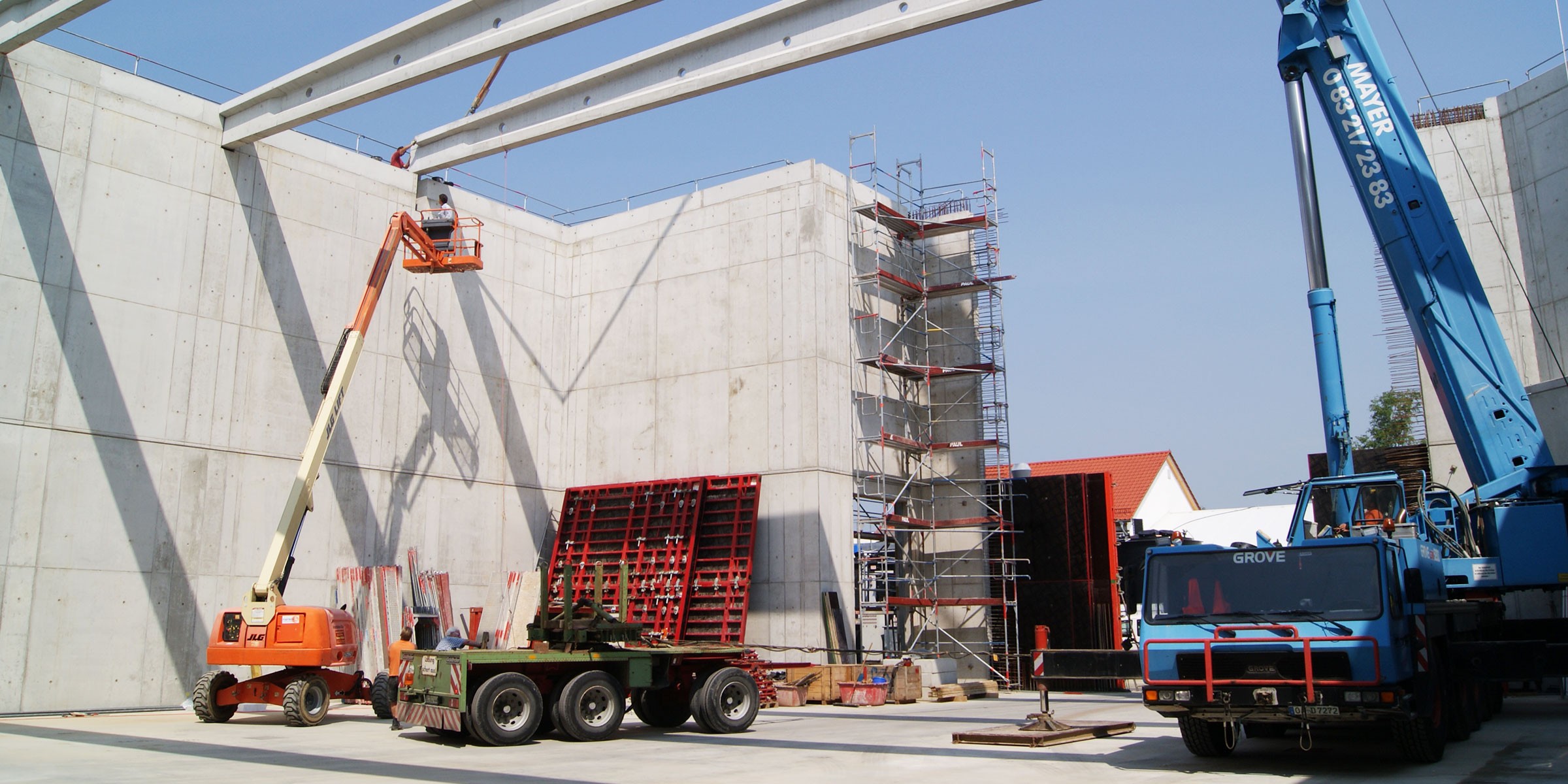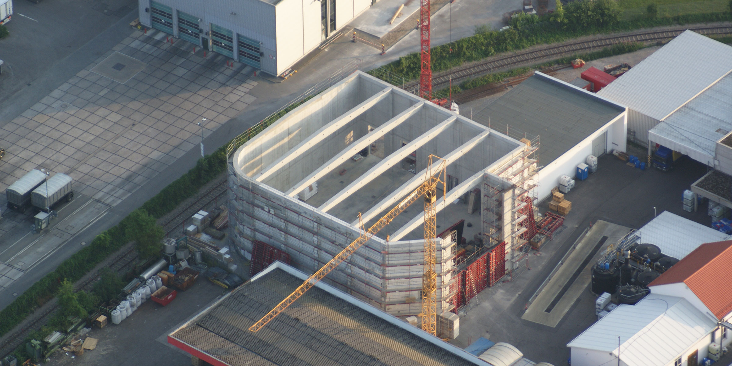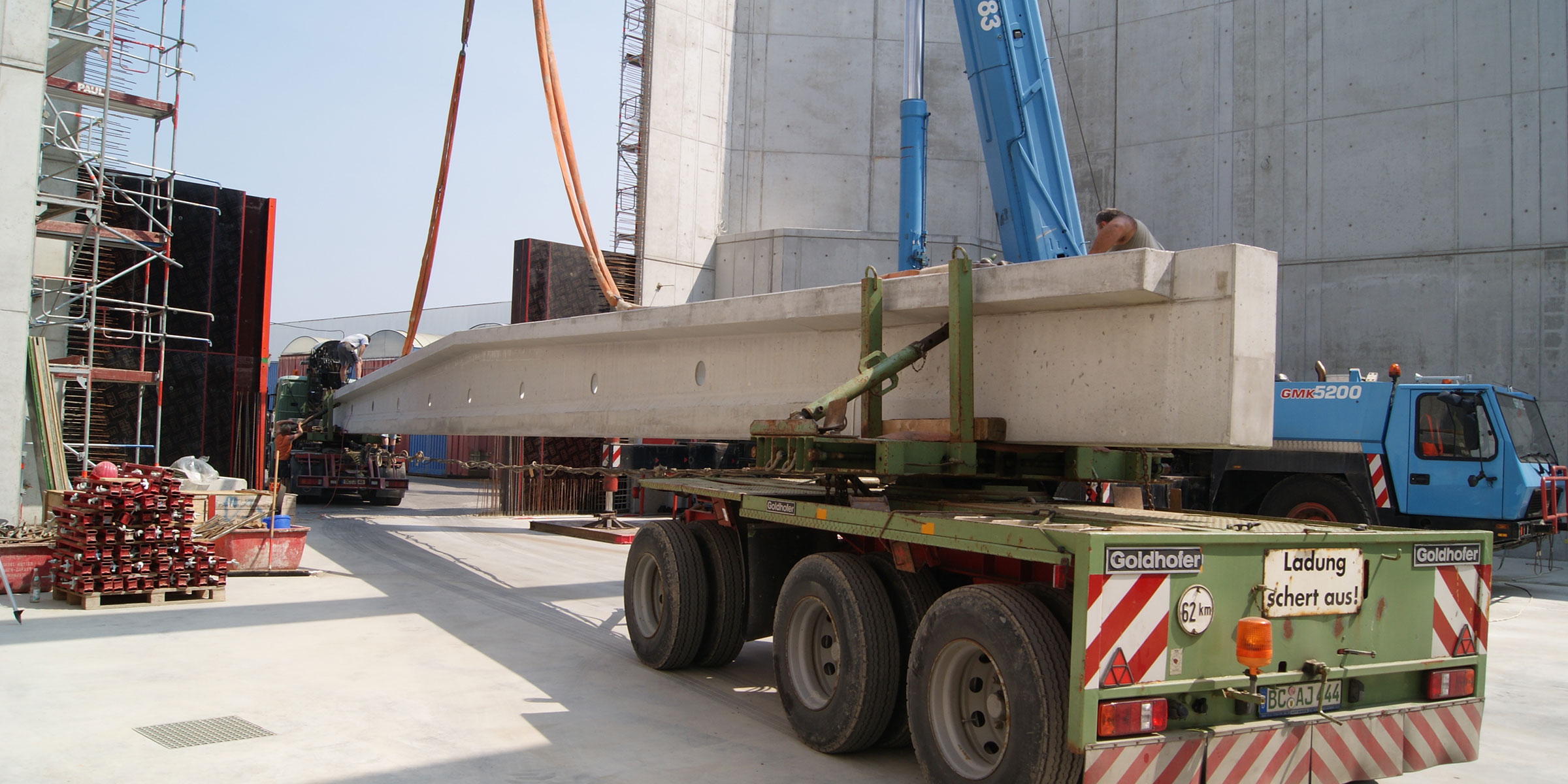 Neubau einer Hochregallagerhalle in Memmingen. Das eingeschossige Gebäude wurde gemäß den Anforderungen des Bauherrn in konventioneller Massivbauweise ohne Stützen errichtet. Dachträger als Fertigteil-Spannbeton-Binder mit einer Stützweite von 29,0m.