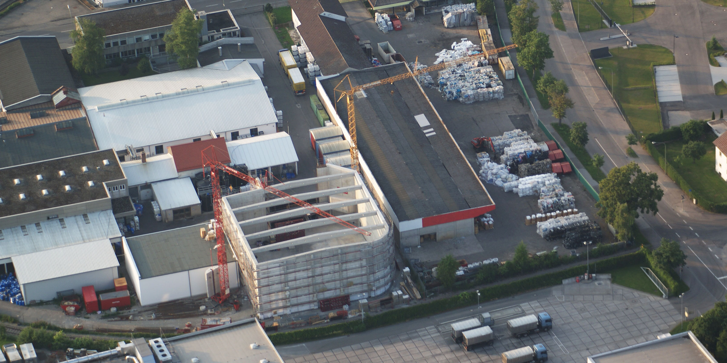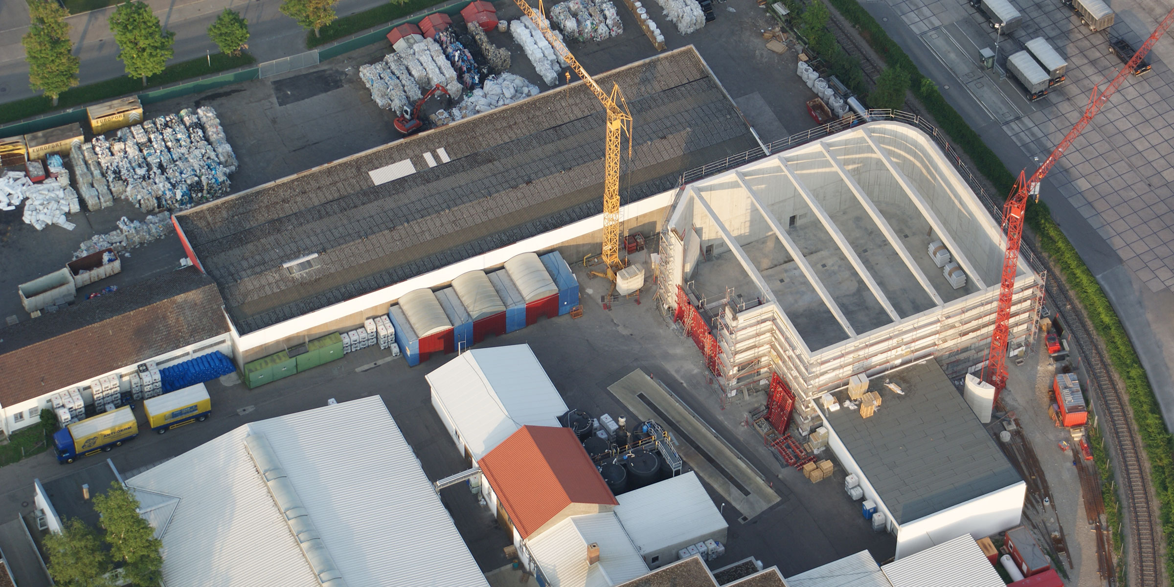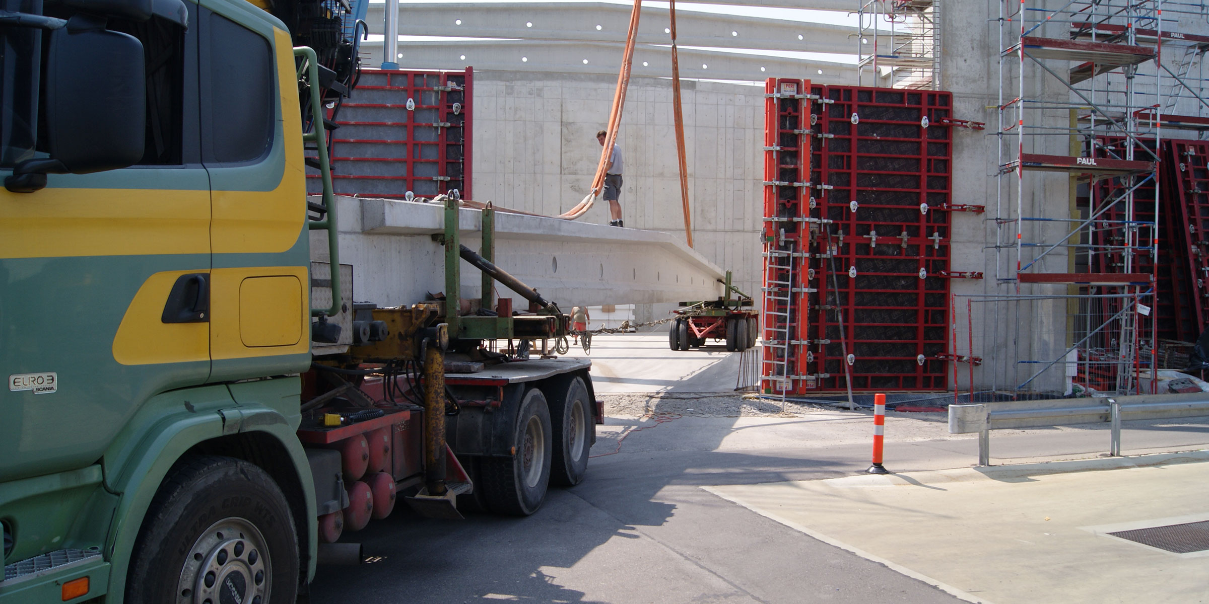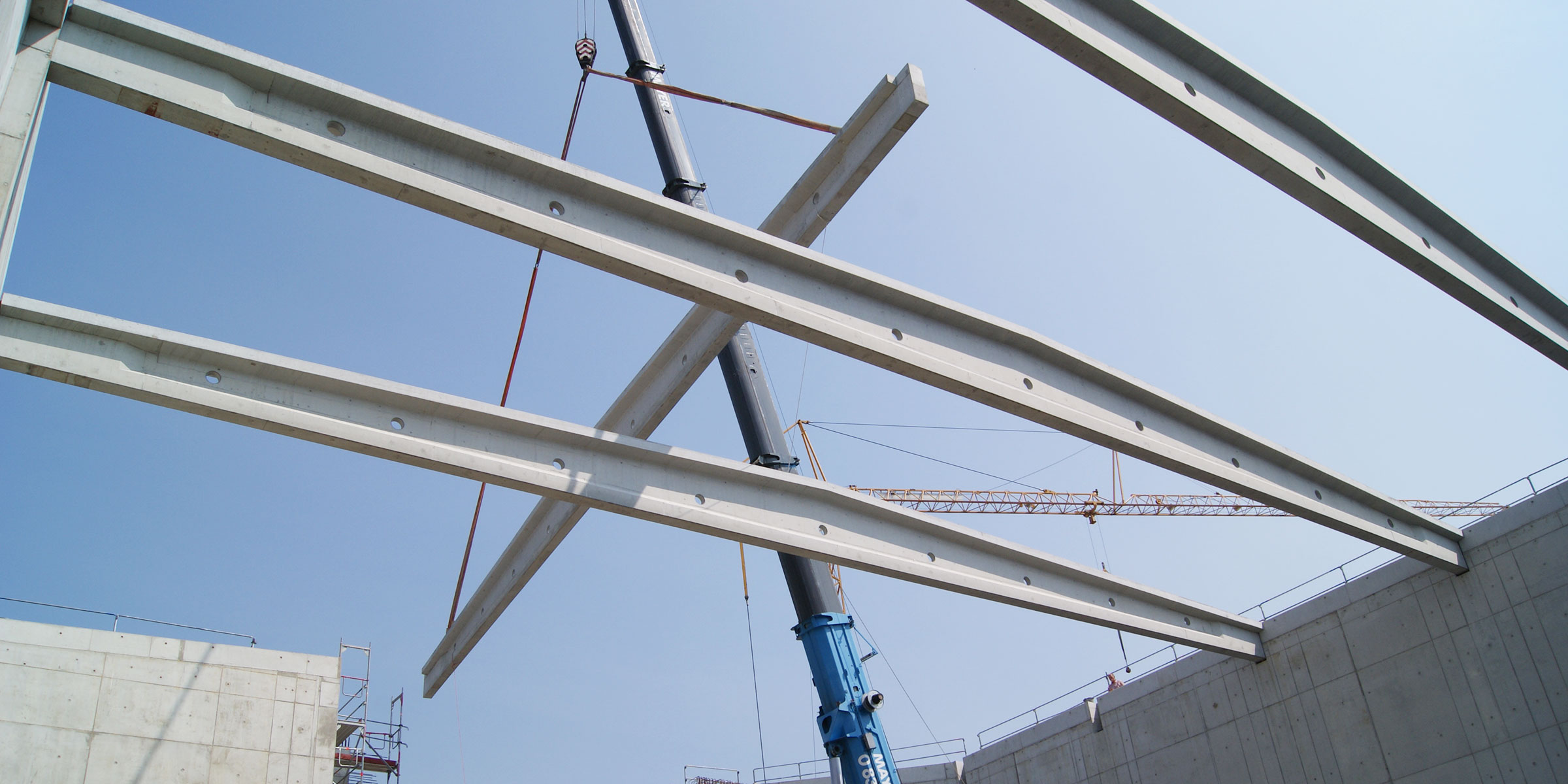 Neubau einer Hochregallagerhalle in Memmingen. Das eingeschossige Gebäude wurde gemäß den Anforderungen des Bauherrn in konventioneller Massivbauweise ohne Stützen errichtet. Dachträger als Fertigteil-Spannbeton-Binder mit einer Stützweite von 29,0m.
