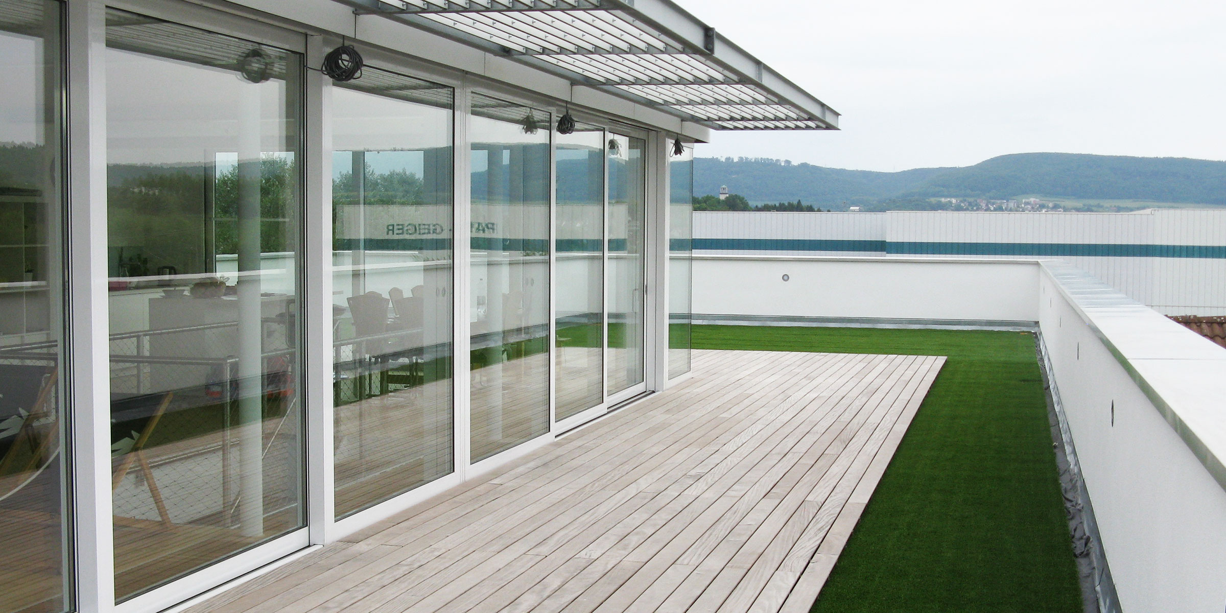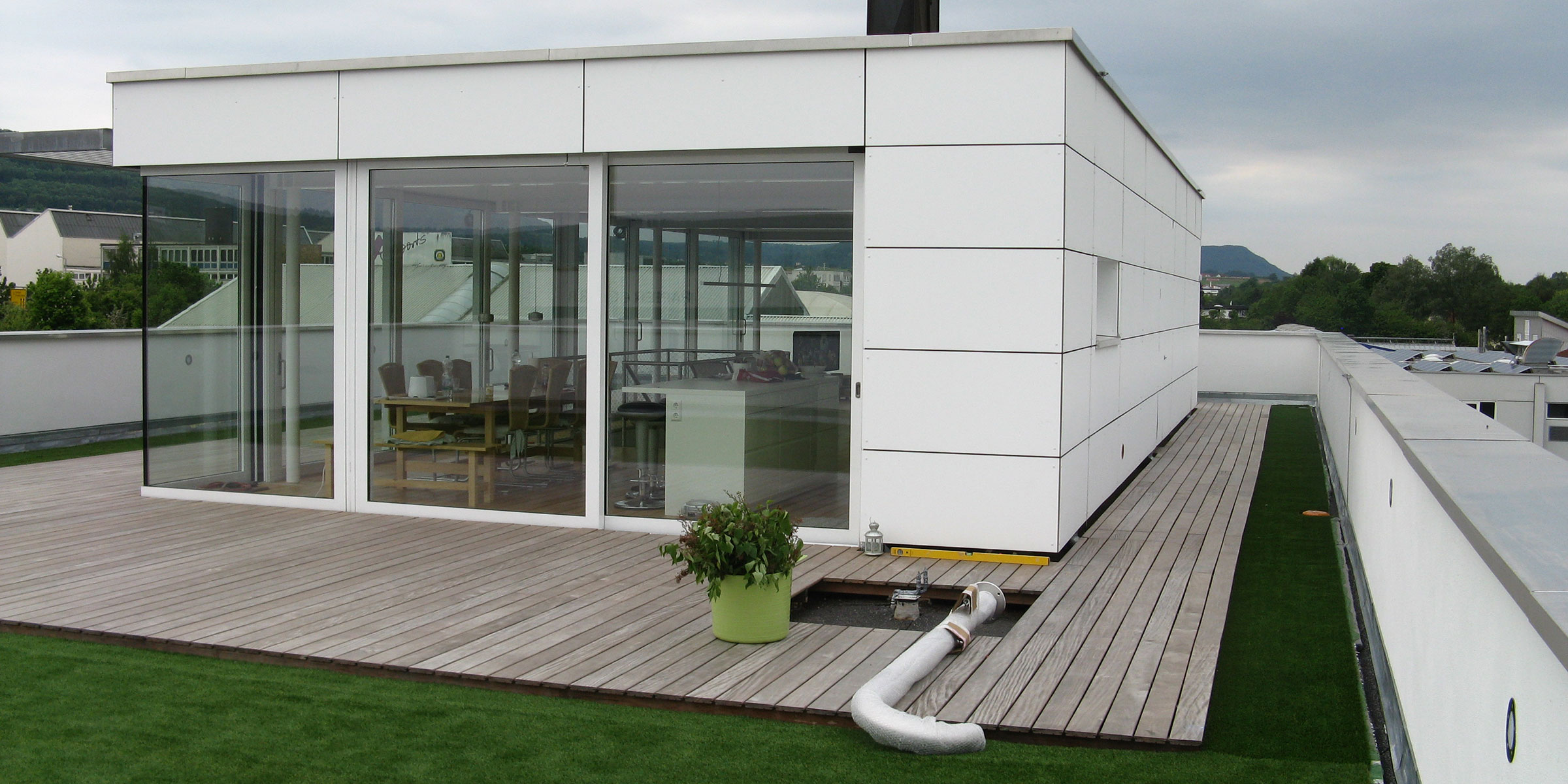 Der Neubau umfasst die Aufstockung des bestehenden Bürogebäudes um ein zusätzliches Vollgeschoss sowie ein Dachgeschoss mit Dachterrasse und Penthouse.
