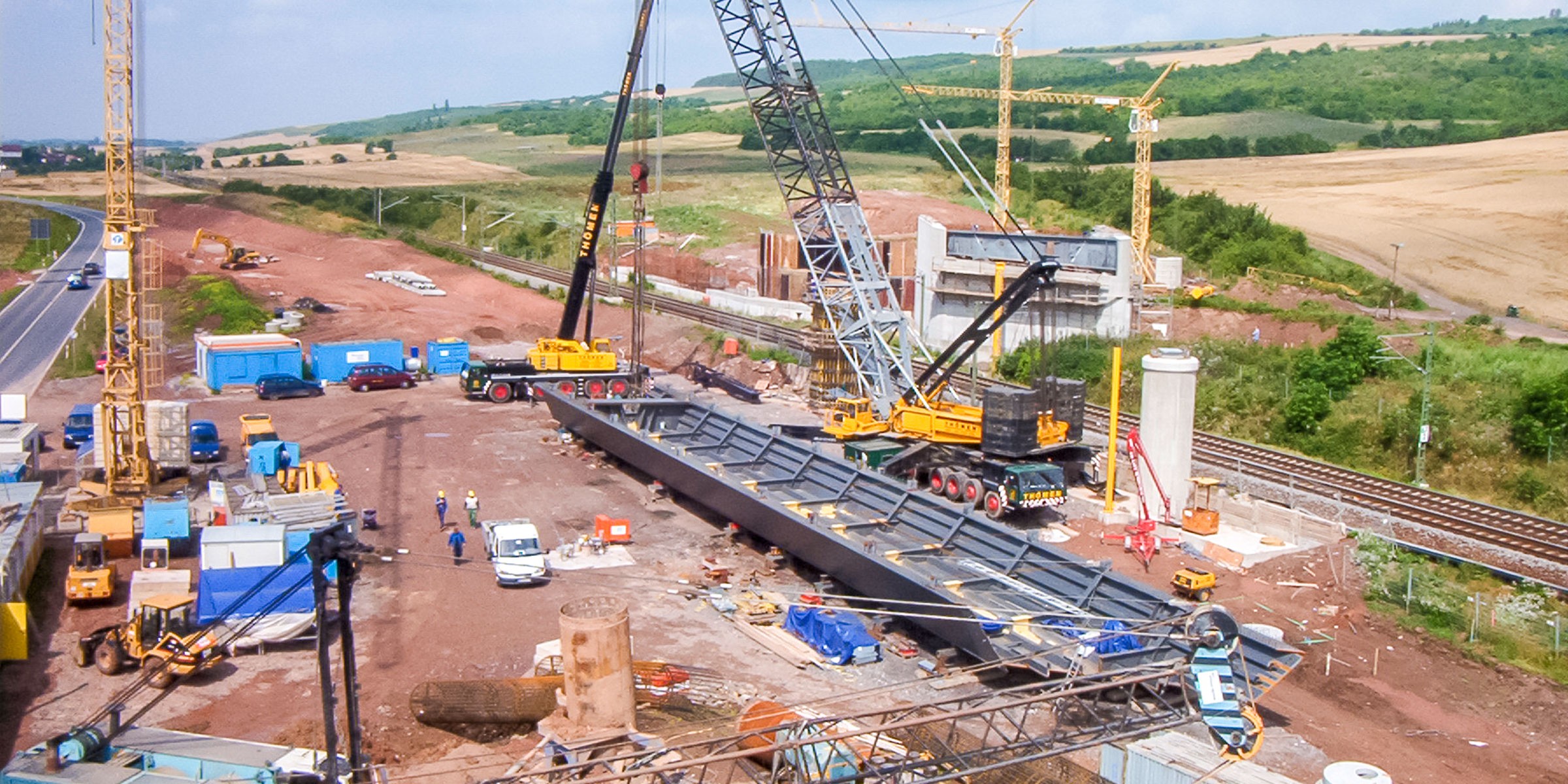 Herstellung der Fahrbahnplatte im Pilgerschrittverfahren. Zwei getrennte Überbauten.