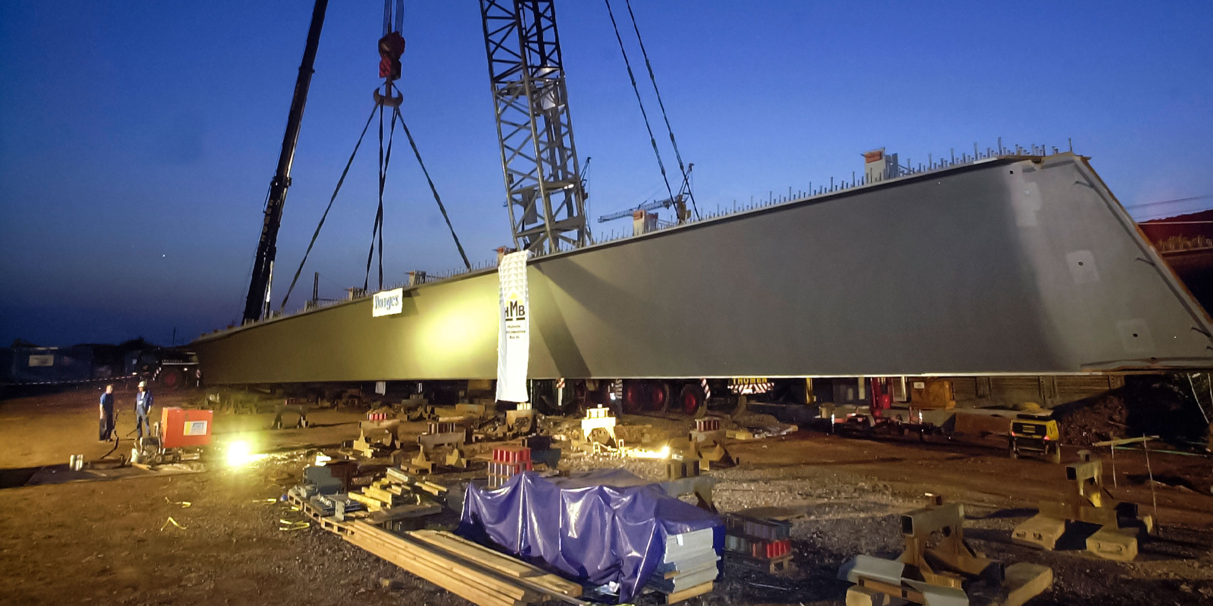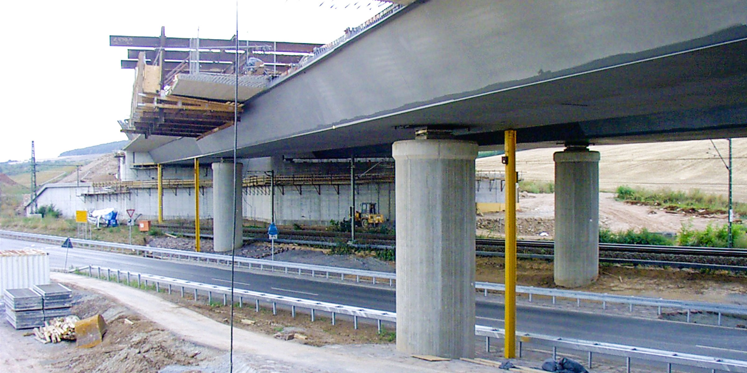Stahlverbundhohlkastenbrücke über 3 Felder mit schiefer Lagerung.