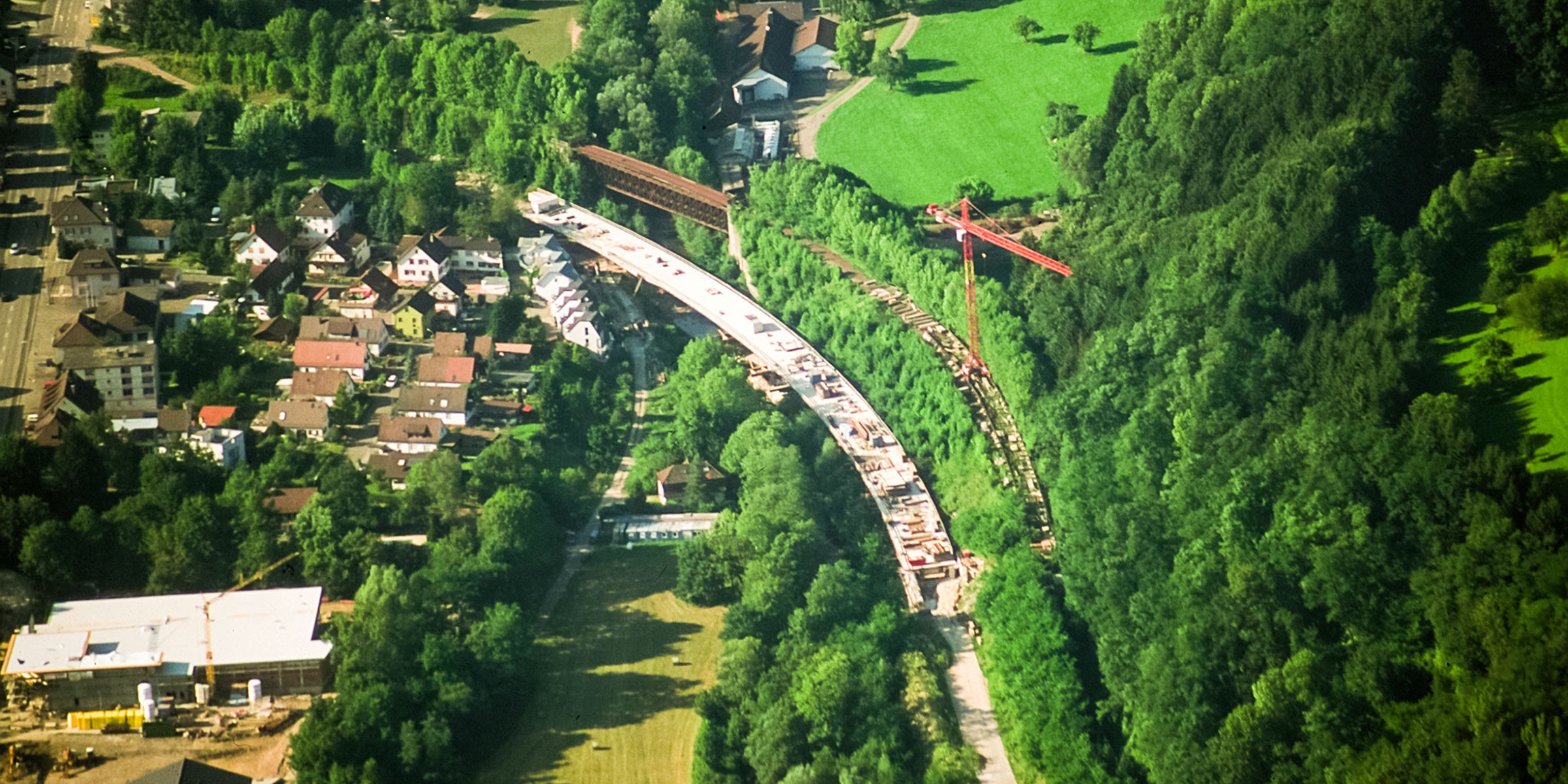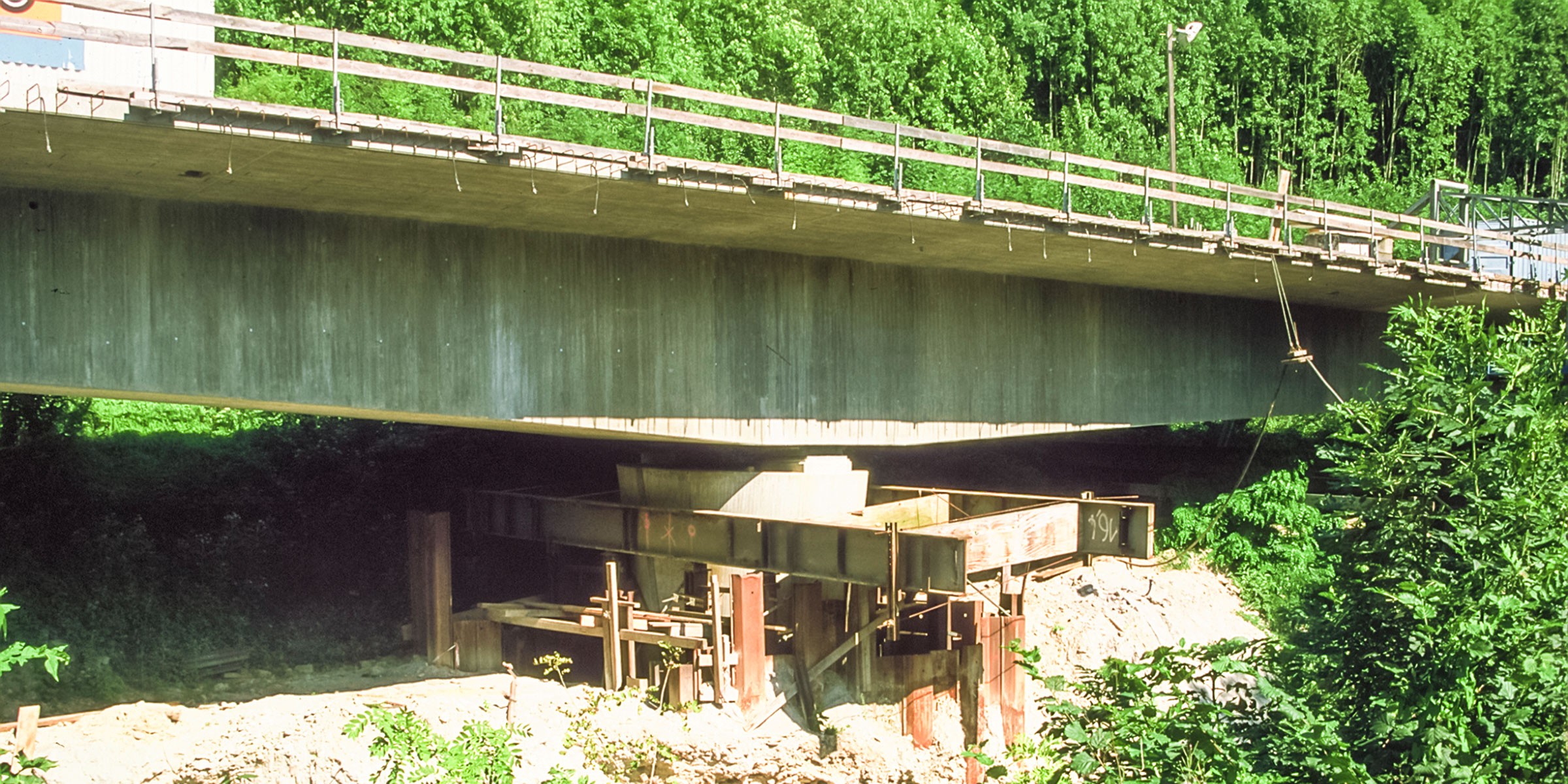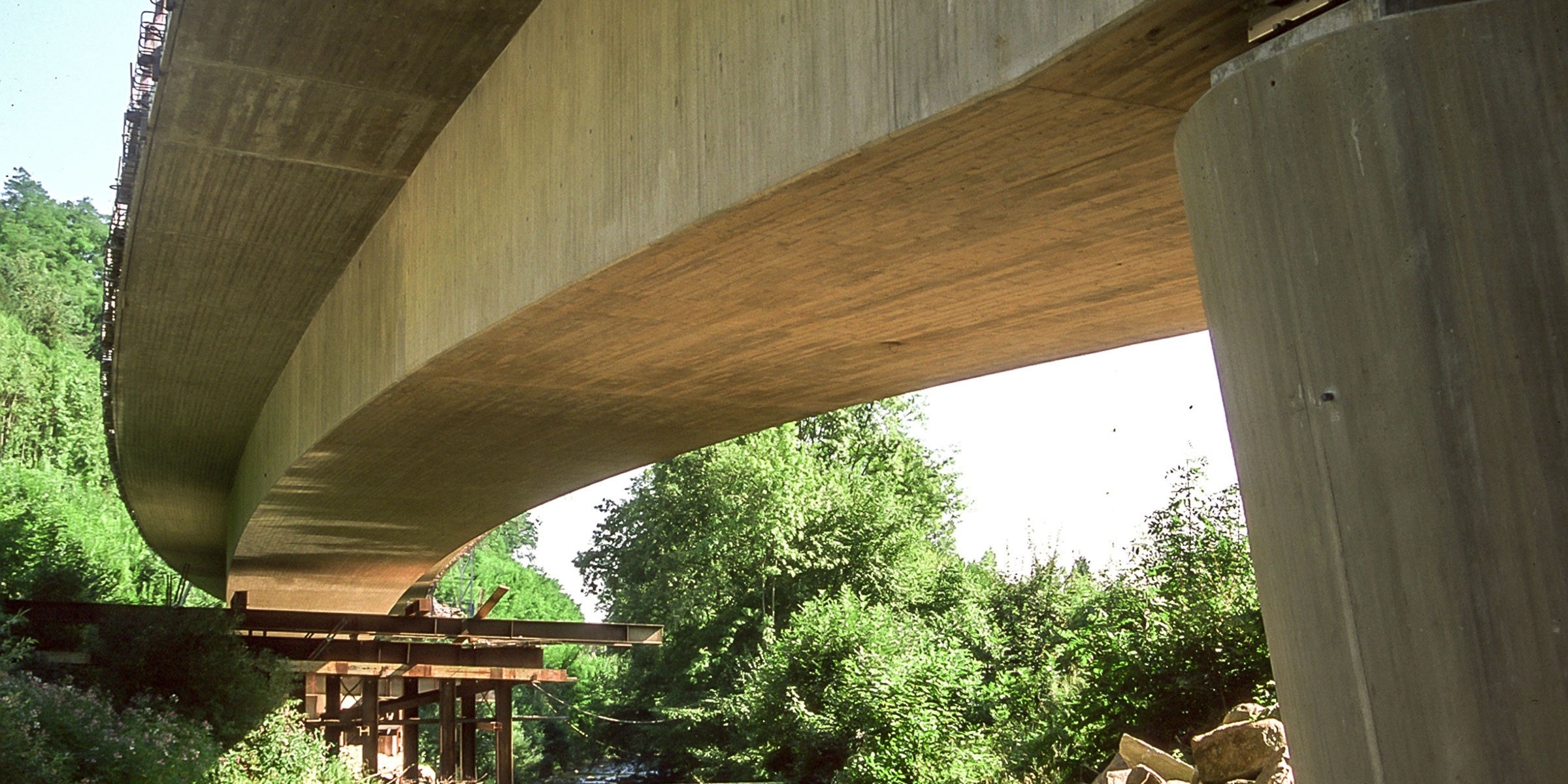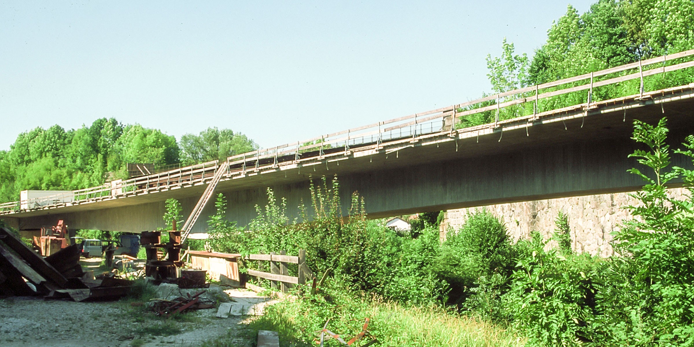 Hohlkastenbrücke als längs und quer vorgespannter Durchlaufträger mit veränderlicher Bauhöhe. 2-stegiger längs und quer vorgespannter Plattenbalken.