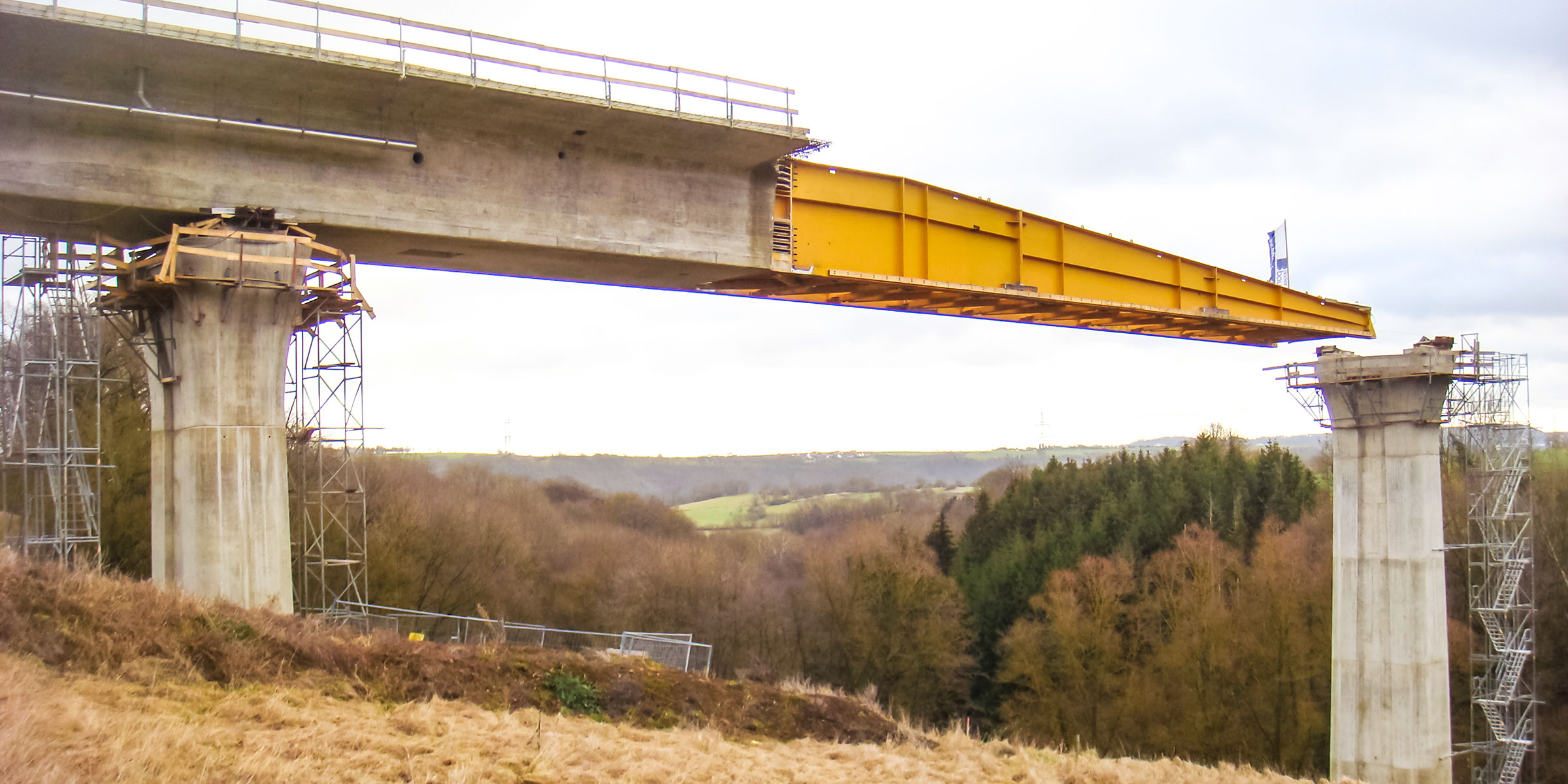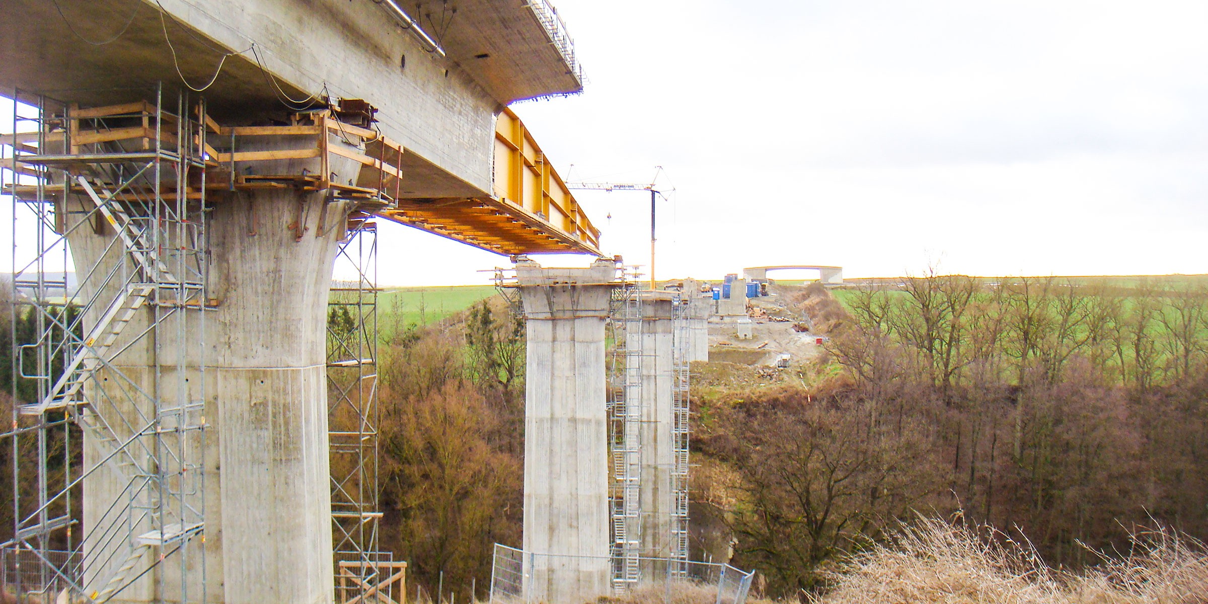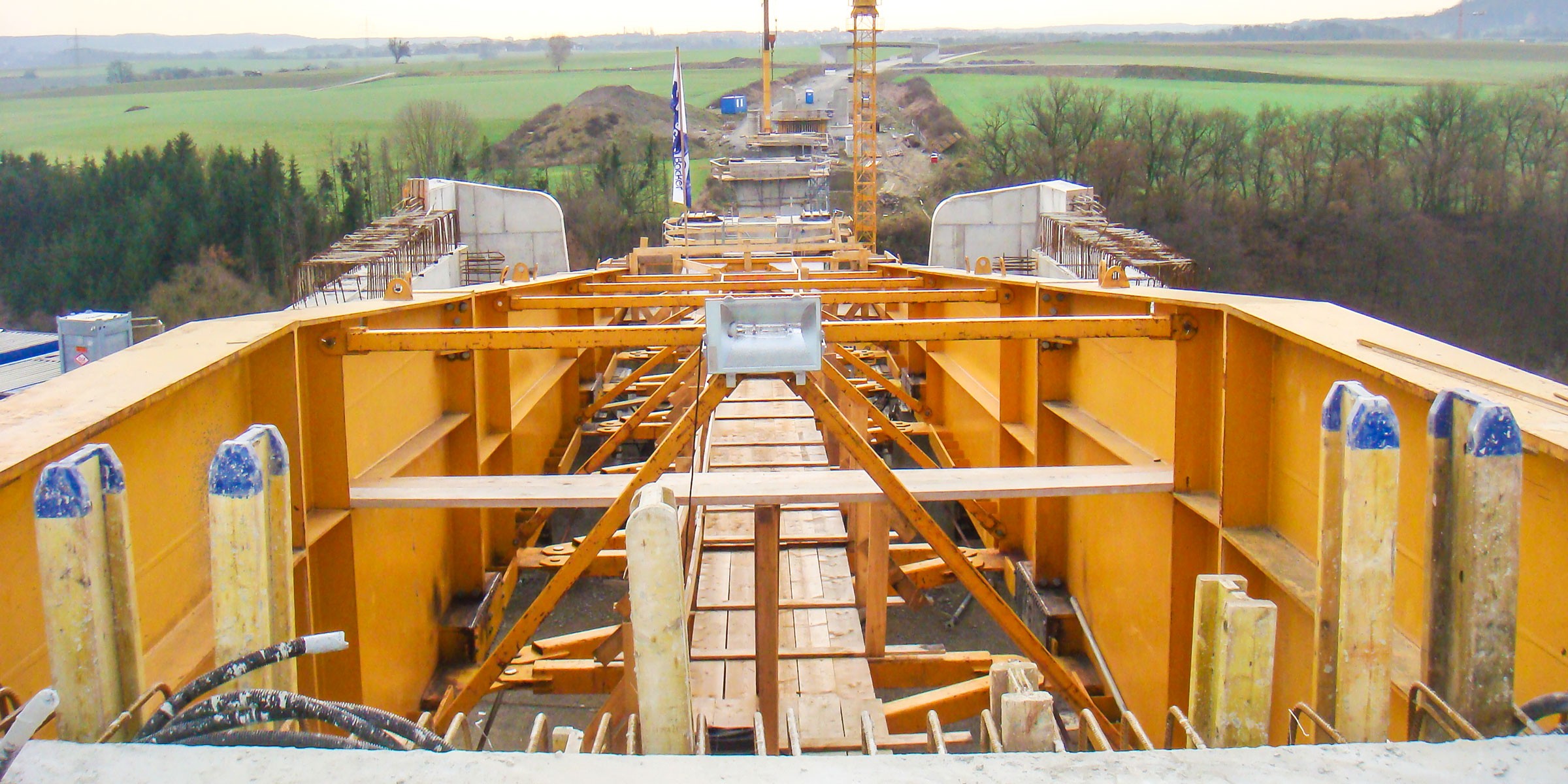 Überführung der K2576 über den Gailenkircher Bach bei Schwäbisch Hall. Hohlkastenbrücke als vorgespannter Durchlaufträger in Mischbauweise. Herstellung im Taktschiebeverfahren mit 9 Einzeltakten.