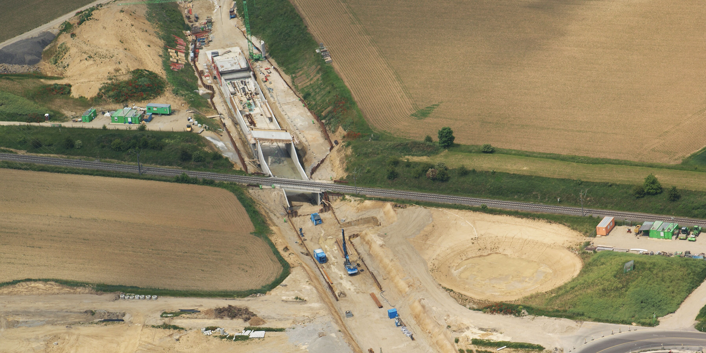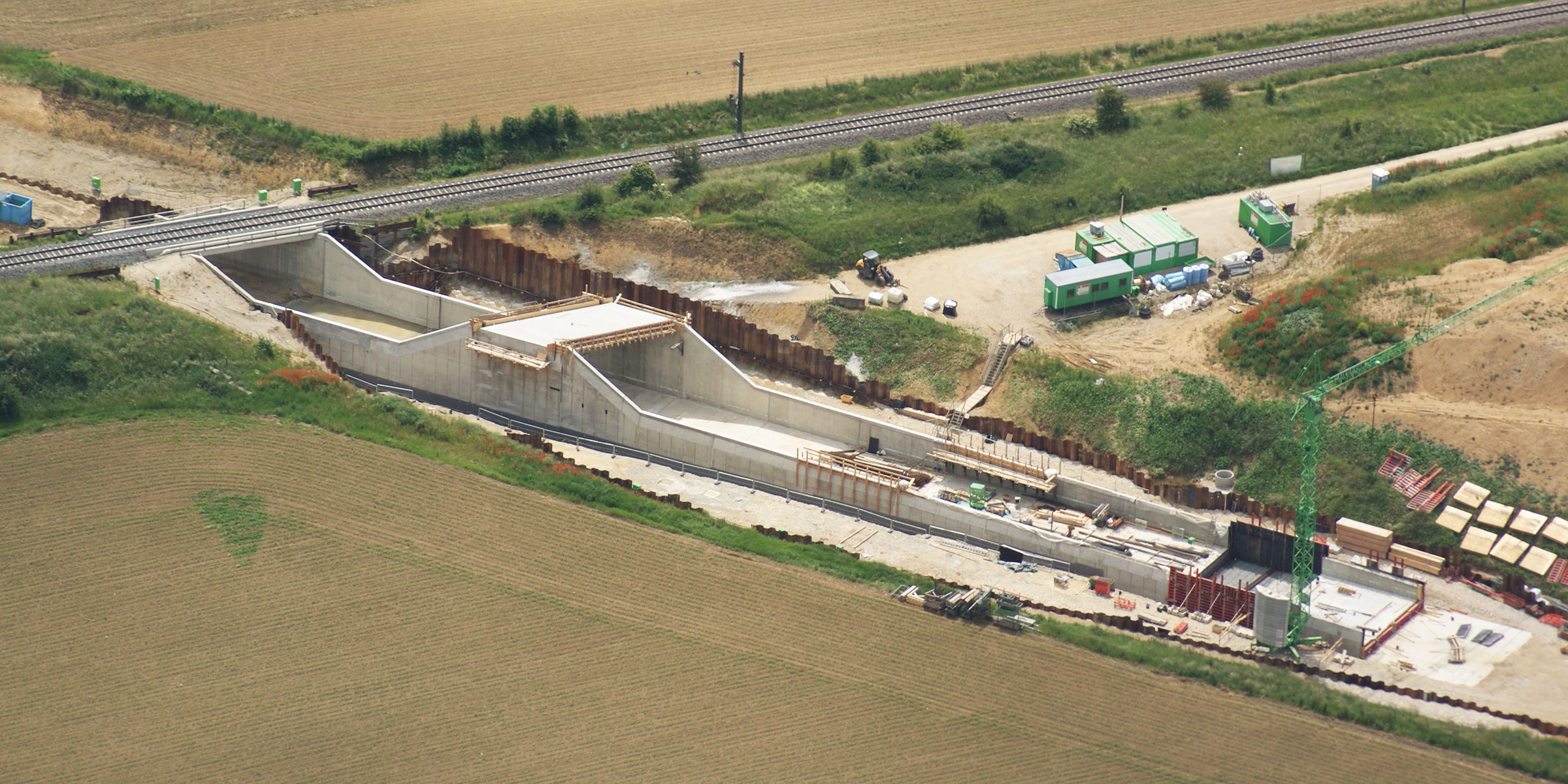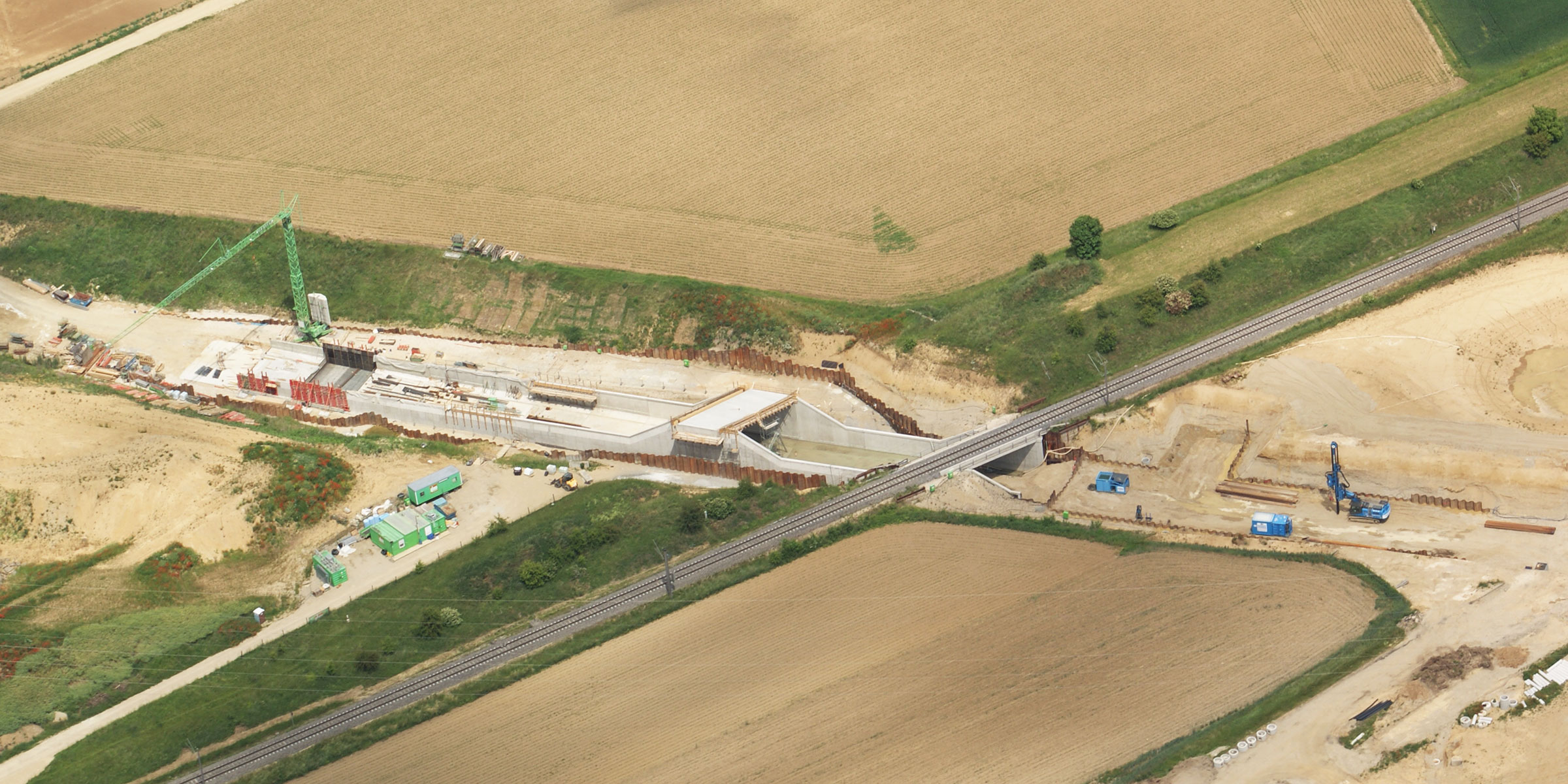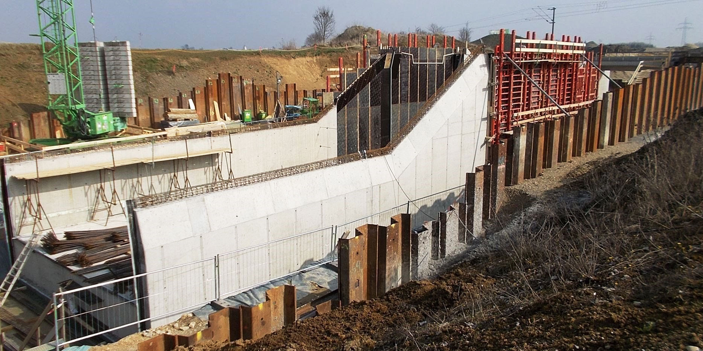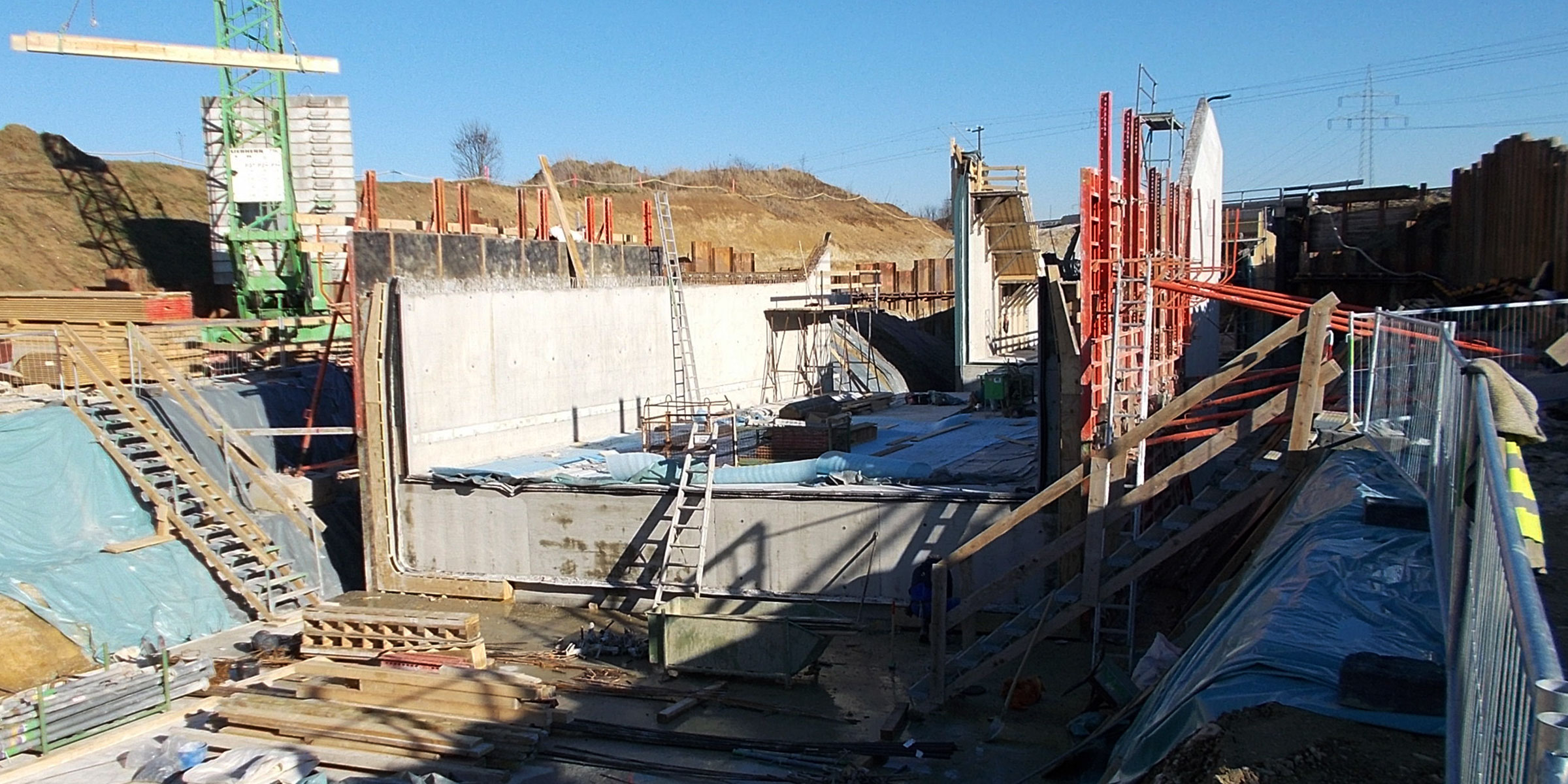 Unterführung der B16neu unter DB-Strecke 5381 Ingolstadt – Neuoffingen bei Dillingen. Trogquerschnitt mit 2 integrierten Überführungsbauwerken (BW8-2 / BW8-4). Abschnittsweise Herstellung in 30 Einzelblöcken und seitlich angegliederten Pumpwerk.