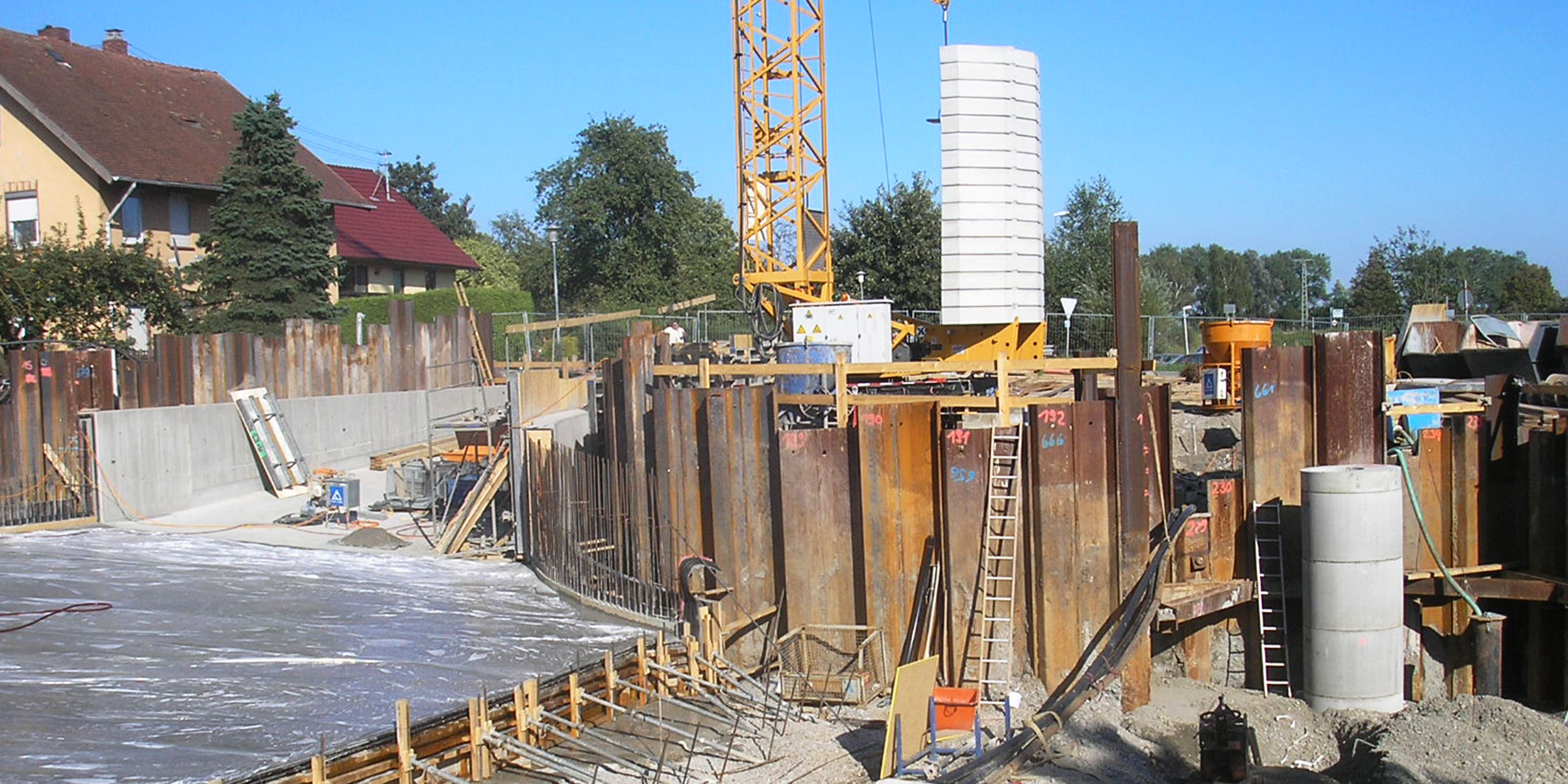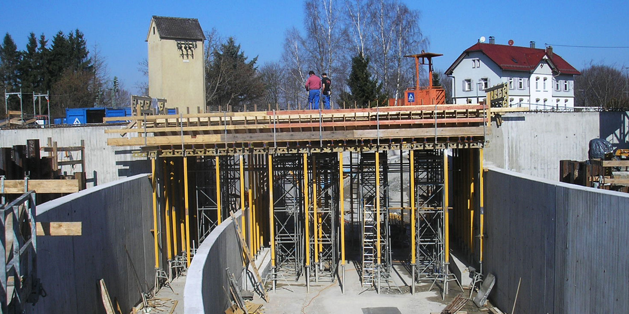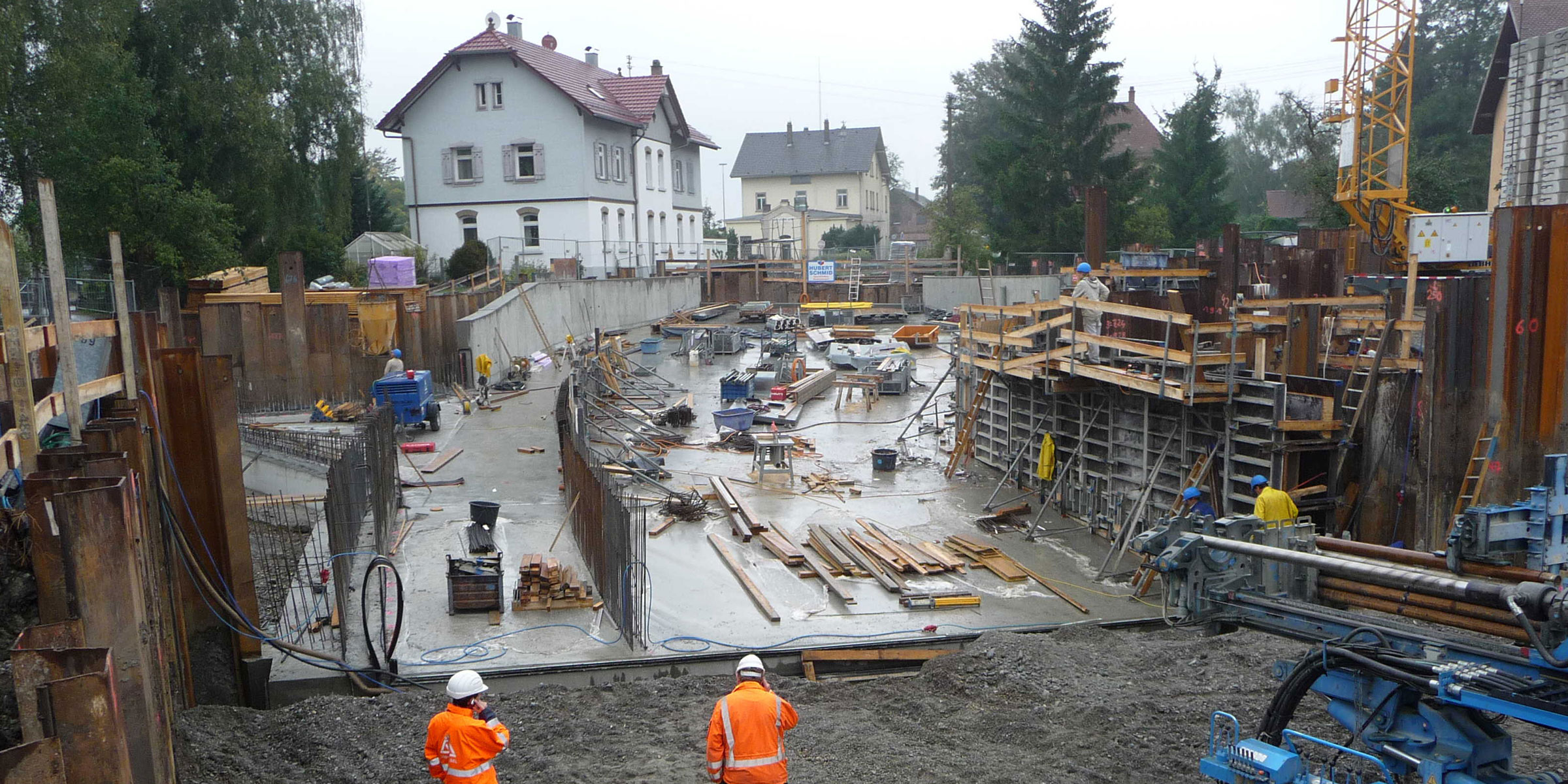 Unterführung Zufahrt Bahnhof unter DB-Strecke 4510 Laupheim West – Schwendi in Laupheim. Trogquerschnitt mit integriertem Überführungsbauwerk (EÜ Südkurve). Abschnittsweise Herstellung in 24 Einzelblöcken und seitlich angegliederten Pumpwerk.