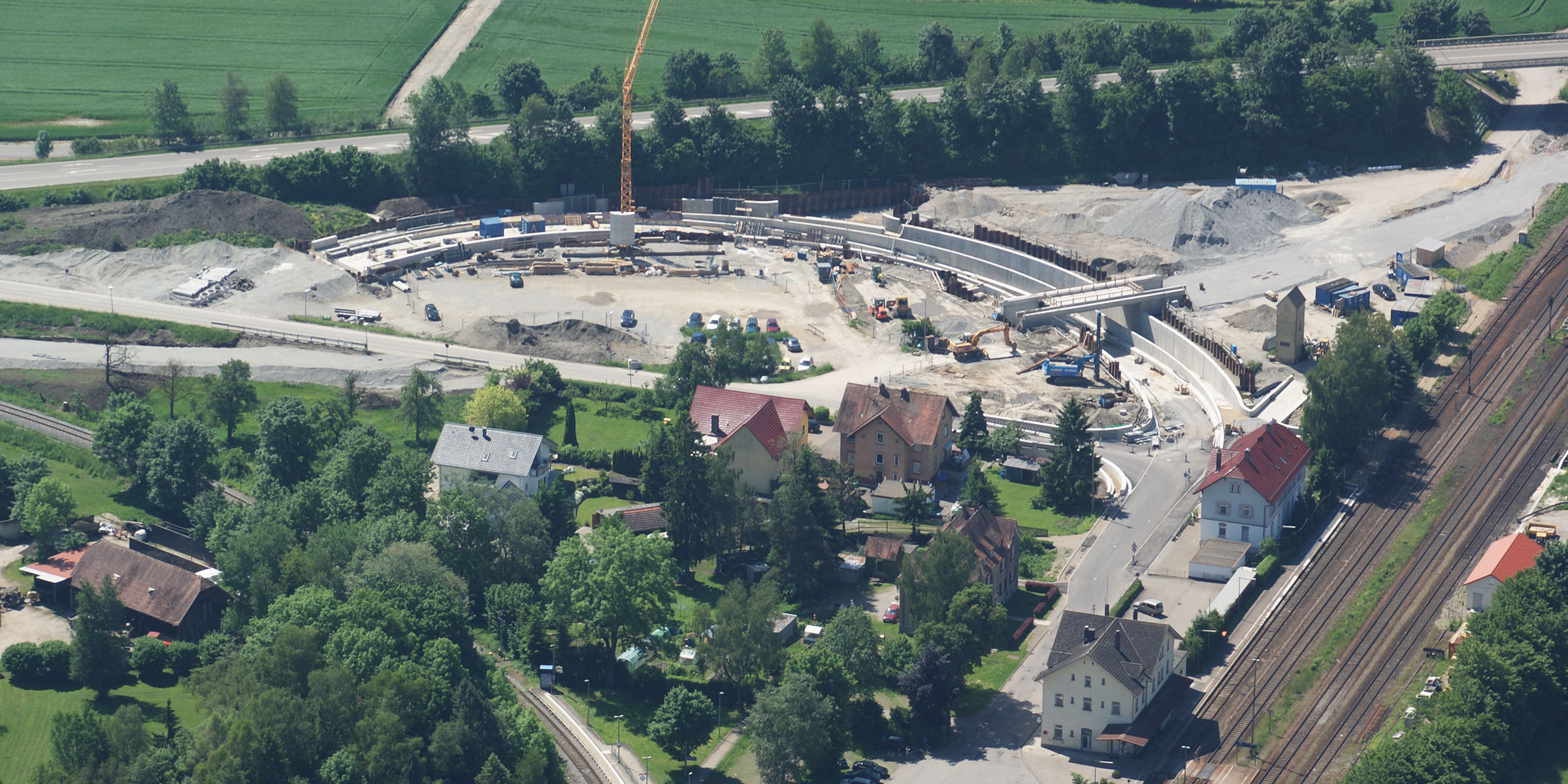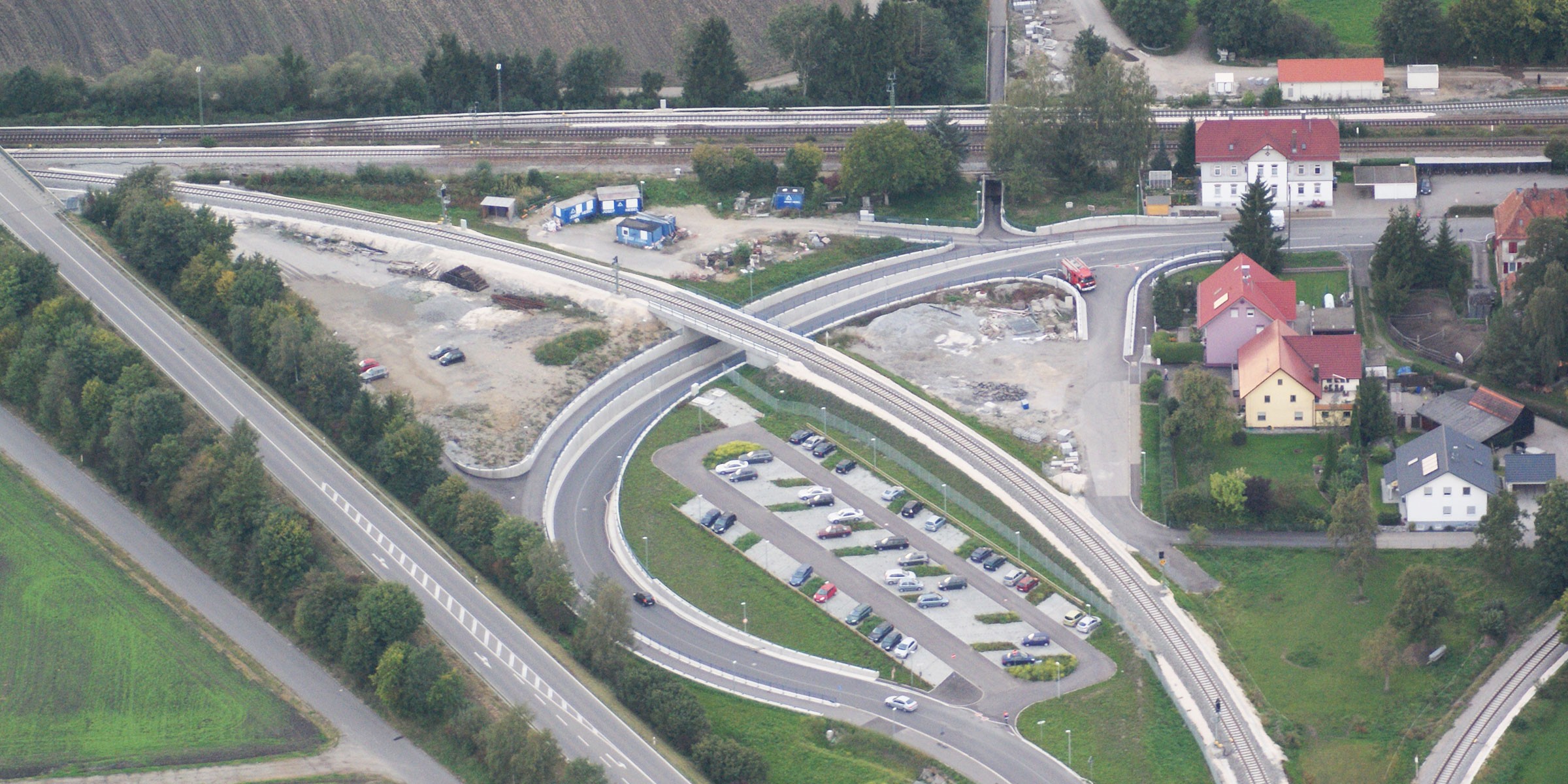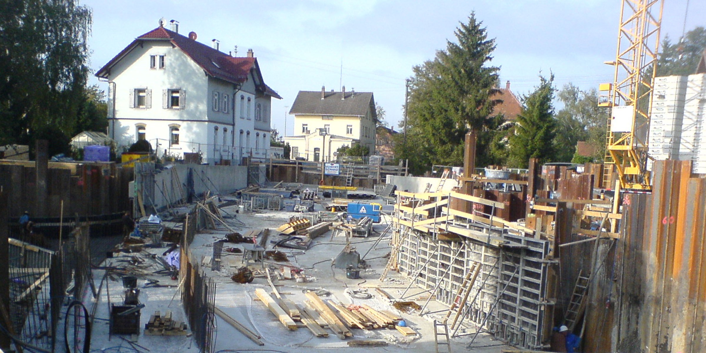 Unterführung Zufahrt Bahnhof unter DB-Strecke 4510 Laupheim West – Schwendi in Laupheim. Trogquerschnitt mit integriertem Überführungsbauwerk (EÜ Südkurve). Abschnittsweise Herstellung in 24 Einzelblöcken und seitlich angegliederten Pumpwerk.