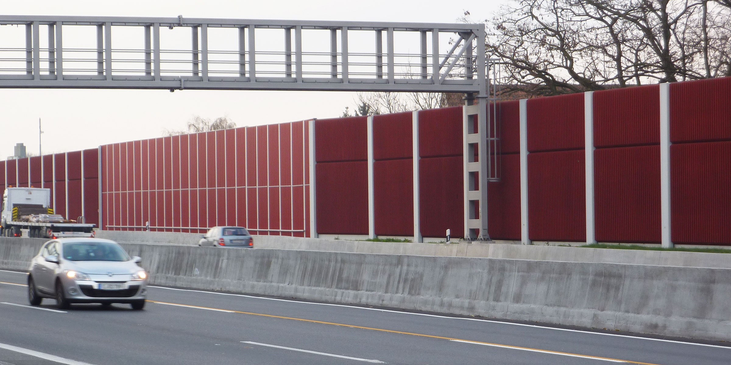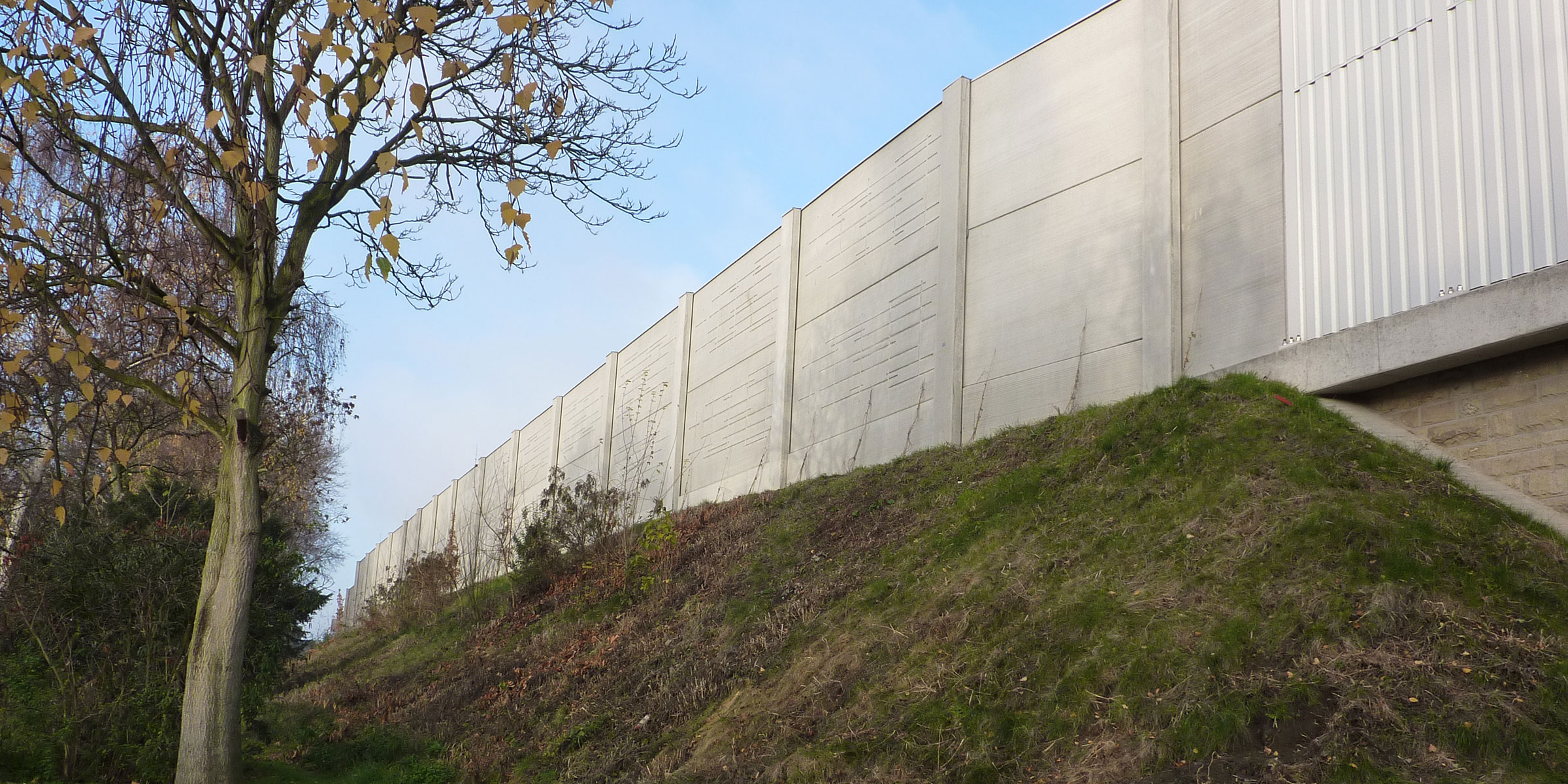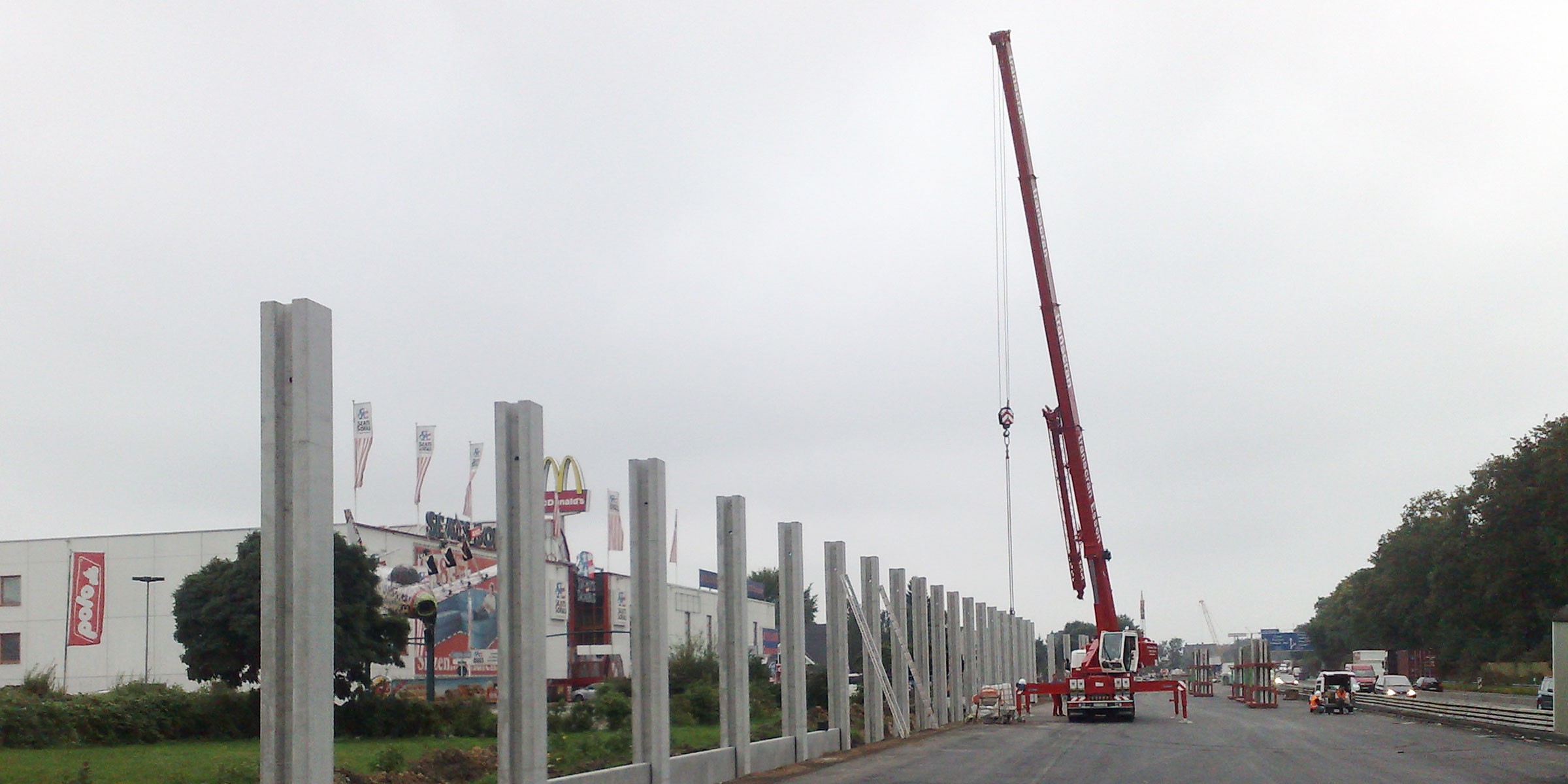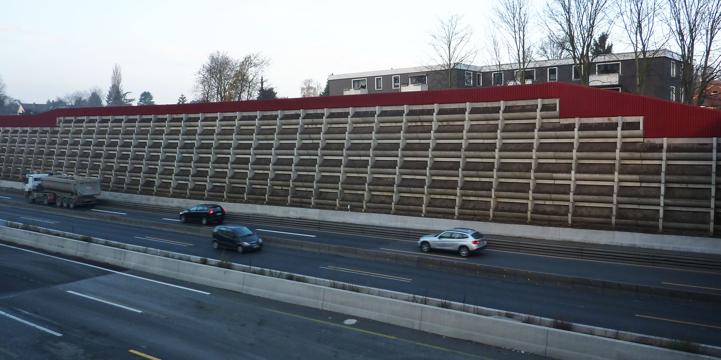 Neubau von Lärmschutzwänden im Zuge des 6-streifigen Ausbaus der A40 Bochum-Wattenscheid. Lärmschutzwandkonstruktion aus Betonelemente mit Absorptionsschale aus haufwerksporigem Leichtbeton bzw. Aluminiumverkleidung). Gründung der Lärmschutzwand auf Bohrpfählen.
