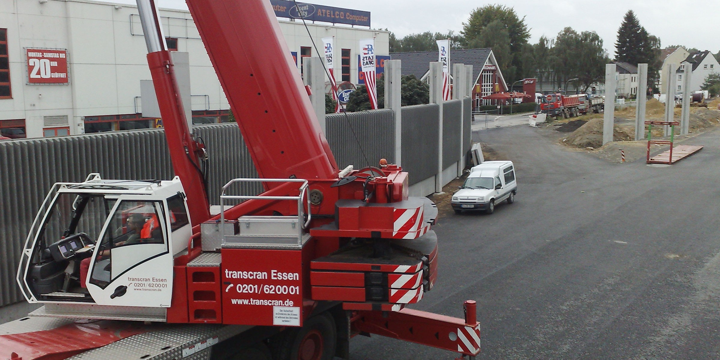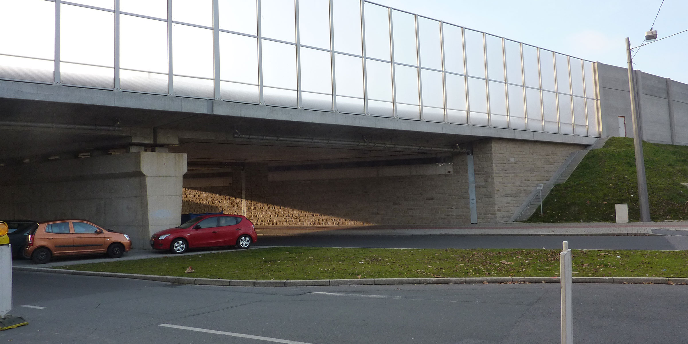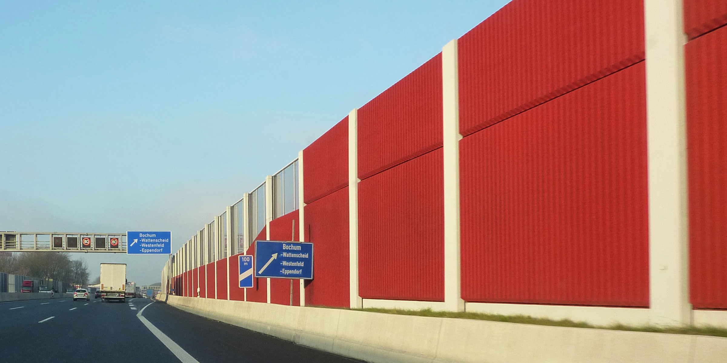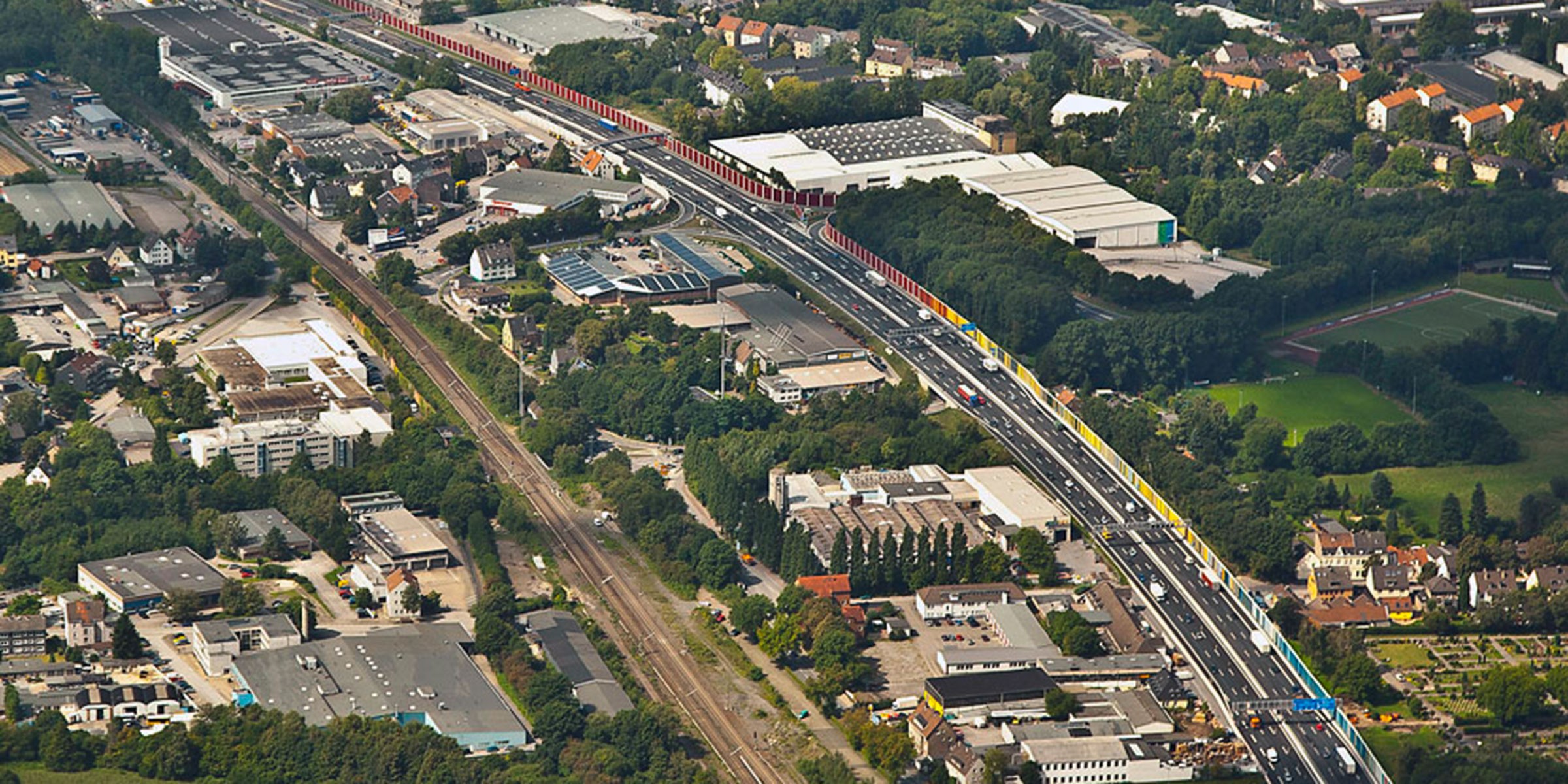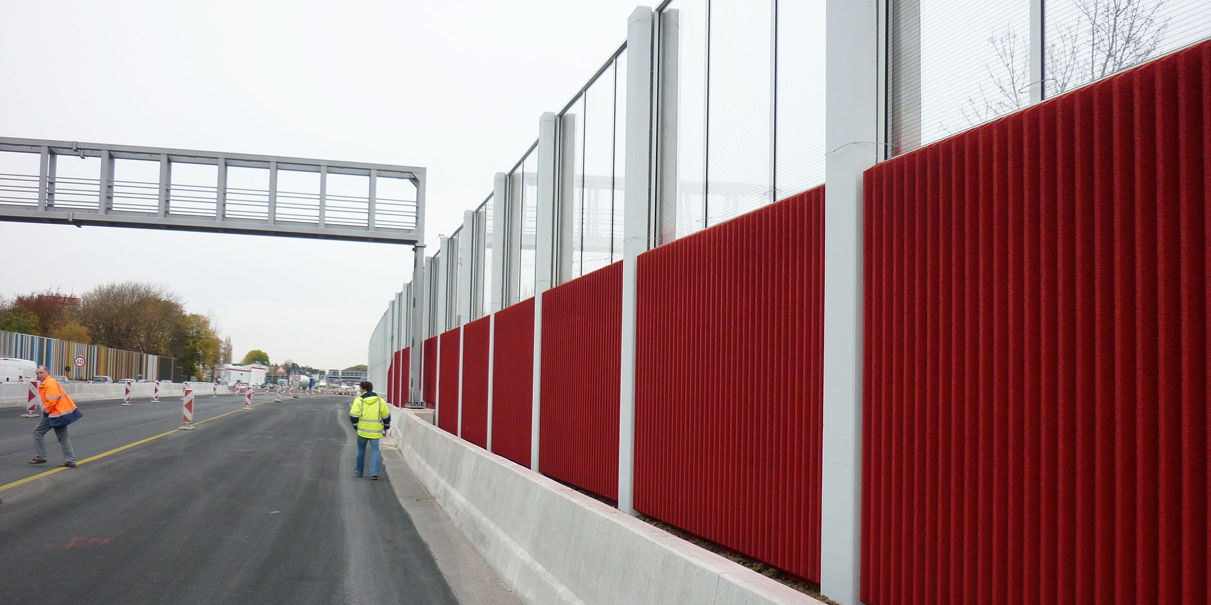 Neubau von Lärmschutzwänden im Zuge des 6-streifigen Ausbaus der A40 Bochum-Wattenscheid. Lärmschutzwandkonstruktion aus Betonelemente mit Absorptionsschale aus haufwerksporigem Leichtbeton bzw. Aluminiumverkleidung). Gründung der Lärmschutzwand auf Bohrpfählen.