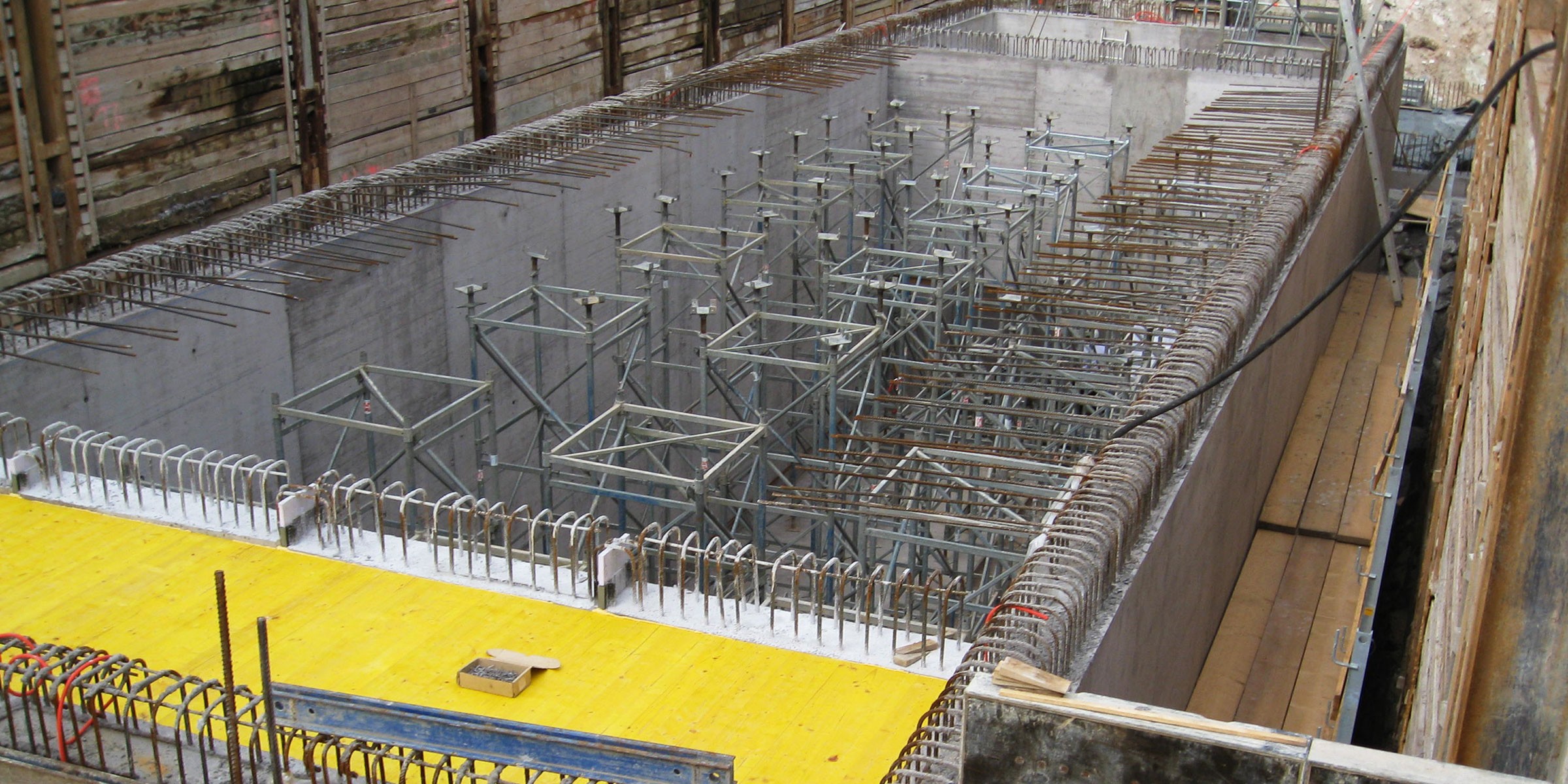 Neubau Regenklärbecken im Zuge des Ausbaus Autobahnkreuz Stuttgart bei Vaihingen. Erdüberschüttetes Becken in Stahlbetonbauweise. Abschnittsweise Herstellung in Ortbeton. Baugrubenverbau als rückverankerter Trägerbohlverbau mit einer Aushubtiefe von 10m.