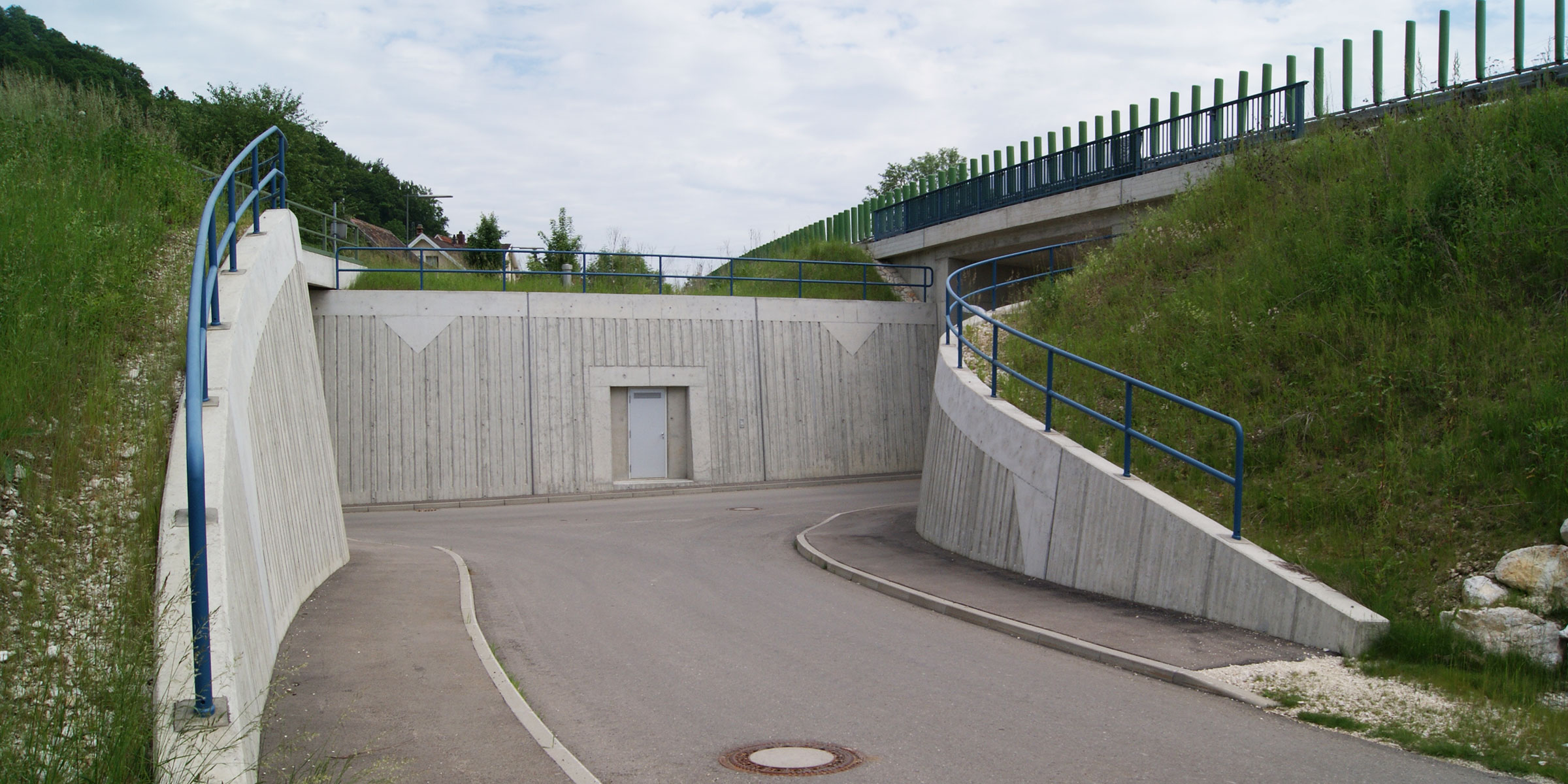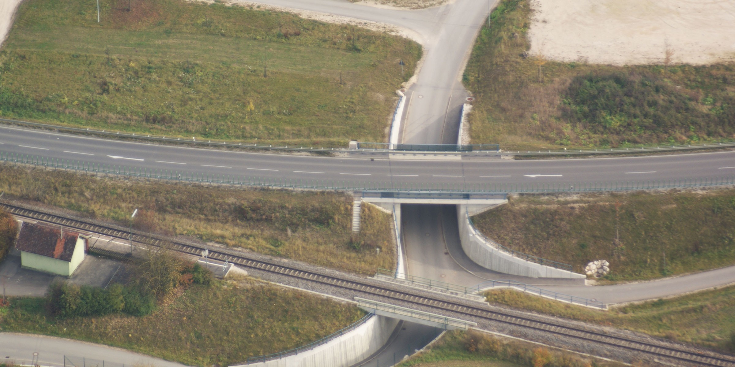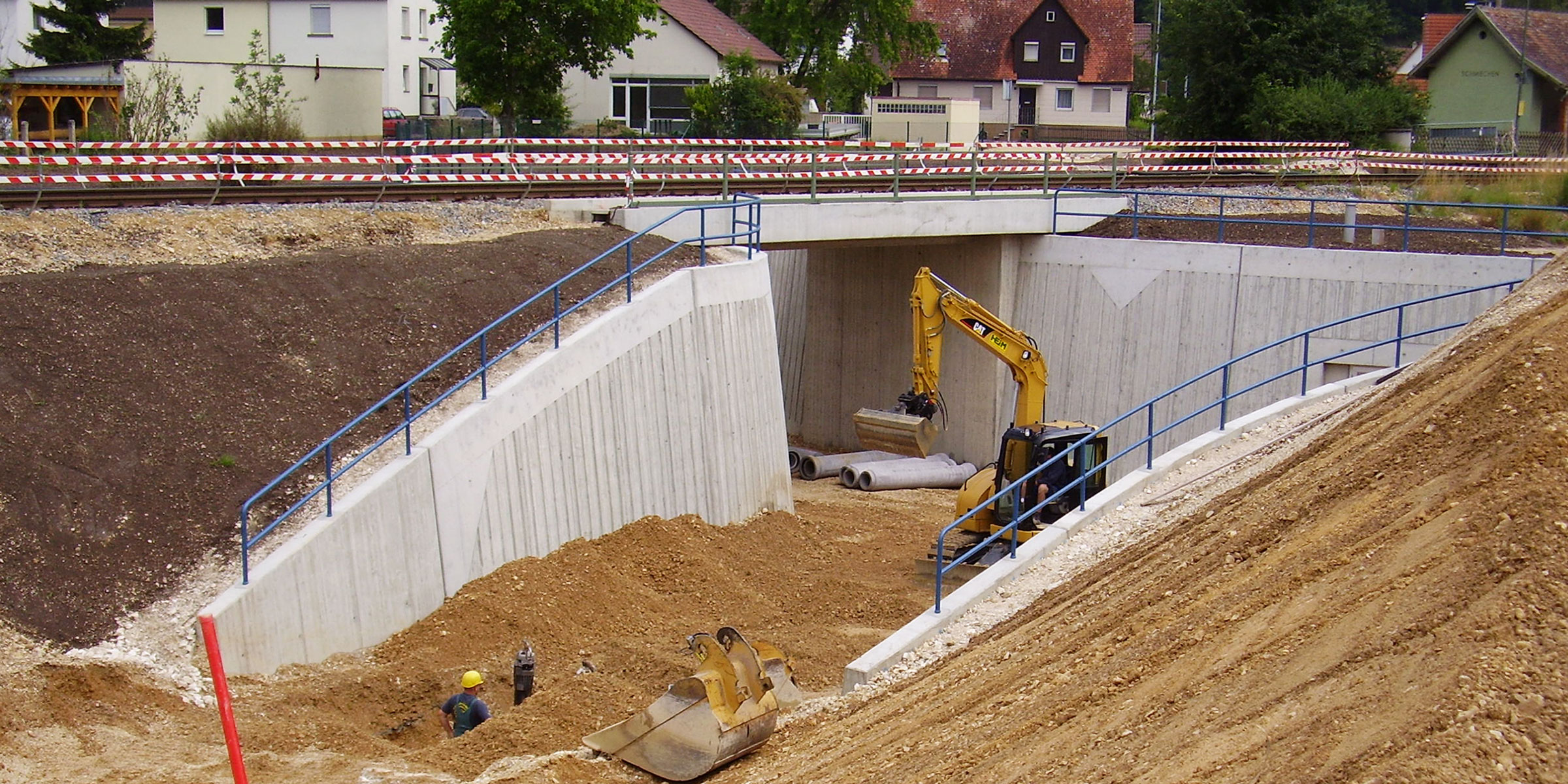 Unterführung Wirtschaftweg unter B492 und DB-Strecke Ulm – Sigmaringen bei Schmiechen. Neubau der Straßenbrücke B492 mit anschließenden Stützwandbauwerken und Pumpwerk. Straßenbrücke als offener Stahlbetonrahmen. Abschnittsweise Herstellung in Ortbetonbauweise.