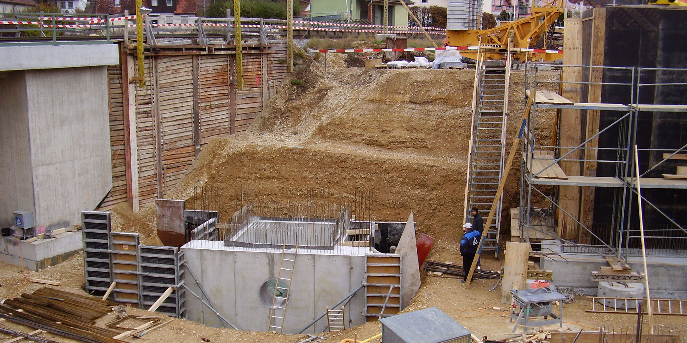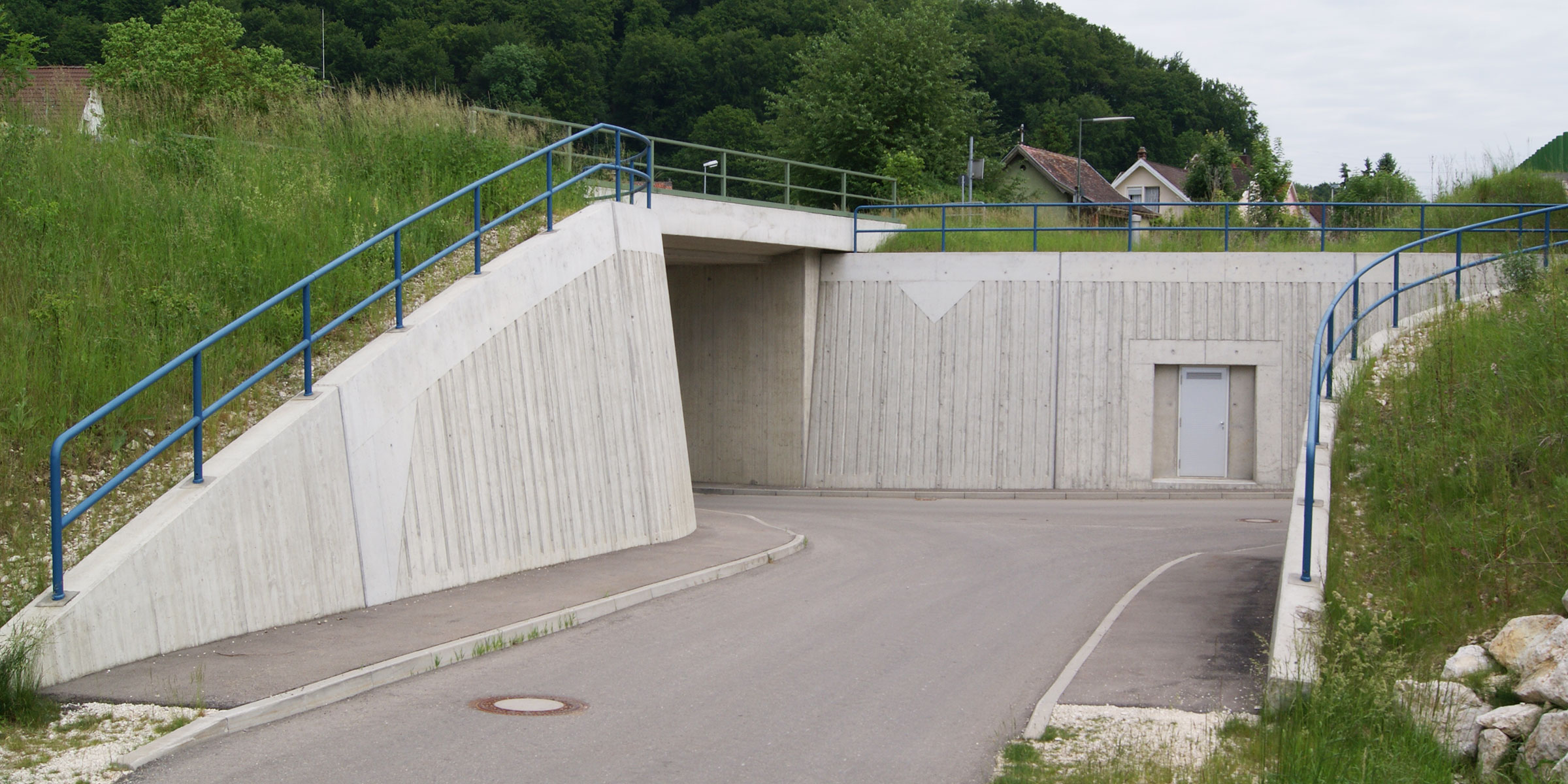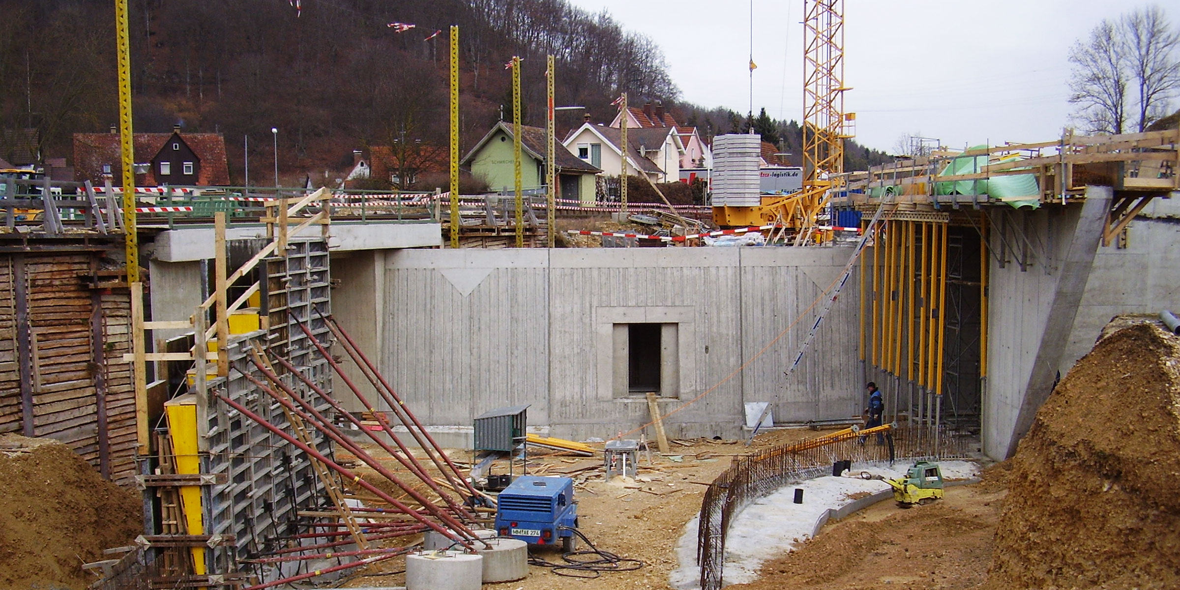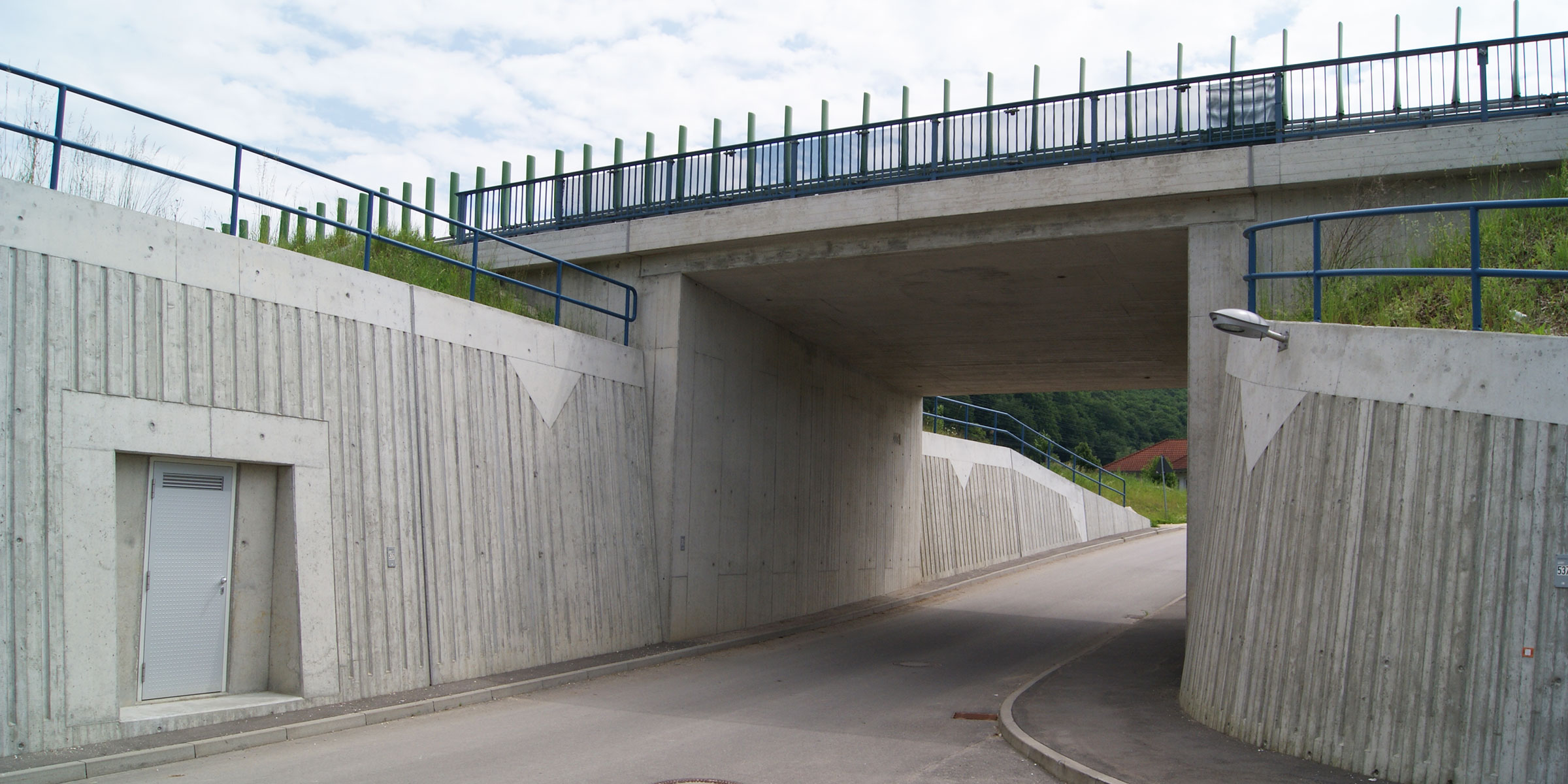 Unterführung Wirtschaftweg unter B492 und DB-Strecke Ulm – Sigmaringen bei Schmiechen. Neubau der Straßenbrücke B492 mit anschließenden Stützwandbauwerken und Pumpwerk. Straßenbrücke als offener Stahlbetonrahmen. Abschnittsweise Herstellung in Ortbetonbauweise.