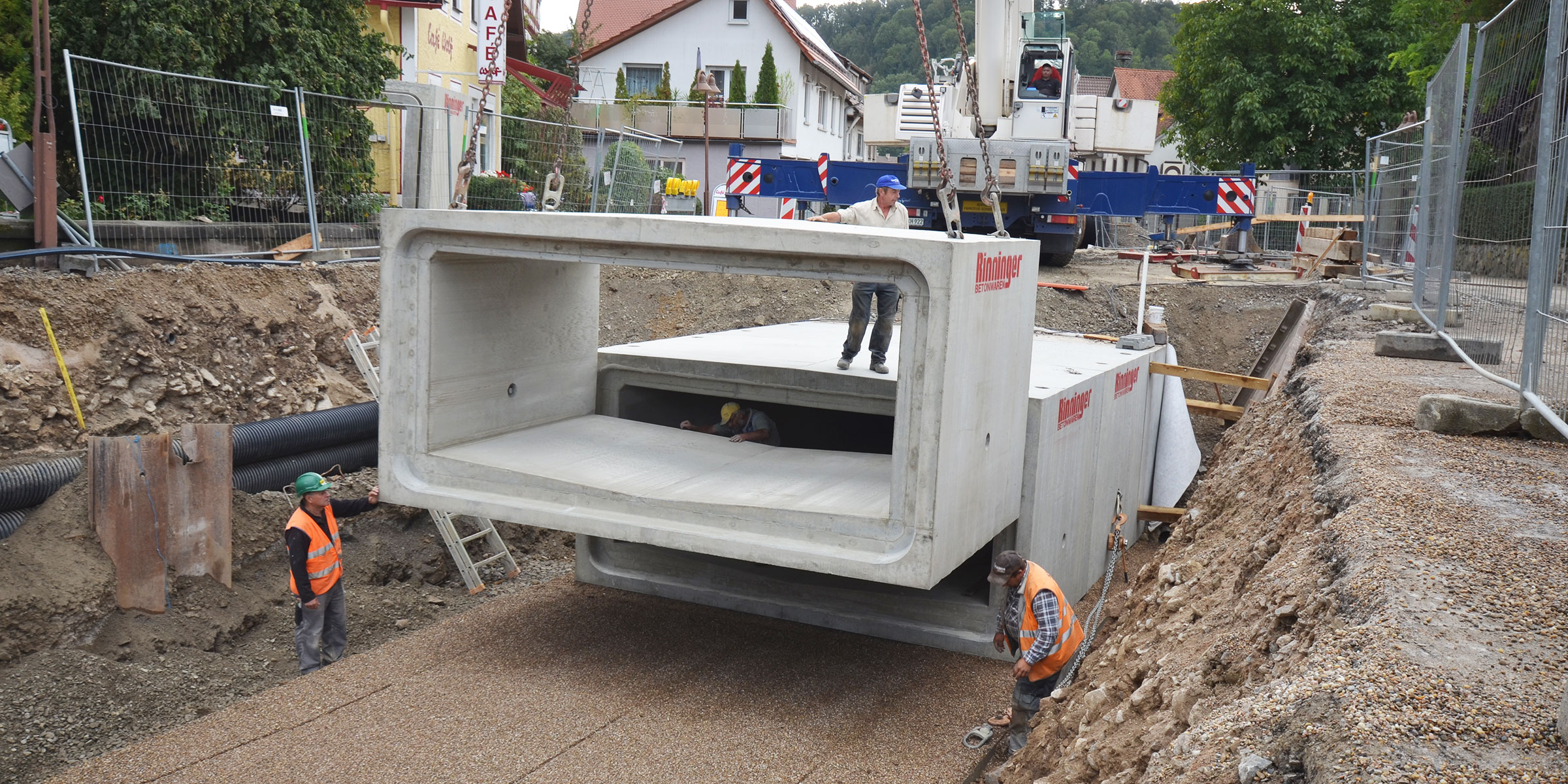 Ersatzneubau der Sperbersbachbrücke i. Z. d. Ausbaus der Ortsdurchfahrt B19 in Untermünkheim. Geschlossener Stahlbetonrahmen mit Fertigteilelementen sowie angrenzenden Ein- und Auslauf- Bauwerk in Ortbetonbauweise. Gründung der Bauwerke als Flachgründung.
