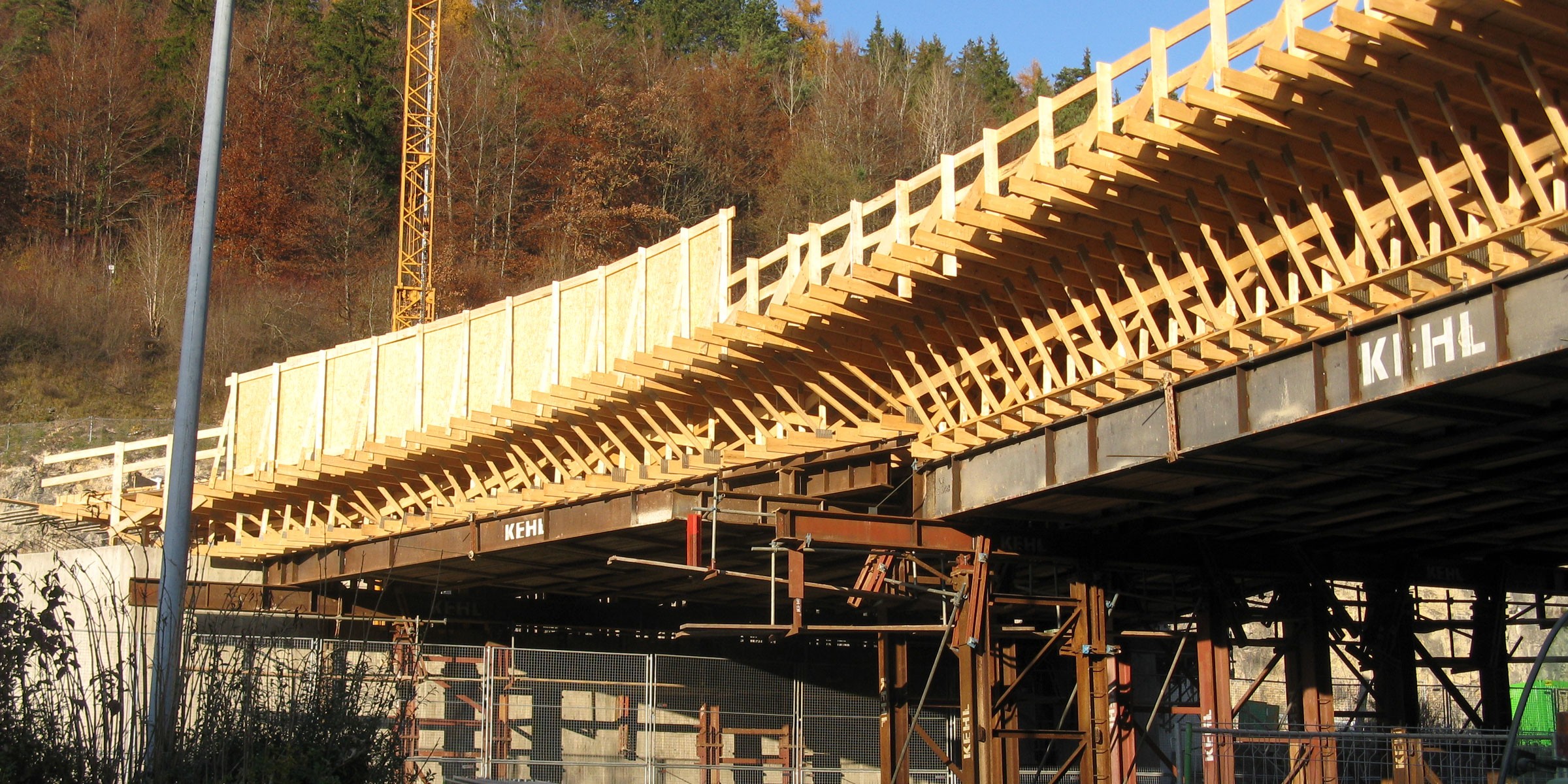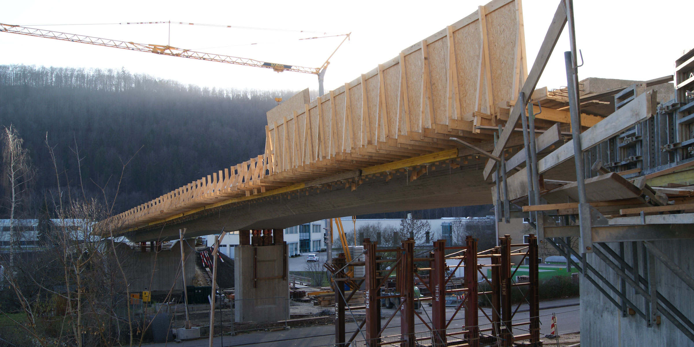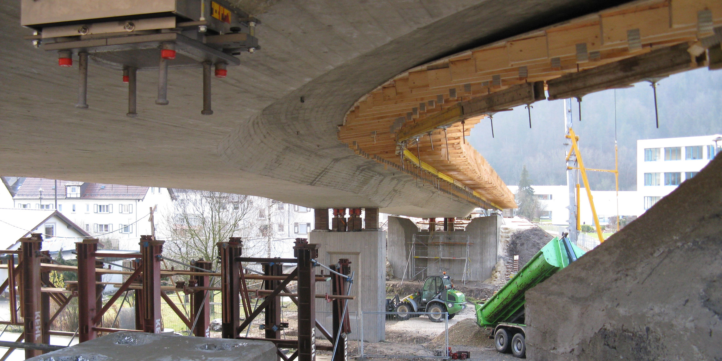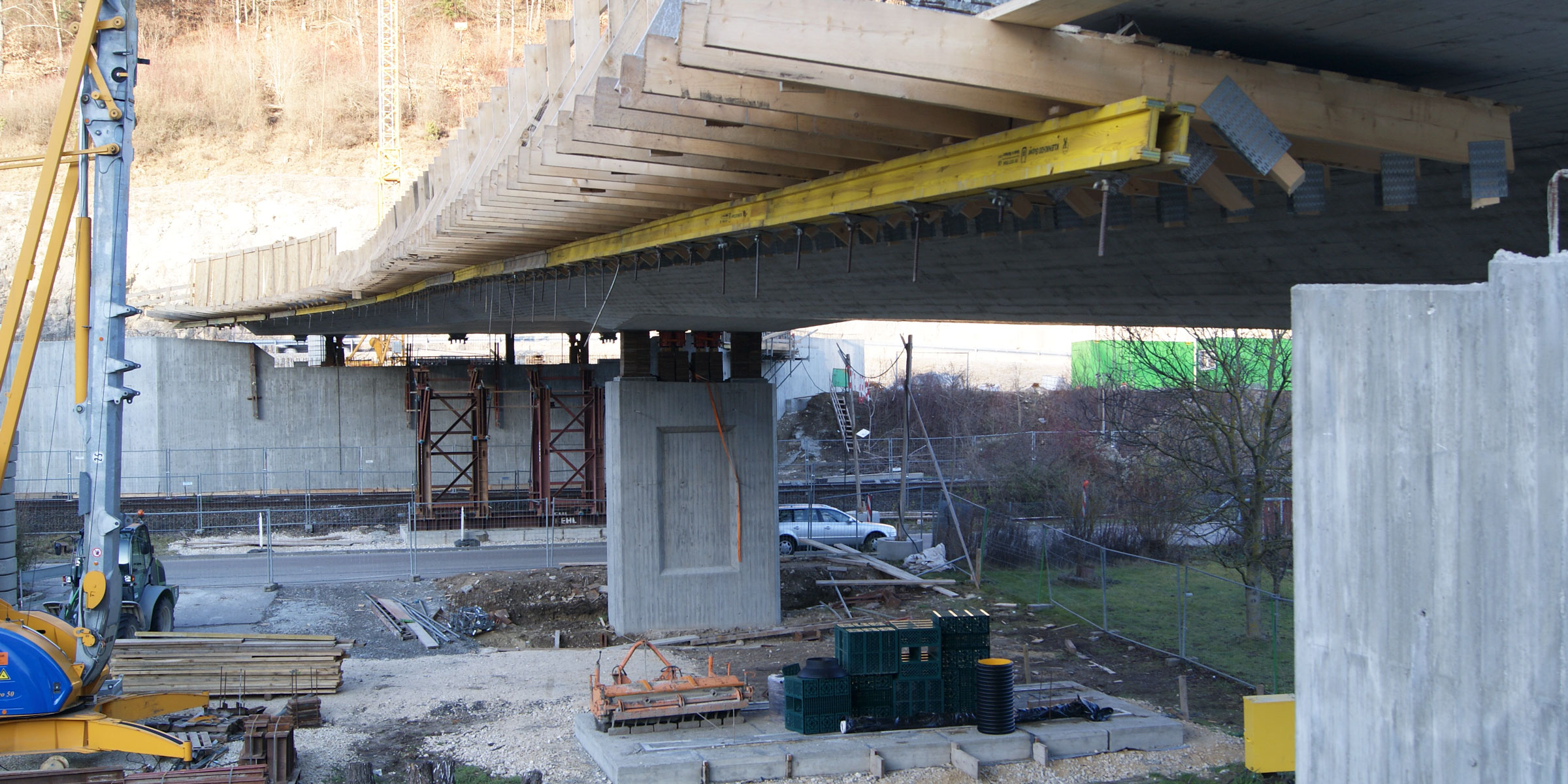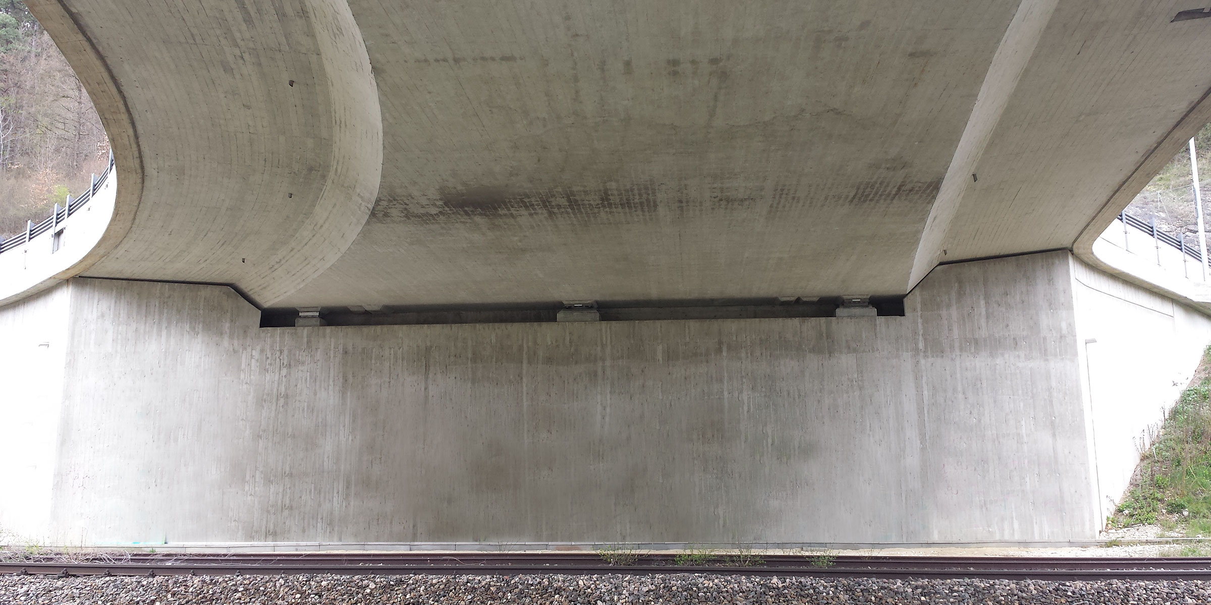 Längsvorgespannte 2-Feld-Platte mit variabler Querschnittsbreite. Herstellung in Ortbetonbauweise auf Traggerüst in überhöhter Lage.