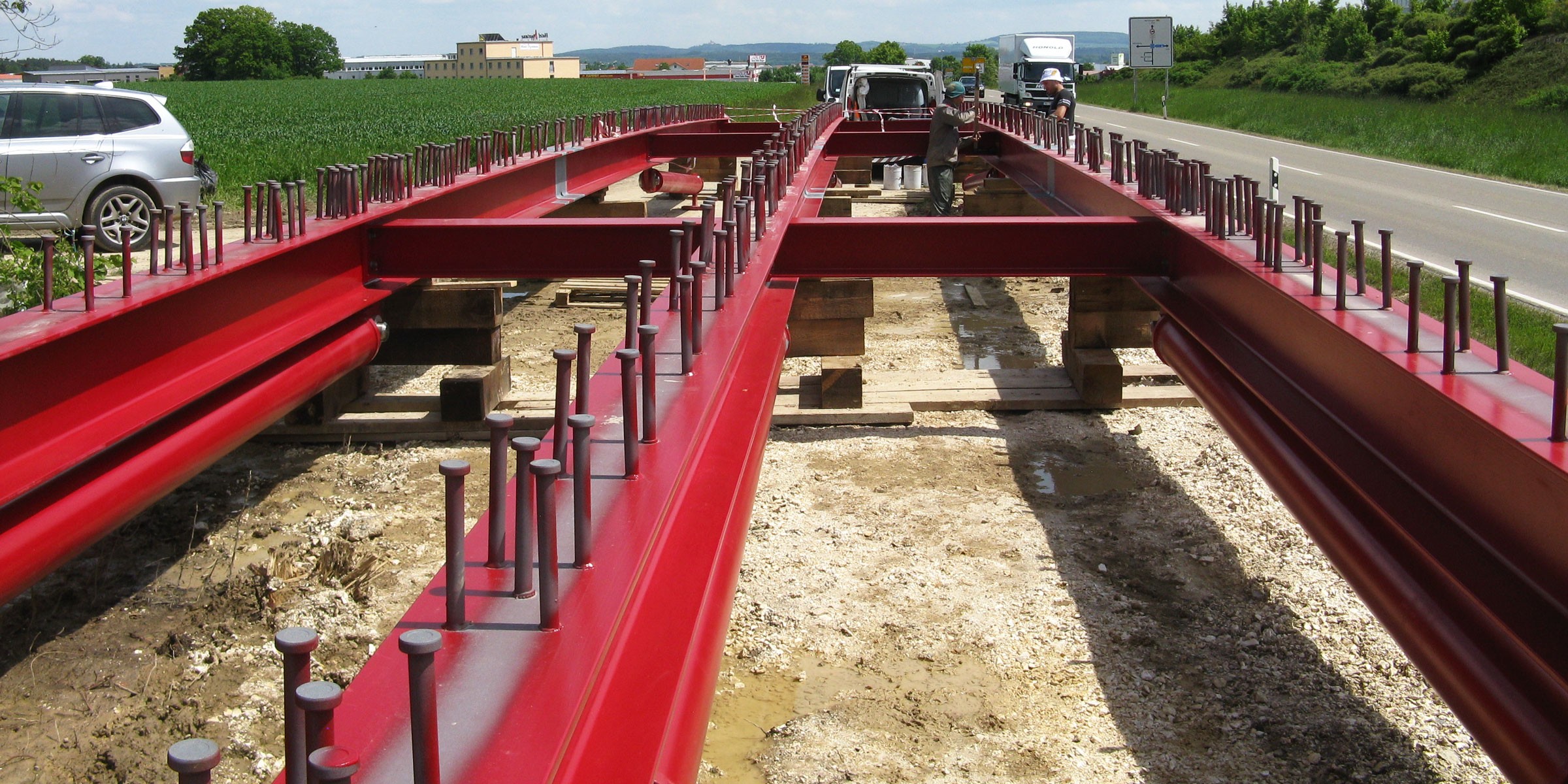 Überbau als Verbundträgerrost mit aufgesetzten Fertigteil-Elementplatten und Ortbetonergänzung.