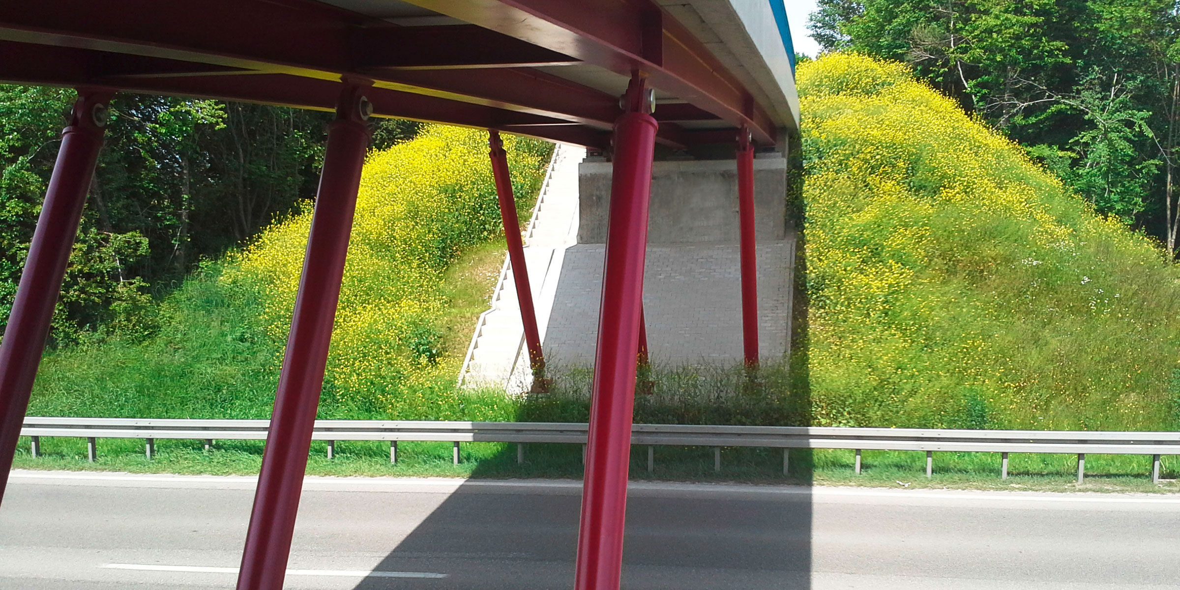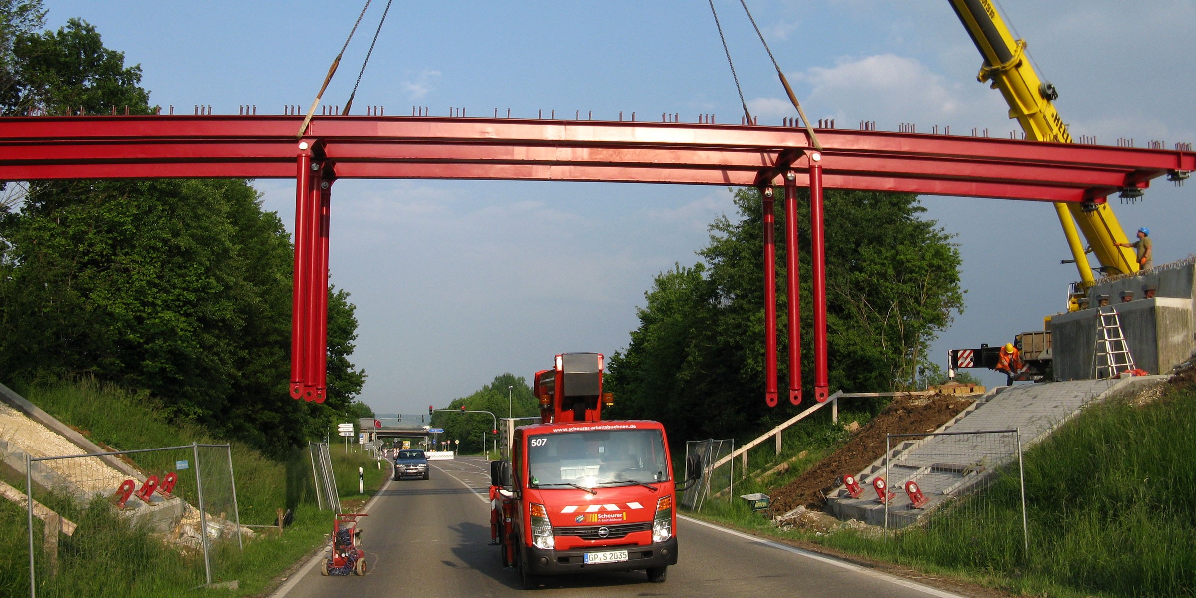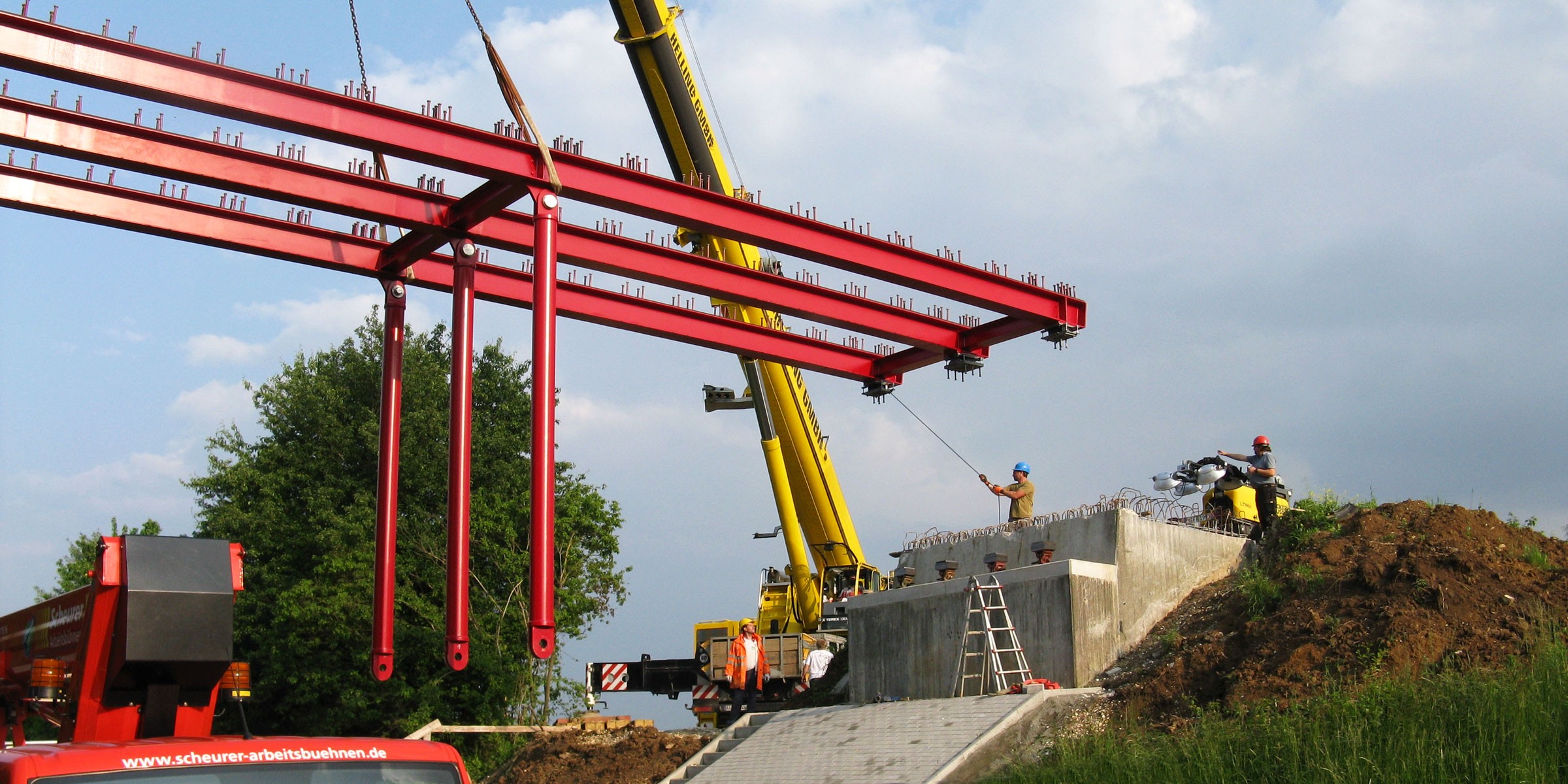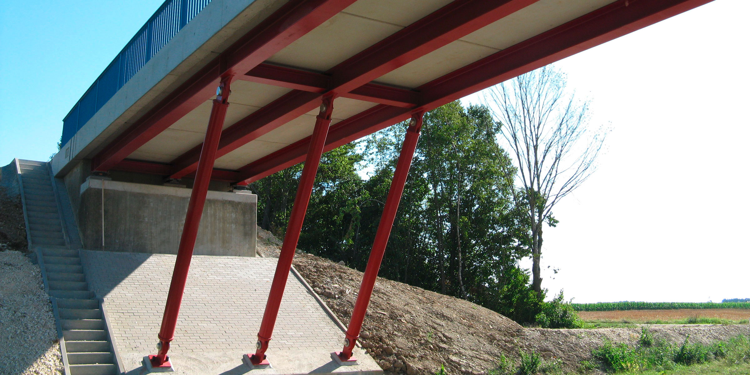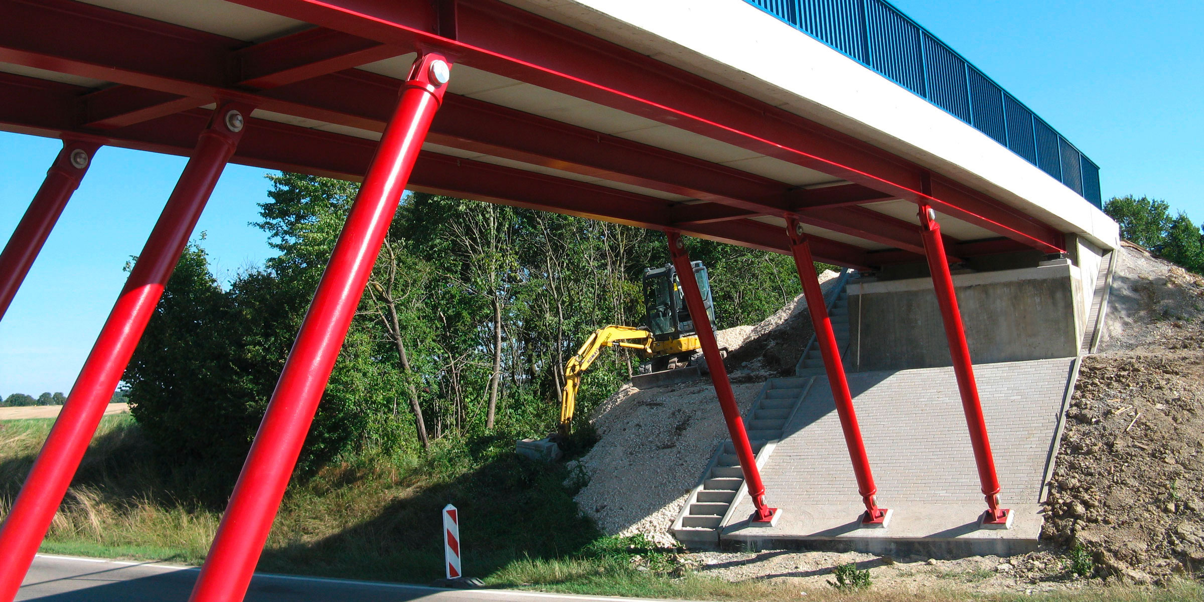 Stahlverbund-Sprengwerk mit gelenkig angeschlossenen Schrägstielen auf Bestands-Unterbauten.