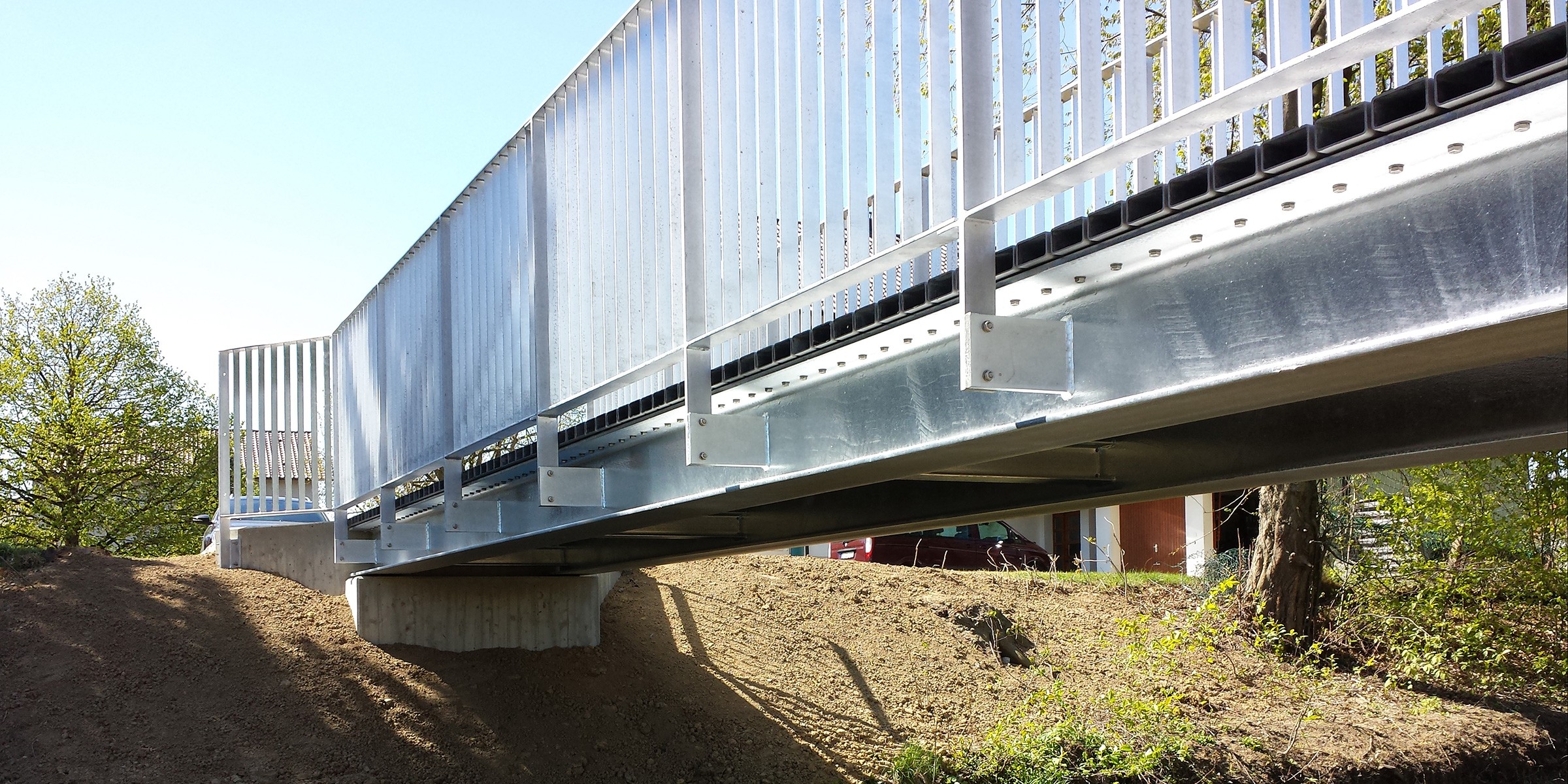Einfeldtragwerk als Trägerrost mit Walzprofilen. Fahrbahnplatte aus Stahlhohlprofilen mit RHD-Belag. Gründung auf den bestehenden Unterbauten.