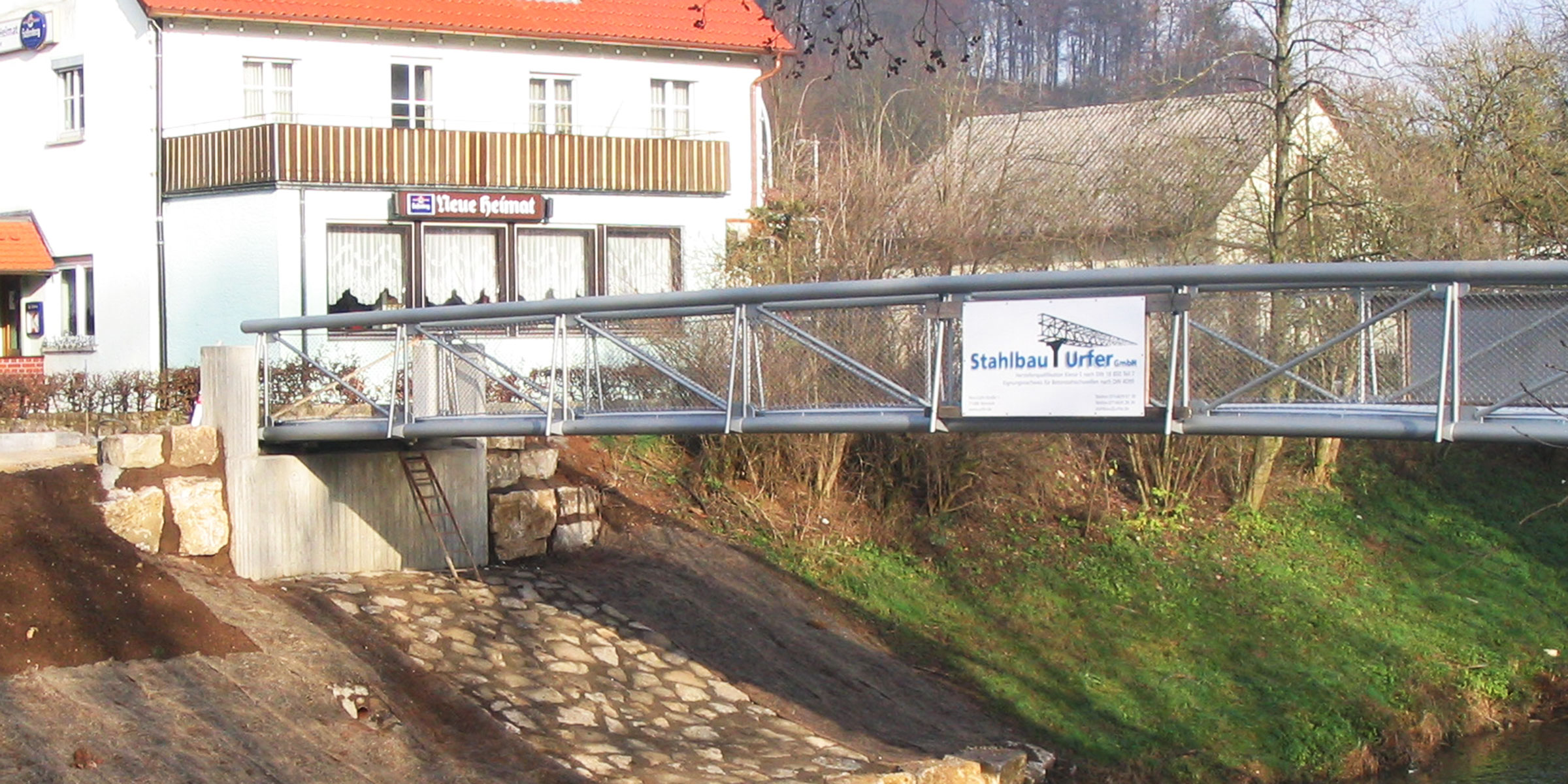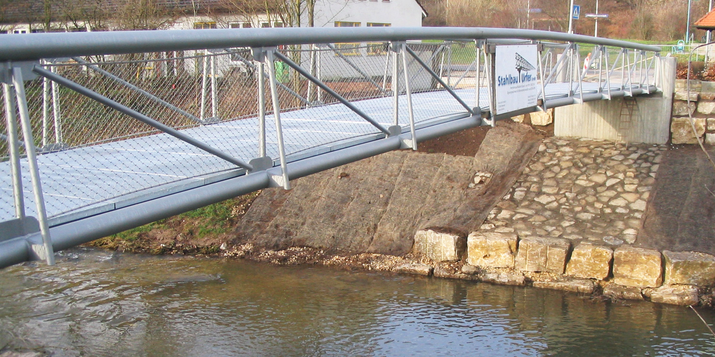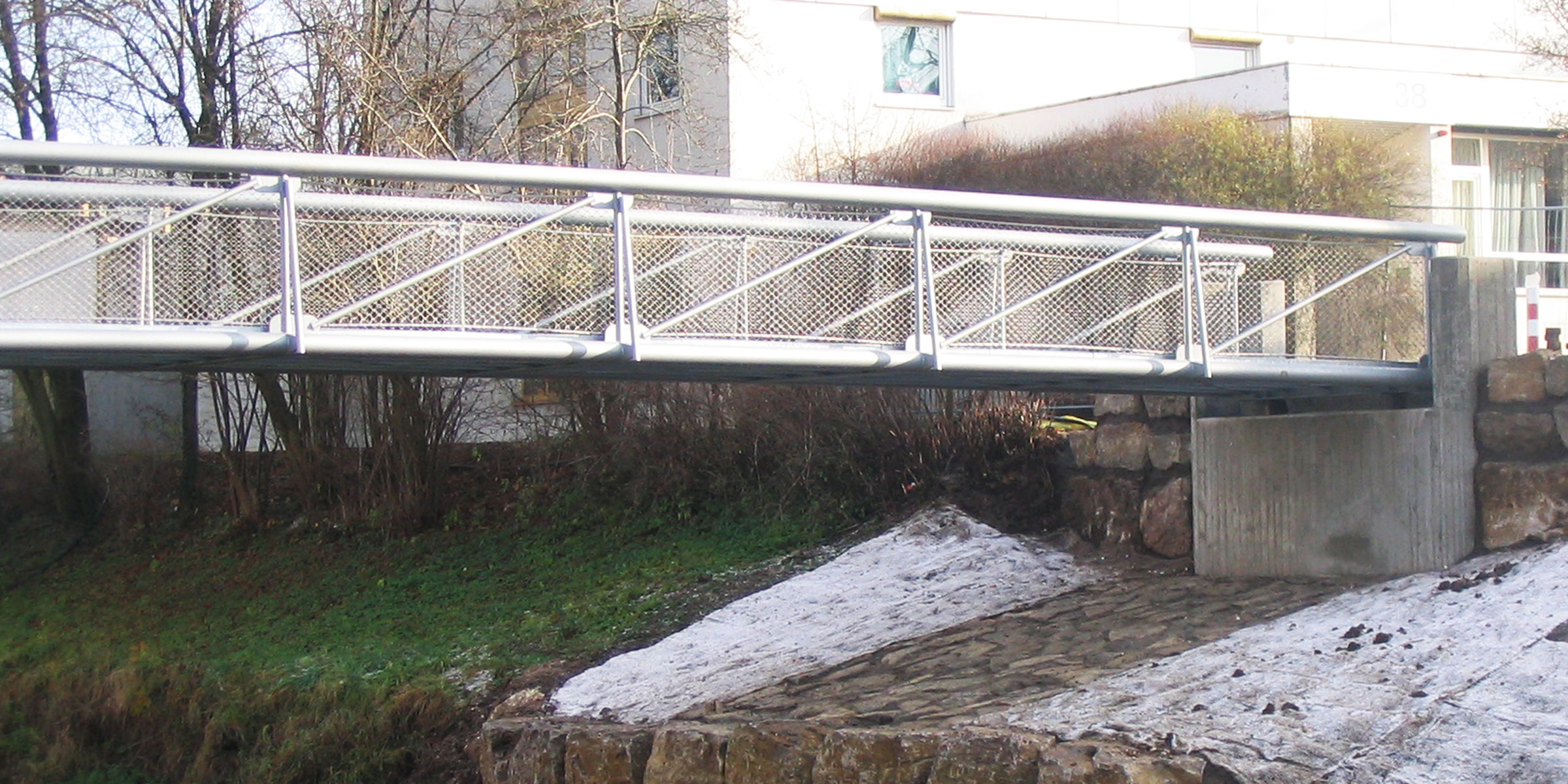 1-feldriger Stahlüberbau als Fachwerkkonstruktion mit Hohlprofilen. Fahrbahnplatte mit Gitterrost-Belag. Drahtseilnetz als seitliche Absturzsicherung.