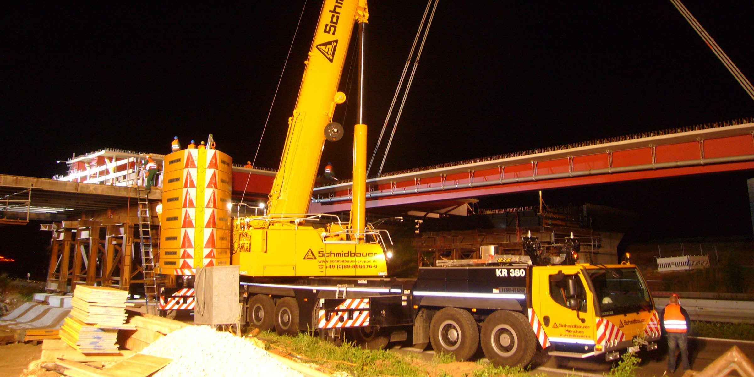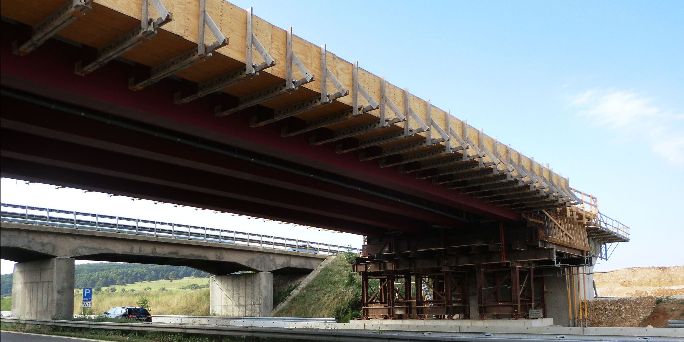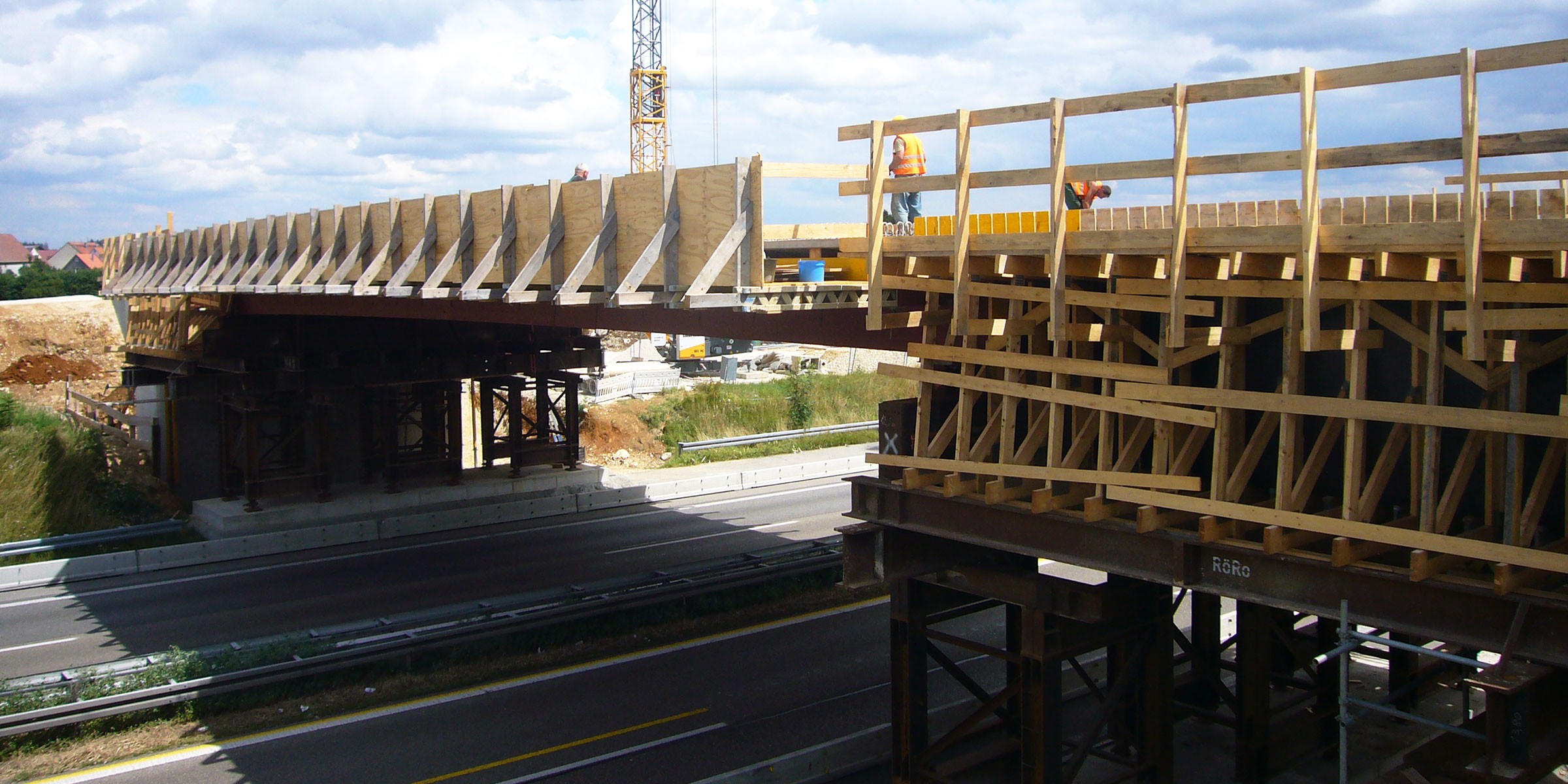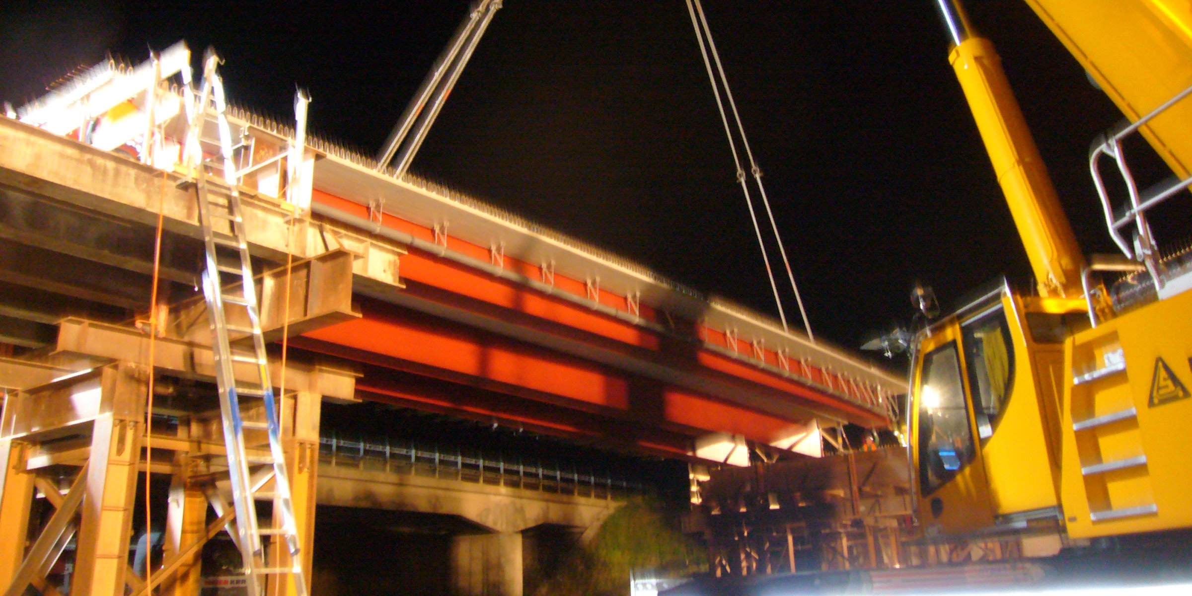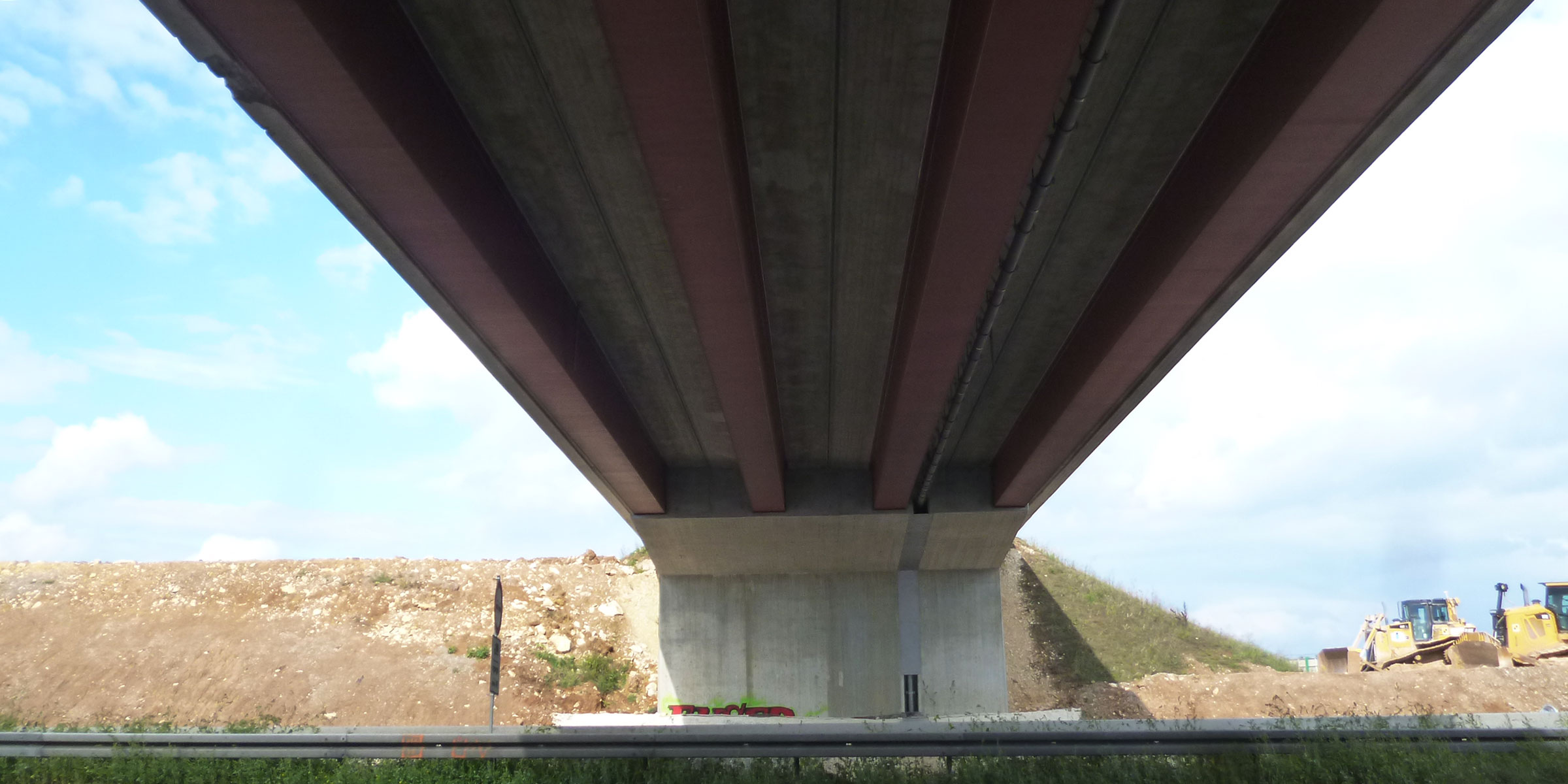 Stahlverbundrahmenbrücke mit 4-stegigem Plattenbalkenquerschnitt in FT-Bauweise. Stahlverbundfertigteilträger (VFT) aus dichtgeschweißten Stahlhohlkästen mit Ortbetonergänzung. Gründung der Widerlager als Flachgründung.