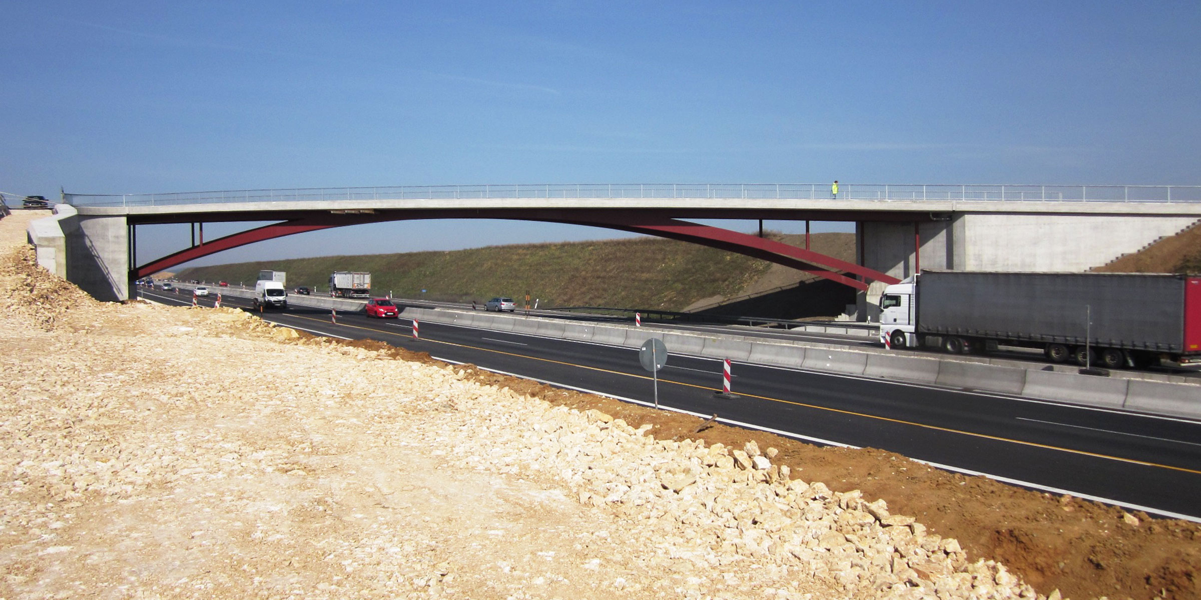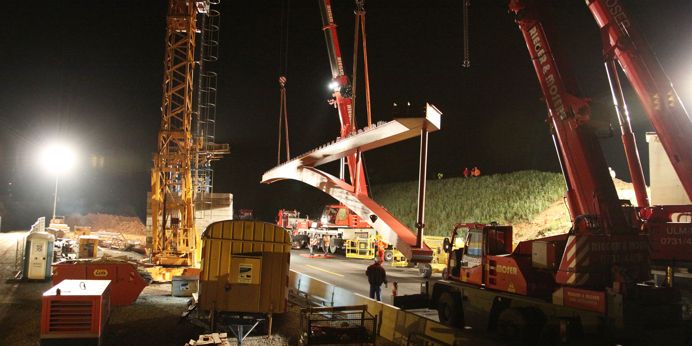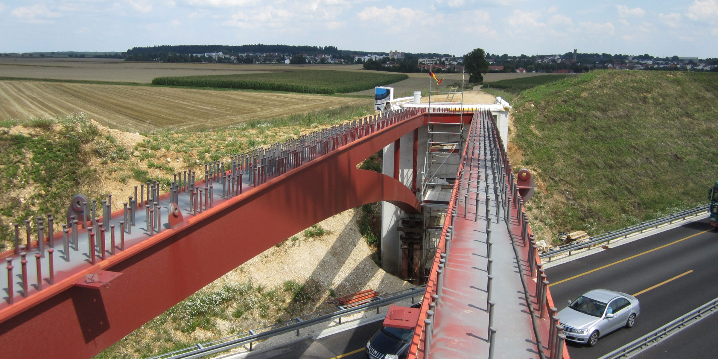 Überführung der Gemeindeverbindungsstraße Böttingen-Dornstadt über die BAB A8 bei Ulm. Stahlverbundbogenbrücke mit 2-stegigem Plattenbalkenquerschnitt in FT-Bauweise. Stahlverbundträger aus dichtgeschweißten Stahlhohlkästen und aufgelegten Fertigteilplatten mit Ortbetonergänzung. Gründung der Widerlager als Flachgründung.