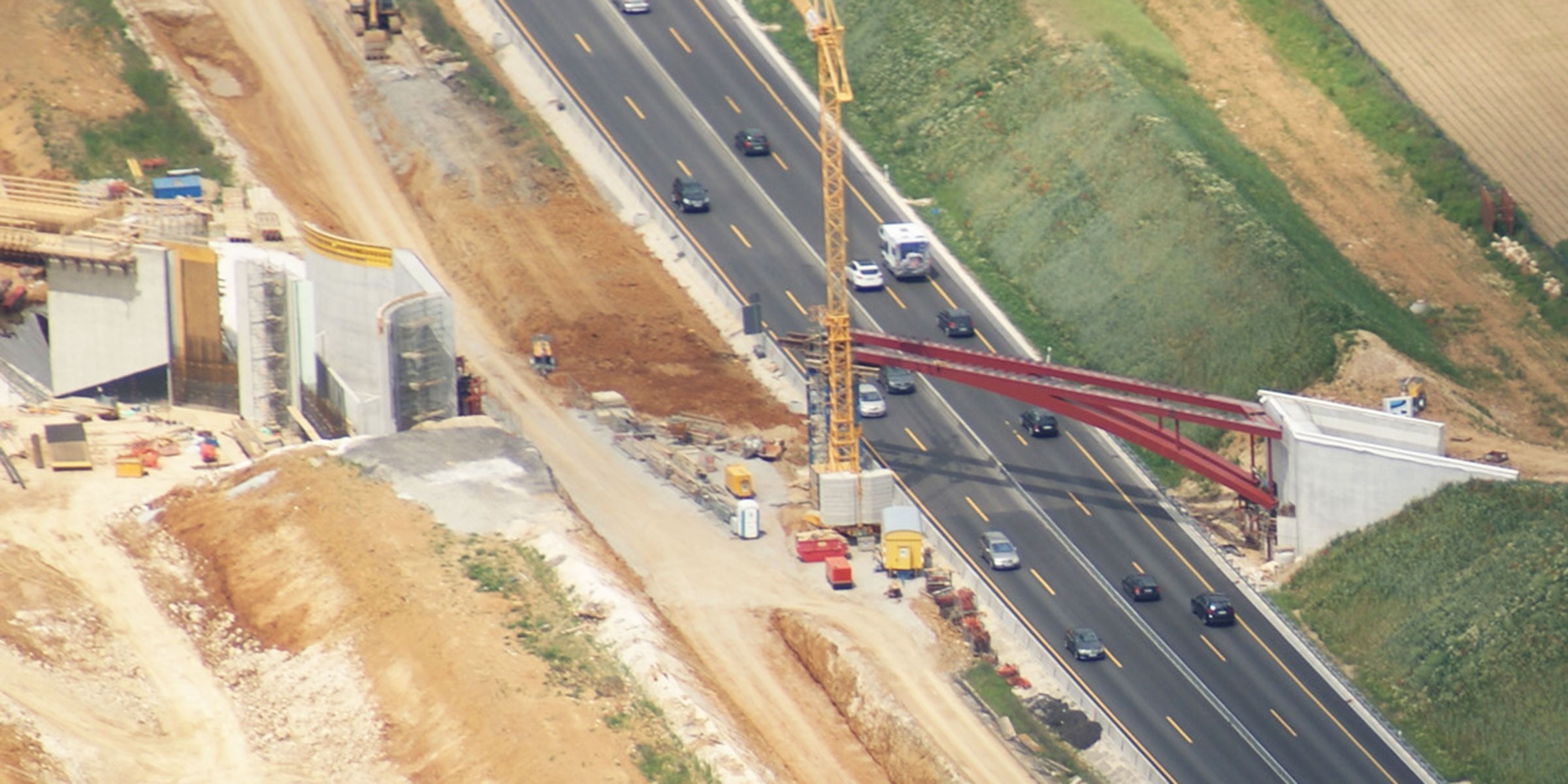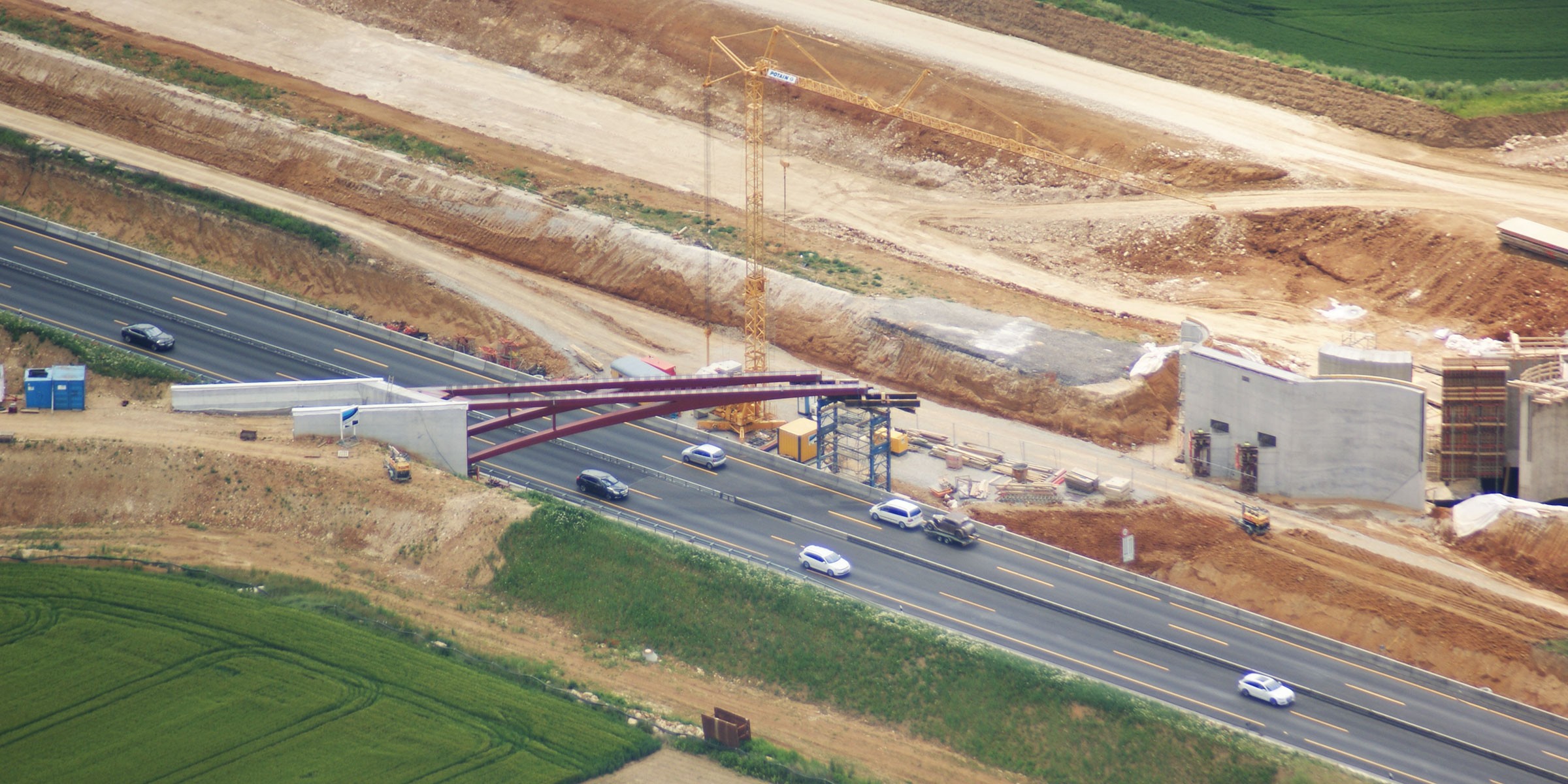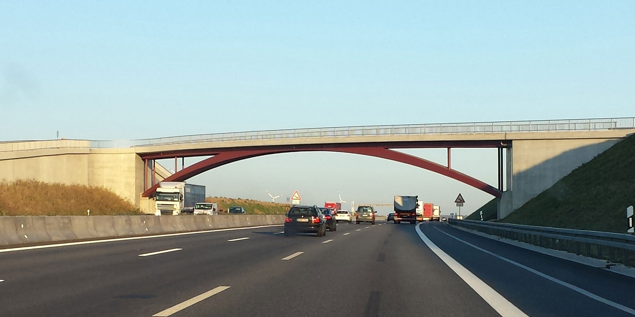 Überführung der Gemeindeverbindungsstraße Böttingen-Dornstadt über die BAB A8 bei Ulm. Stahlverbundbogenbrücke mit 2-stegigem Plattenbalkenquerschnitt in FT-Bauweise. Stahlverbundträger aus dichtgeschweißten Stahlhohlkästen und aufgelegten Fertigteilplatten mit Ortbetonergänzung. Gründung der Widerlager als Flachgründung.