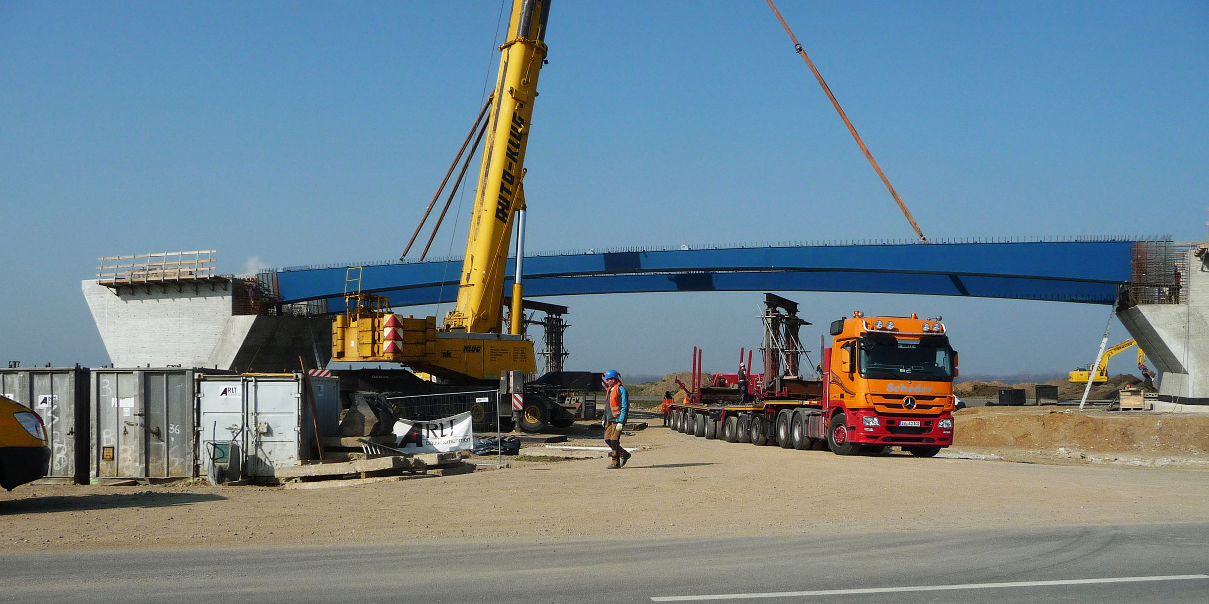 Überführung der Gemeindeverbindungsstraße über die BAB A72 bei Rötha. Stahlverbundrahmenbrücke mit 2-stegigem Plattenbalkenquerschnitt in Ortbetonbauweise. Stahlverbundträger aus dichtgeschweißten gevouteten Stahlhohlkästen mit Ortbetonplatte. Gründung der Widerlager auf Bohrpfählen.