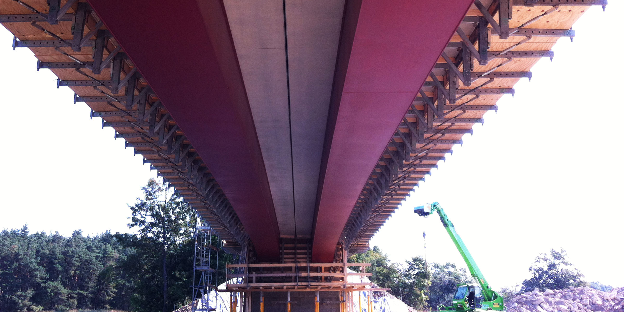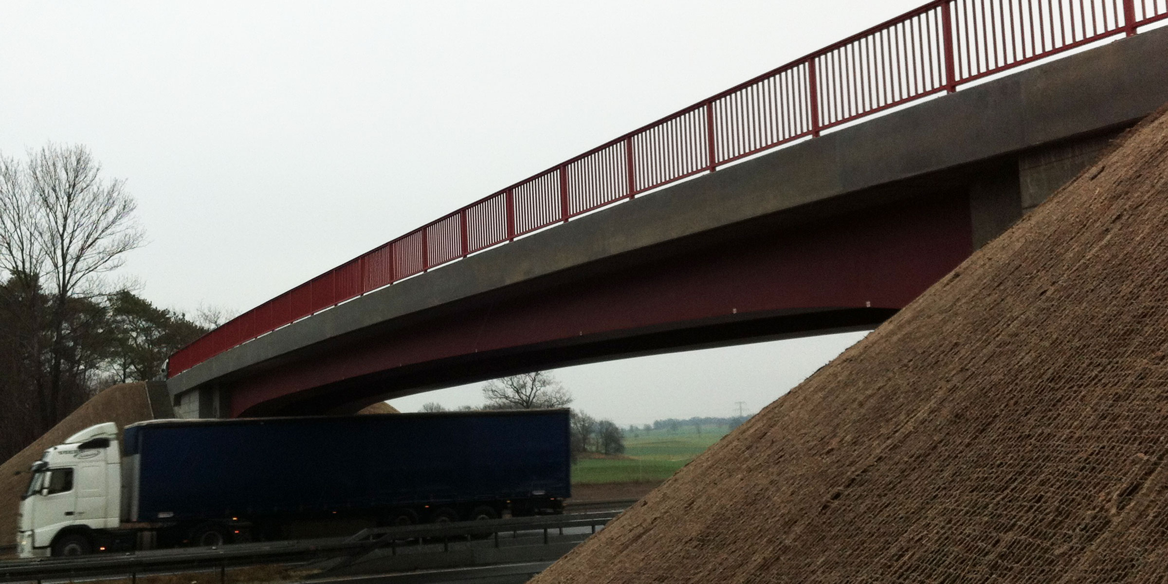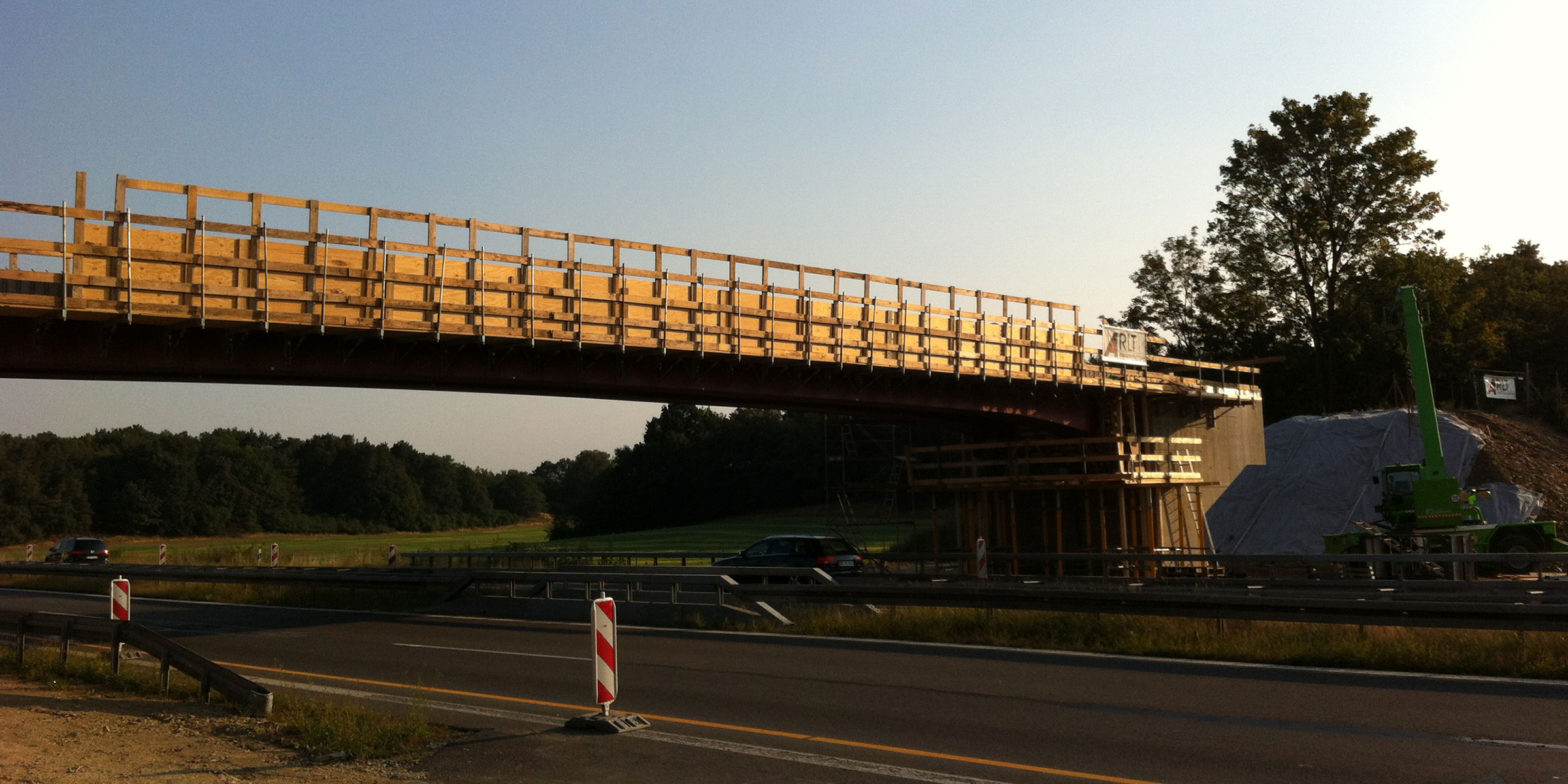 Überführung eines Wirtschaftswegs über die BAB A13 Dresden – Berlin bei Bärnsdorf. Stahlverbundrahmenbrücke mit 2-stegigem Plattenbalkenquerschnitt in Fertigteilbauweise. Stahlverbundfertigteilträger (VFT) aus dichtgeschweißten, gevouteten Stahlhohlkästen mit Ortbetonergänzung. Gründung der Widerlager auf Bohrpfählen.
