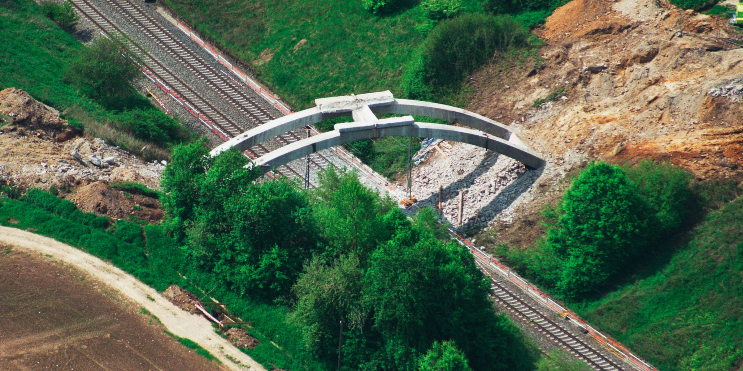 Überführung St2214 über DB-Strecke Donauwörth – Treuchtlingen bei Nussbühl. Stahlverbundrahmenbrücke mit 5-stegigem Plattenbalkenquerschnitt in FT-Bauweise. Stahlverbundfertigteilträger (VFT) aus unbeschichteten Stahlträgern (S355J2G1W) mit Ortbetonergänzung. Gründung der Widerlager auf Bohrpfählen.