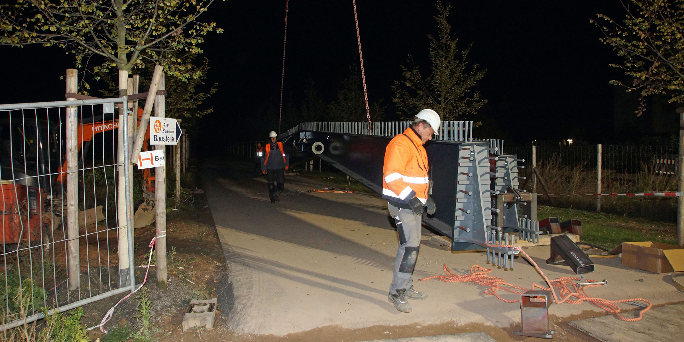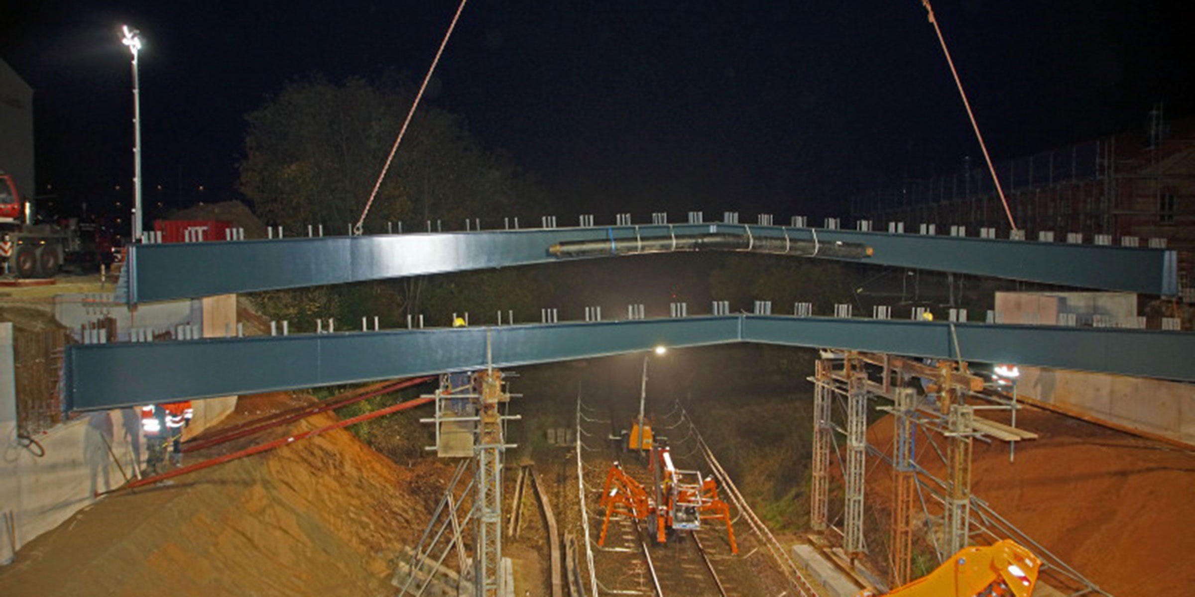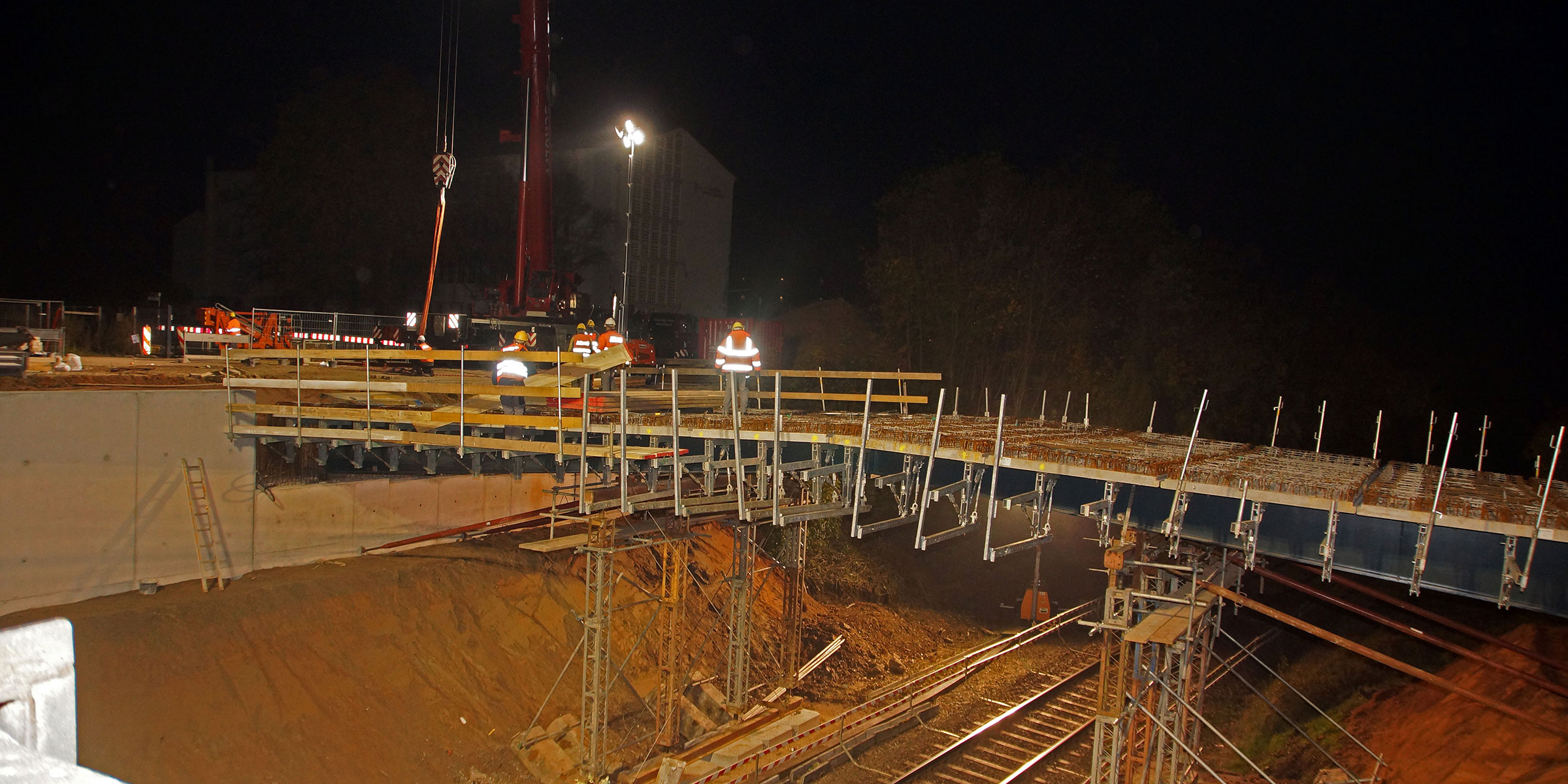 Neubau Straßenüberführung „Brücke Süd“ über DB Strecke 3450 in Landau. Stahlverbundrahmenbrücke mit 3-stegigem Plattenbalkenquerschnitt in FT-Bauweise. Stahlverbundträger aus gevouteten Stahlträgern und aufgelegten Fertigteilplatten mit Ortbetonergänzung.
