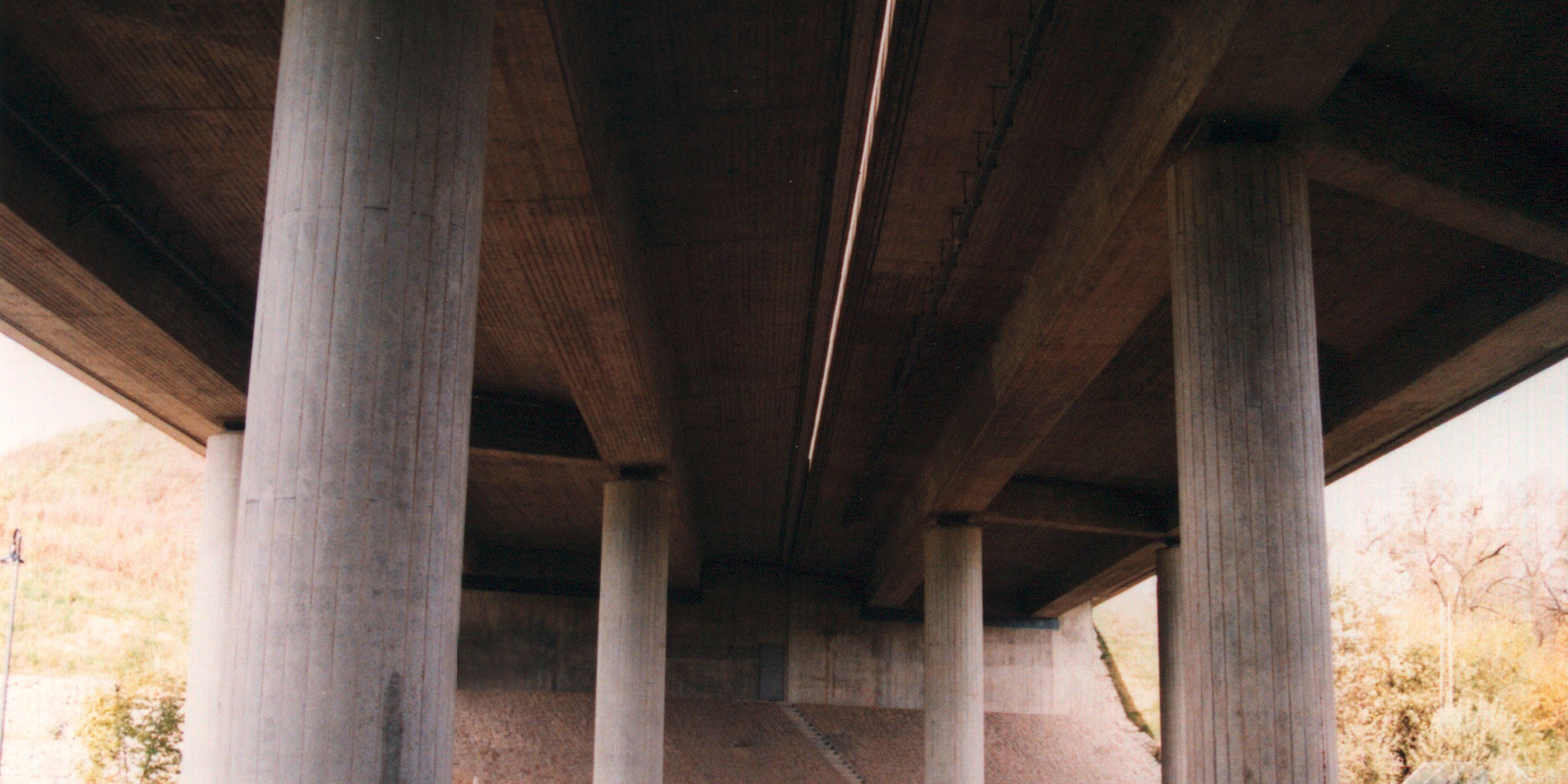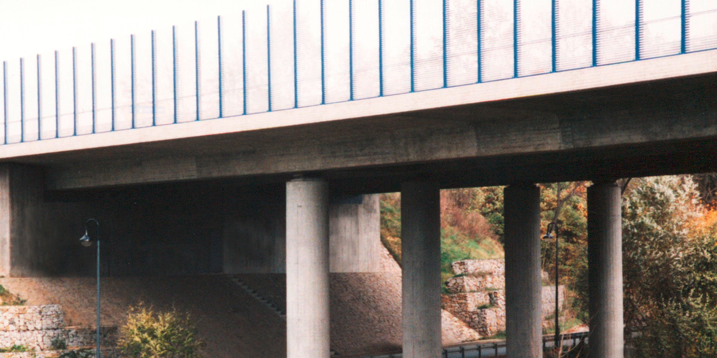 Längs vorgespannter zweistegiger Plattenbalken. Zwei getrennte Überbauten Herstellung in Ortbetonbauweise in 2 Bauabschnitten auf Traggerüst.